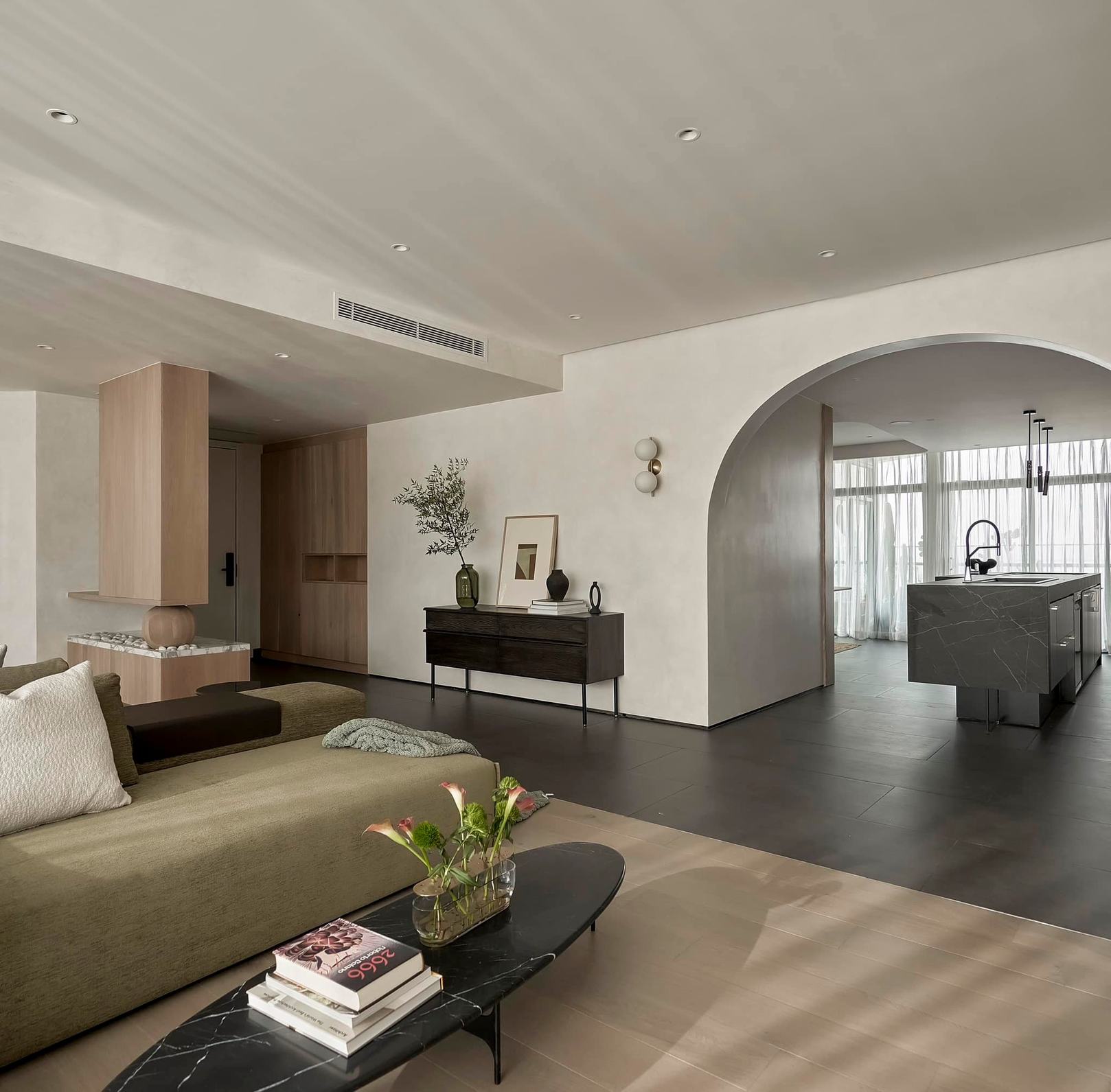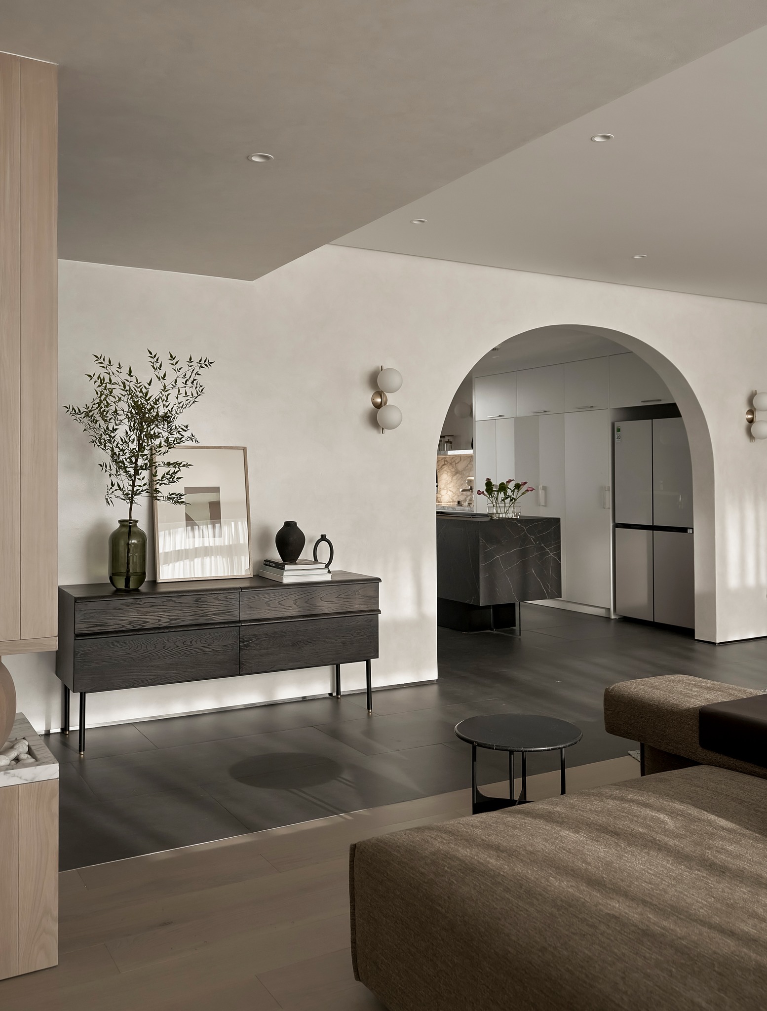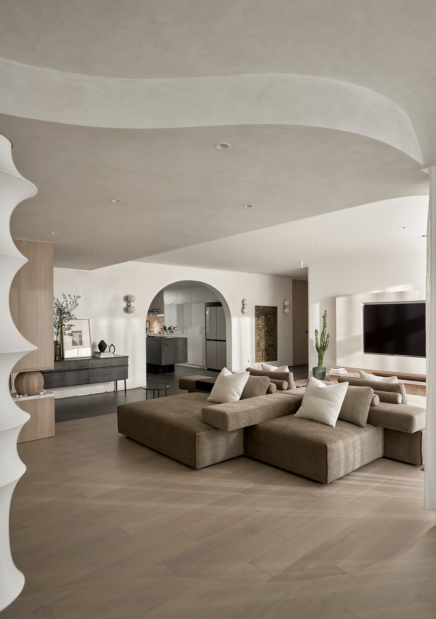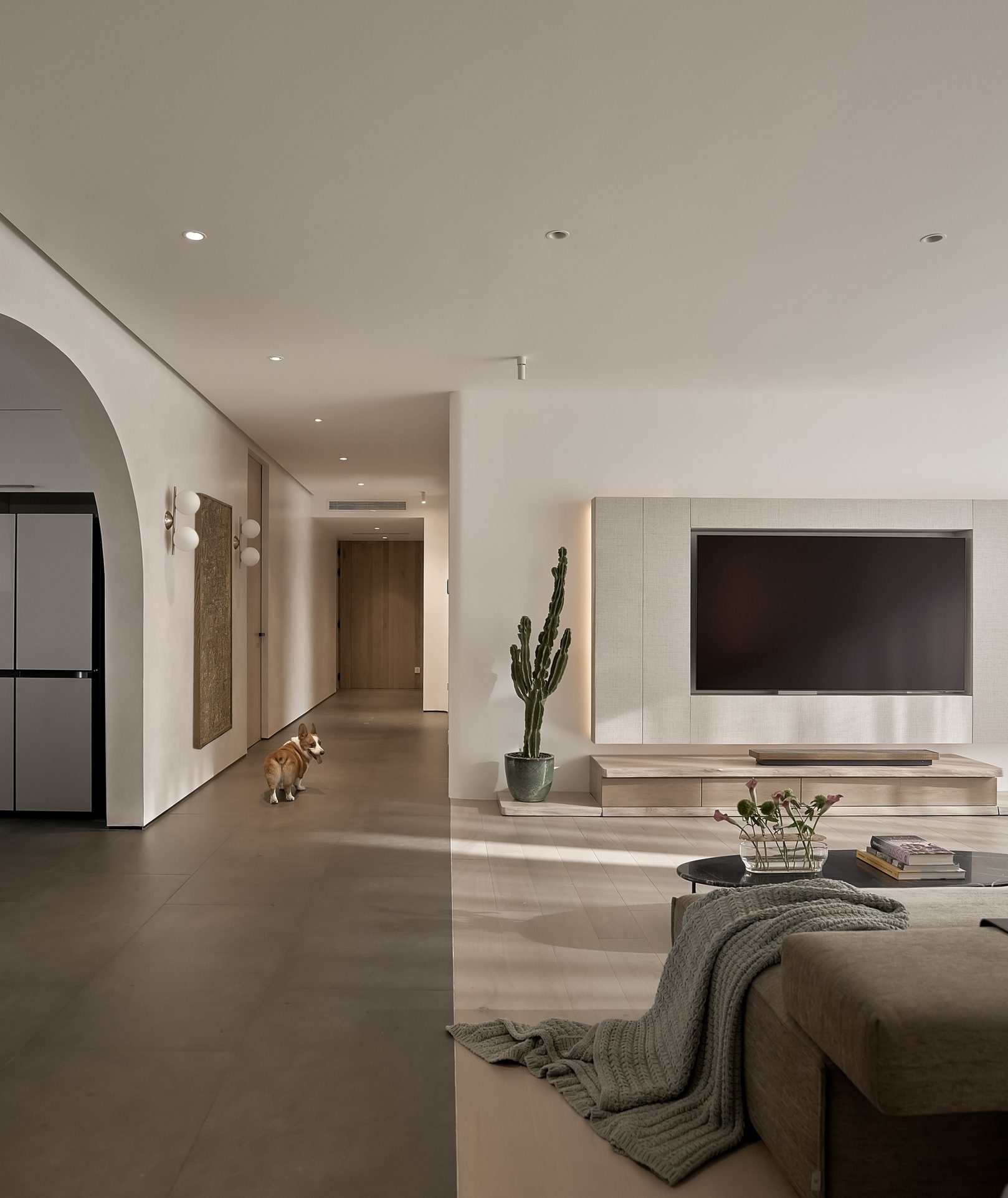 生活有一百种过法,简单而平常才是生活的样子卸下一身的城市繁华,让心灵在家的温暖中徜徉。本案的常住人口是3人,经过沟通,我们很快的锁定了设计思路,将风格定为现代简约风,以全新的格局诠释生活的百般情景,让空间的韵律在均衡与秩序中徐徐展开,在这里,隐秘与开放的并行,丰富了生活体验。还在精装原有硬装基础上进行整改优化,配色上融入原木,大理石等元素,构建一个内敛沉静的居室,最终改造后呈现这个家,自带时间洗礼的韵味和故事感,别有一番风味。考虑到屋主的睡眠质量,生活日常等,通过对格局二次布局规划,重组的方式,使空间功能增加,动静进行分区,将原本的现代原木风格在视觉上变得更加温馨。 户型图 1.入户玄关增加收纳柜,保证屋主进出门空间的储物需求。 2.双卫设计满足多口之家日常所需,贴合屋主日常所需每一寸角落都高效利用。 3.休闲室是邻窗的开放式空间,与客厅巧妙联动。 玄关 入户处是一个开放式的玄关空间,无过多的元素堆砌,以原木+白为主色调,温和静谧之中,又不乏高级之美。靠着墙的一侧,设计了顶天立地的玄关柜,内含充足的储物空间,凸显实用性的同时与浅木纹理的外观质感相匹配。左侧的部分则同样选择木饰面材质,强调从入户材质一直延申到室内区域的过渡空间的整体感。 #玄关#玄关柜#绿植 客厅 顺着玄关来到客厅的位置,整个面积十分充裕开阔,直通透明敞亮的落地窗,视野极佳。地面上通铺着温润自然的原木地板,与过道做出区分,简约好打理。墙面则选择白色粉刷,加上中间区域无吊顶的设计,拉高纵向层高视野,使空间呈现清爽又开阔的美感。 #客厅#地板#极简风 视线移步于开放会客厅,组合式的绿色模块沙发,塑造出松弛且灵活自如的场景秩序。它作为整个空间的交互核心和灵魂,打破传统的沙发摆放形式,以“岛屿”的形式呈现,弱化客厅的存在,将客厅作为一个可成长的空间。再放置一张椭圆形的茶几,足以满足屋主休闲于待客的需要,简约好打理。 #客厅#沙发#茶几 客厅无主灯的设计将光源隐藏在天花板与墙壁中,以间接照明的方式营造出柔和,均匀的灯光照明,使得整个空间看起来更加统一,整洁。沙发对面设计的是电视墙的区域,我们在原有墙面的基础上局部叠加了一块长方形的面板,电视机内嵌其中,增添墙面层次感。下方则是设计了一个原木的地柜提供物品收纳的空间。 #客厅#电视柜#简约风#无主灯 休闲区 顺着客厅向后侧望去,是一个开放式的休闲区域。这里的空间与客厅共同享有优质采光条件,设计赋予住宅温柔的奶油色调,抬高地台与地板覆盖着温润的木质,光影下,自然的纹理质感与暖白色形成呼应,邻窗再放置两张同色系的布艺沙发躺椅,让整个空间更有温度。右侧靠着墙放置了一盏落地灯,营造出舒适休闲的阅读娱乐放松区,满足屋主精神充电的需求。 #休闲区#地台#落地灯 餐厅 在餐厅,家人与朋友的欢声笑语交织成最动听的旋律,共享美食的同时,也共享着那份亲密无间的温馨时光。一张长方形的原木餐桌放置在中央,这类款式的实用性极强,四周都可以摆放原木餐椅,容量充足,更符合多人用餐的需求。在里侧沿着墙壁打造了一个黑色系的餐边柜,上有留白下有空间可随意放置收纳物品,增加收纳的空间。 #餐厅#餐桌#餐椅 餐桌上方安置了一个悬挂式的吊灯,管状的造型充满现代时尚风味。原木饰面为装饰提供温润自然的背景板,整体更加美观协调。而餐厨一体化的设计拓宽了空间视野,并以原木色调贯彻始终。木质家具散发着自然韵味,其细腻纹理勾画出静谧而高雅的用餐环境。 #餐厅#餐桌#吊灯#原木 厨房 厨房紧挨着餐厅,开放式的设计能让区域间相连更加紧密。一字型的操作动线,定制的白色橱柜与全屋的风格相一致,与大理石的混搭更显风格的沉稳感。还定制橱柜将空间充分利用起来,邻窗的橱柜恰好容纳电器,上下的空间加强厨房的收纳空间。而外侧的岛台,经典实用,保证公区的清爽整洁。 #厨房#岛台#开放式厨房 厨房岛台与客厅相邻,共享落地窗的优质采光,无论是从客厅望向餐厅,还是从餐厅望向厨房,都是非常和谐的空间感受,在这里用餐,喝咖啡,聊天互动都成为一种享受和幸福。整体搭配依然延续客厅主色调。长方形的岛台采用大理石的材质,利于日常的烹饪与清洁工作。 #厨房#岛台 过道 站在过道看过去的尽头是玄关,走廊两边一边是客厅一边是餐厨区。白色配色构成极简气息十足的过道,地面铺设深灰色瓷砖,串联玄关与餐厨区域提升空间互动感。沿着过道平铺的筒灯则为过道蒙上微黄的灯光,步步生莲熠熠生辉。 #过道#筒灯#动线 客厅无主灯设计让空间瞬间显大一倍,大平层开阔的感觉更为突出。走廊采用柔光地砖无形中与客厅形成视觉分割,空间整体井然有序,展现出家的温馨之意。 #过道#地砖#绿植 卧室 卧室在温馨氛围中彼此衔接,缔造着未来可期的日常生活往事。一张舒适的双人床靠墙放置在卧室的中央,床头的墙面选择带有纹理的浅棕色,增添墙面层次感。搭配现代感床头柜,用造型给空间以趣味感,上方还悬挂着一个可移动式的床头灯。而顶部墙面转角的圆润造型更加凸显本案的温柔感。 #主卧#卧室#床头柜#壁灯 电视悬挂在与床相对的墙面上,下方设计一个悬浮式电视柜,丰富屋主在卧室的娱乐互动。地面上通铺着原木地板,顺着向前的方向,便是封闭