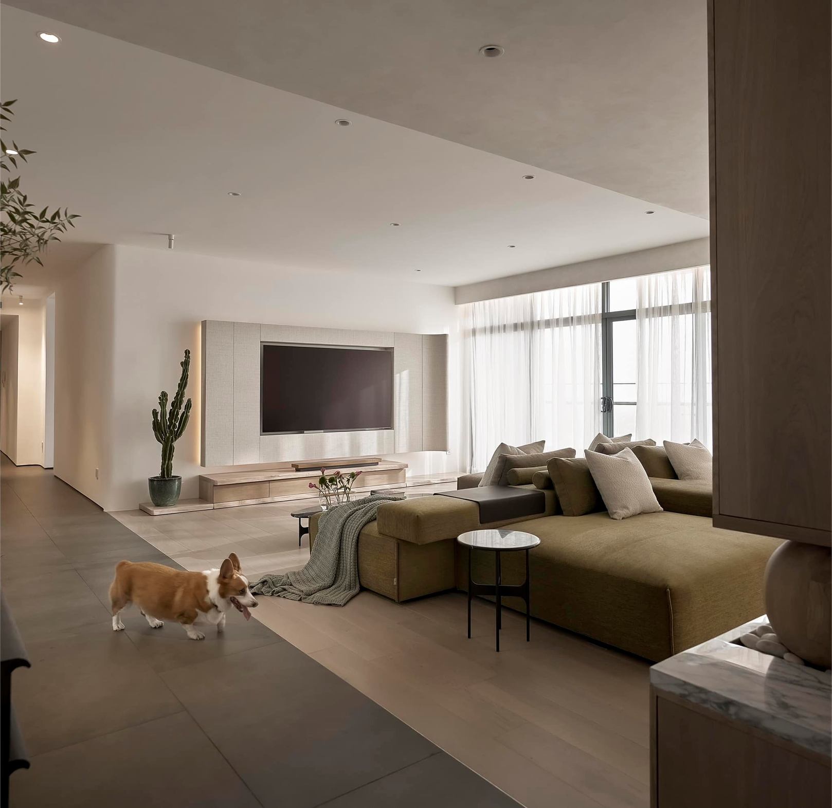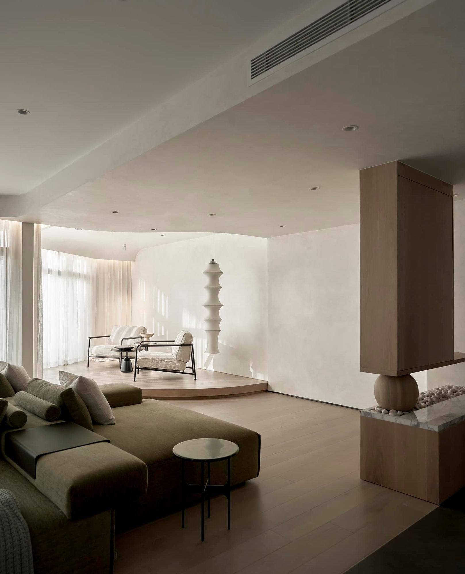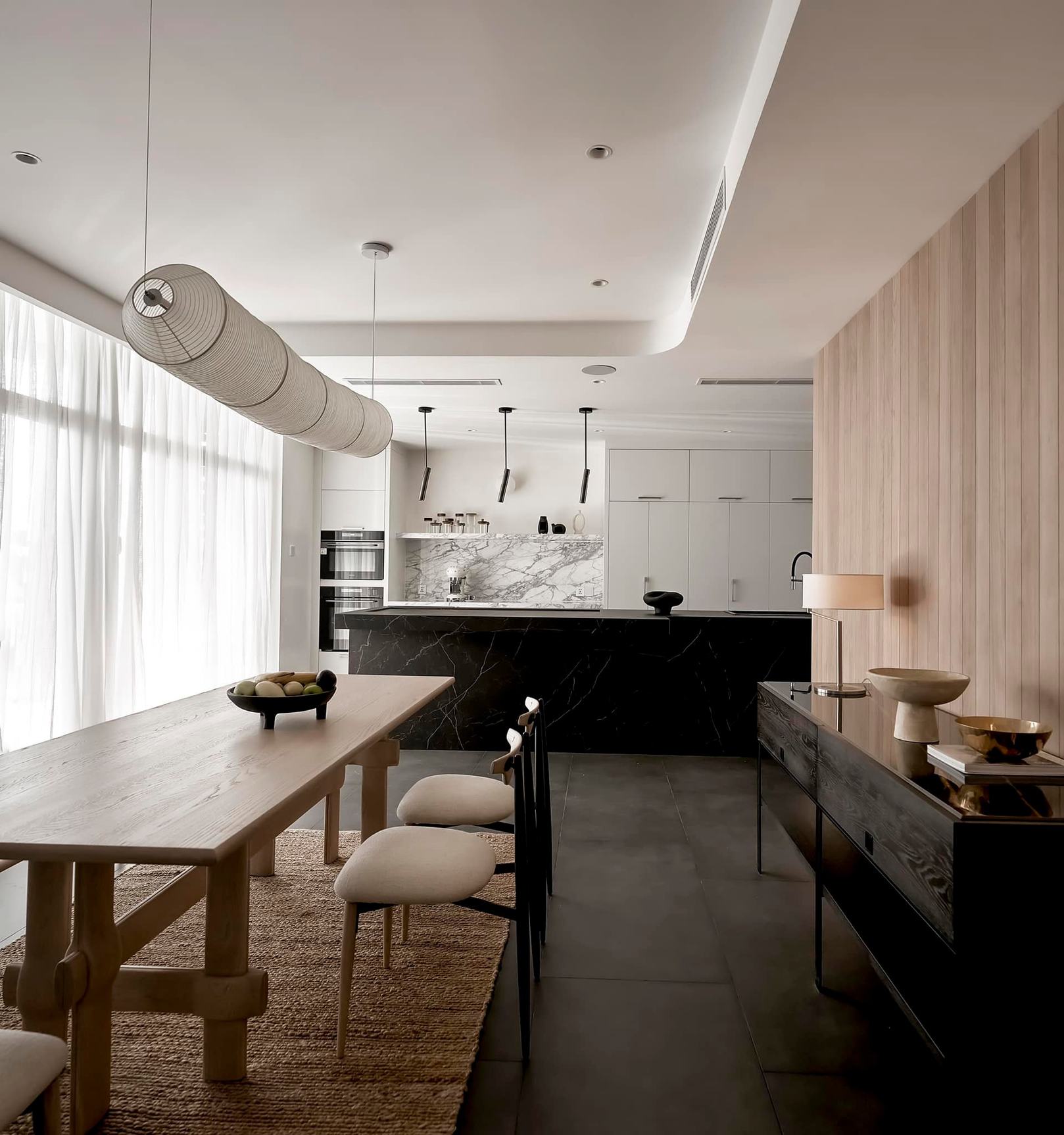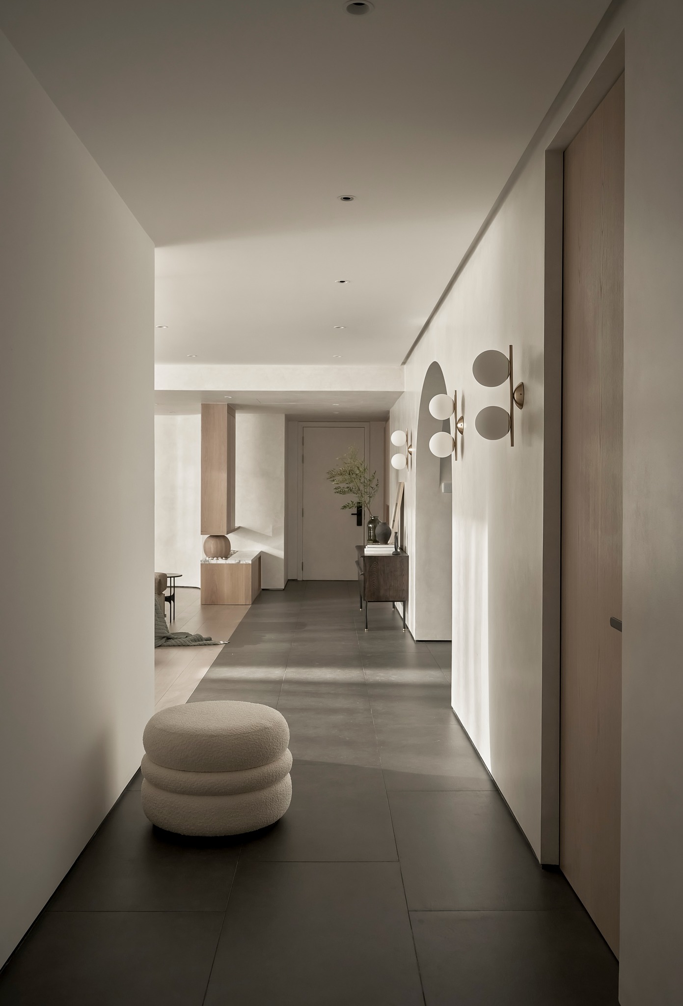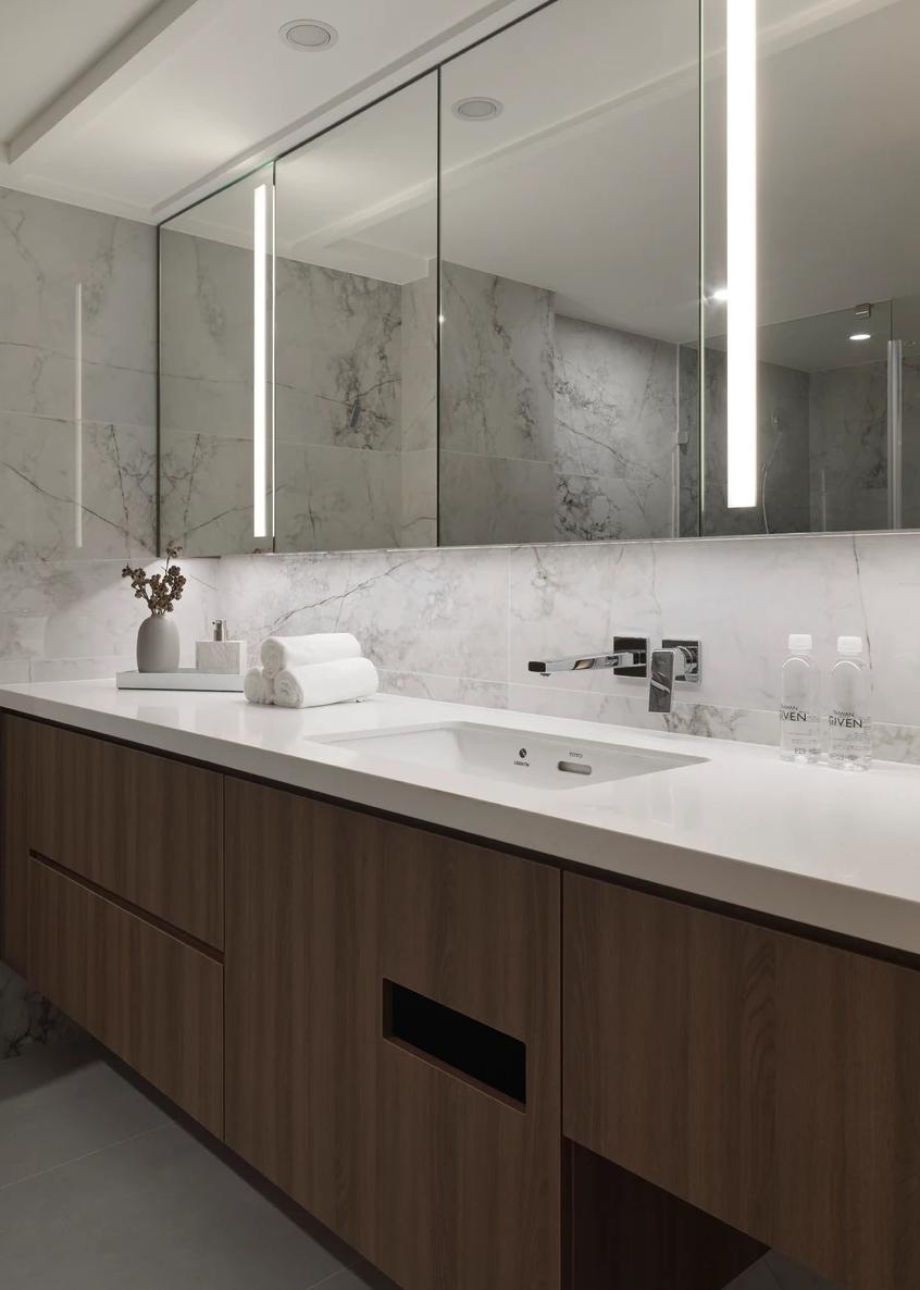 生活有一百种过法,简单而平常才是生活的样子卸下一身的城市繁华,让心灵在家的温暖中徜徉。本案的常住人口是3人,经过沟通,我们很快的锁定了设计思路,将风格定为现代简约风,以全新的格局诠释生活的百般情景,让空间的韵律在均衡与秩序中徐徐展开,在这里,隐秘与开放的并行,丰富了生活体验。还在精装原有硬装基础上进行整改优化,配色上融入原木,大理石等元素,构建一个内敛沉静的居室,最终改造后呈现这个家,自带时间洗礼的韵味和故事感,别有一番风味。考虑到屋主的睡眠质量,生活日常等,通过对格局二次布局规划,重组的方式,使空间功能增加,动静进行分区,将原本的现代原木风格在视觉上变得更加温馨。 户型图 1.入户玄关增加收纳柜,保证屋主进出门空间的储物需求。 2.双卫设计满足多口之家日常所需,贴合屋主日常所需每一寸角落都高效利用。 3.休闲室是邻窗的开放式空间,与客厅巧妙联动。 玄关 入户处是一个开放式的玄关空间,无过多的元素堆砌,以原木+白为主色调,温和静谧之中,又不乏高级之美。靠着墙的一侧,设计了顶天立地的玄关柜,内含充足的储物空间,凸显实用性的同时与浅木纹理的外观质感相匹配。左侧的部分则同样选择木饰面材质,强调从入户材质一直延申到室内区域的过渡空间的整体感。 #玄关#玄关柜#绿植 客厅 顺着玄关来到客厅的位置,整个面积十分充裕开阔,直通透明敞亮的落地窗,视野极佳。地面上通铺着温润自然的原木地板,与过道做出区分,简约好打理。墙面则选择白色粉刷,加上中间区域无吊顶的设计,拉高纵向层高视野,使空间呈现清爽又开阔的美感。 #客厅#地板#极简风 视线移步于开放会客厅,组合式的绿色模块沙发,塑造出松弛且灵活自如的场景秩序。它作为整个空间的交互核心和灵魂,打破传统的沙发摆放形式,以“岛屿”的形式呈现,弱化客厅的存在,将客厅作为一个可成长的空间。再放置一张椭圆形的茶几,足以满足屋主休闲于待客的需要,简约好打理。 #客厅#沙发#茶几 客厅无主灯的设计将光源隐藏在天花板与墙壁中,以间接照明的方式营造出柔和,均匀的灯光照明,使得整个空间看起来更加统一,整洁。沙发对面设计的是电视墙的区域,我们在原有墙面的基础上局部叠加了一块长方形的面板,电视机内嵌其中,增添墙面层次感。下方则是设计了一个原木的地柜提供物品收纳的空间。 #客厅#电视柜#简约风#无主灯 休闲区 顺着客厅向后侧望去,是一个开放式的休闲区域。这里的空间与客厅共同享有优质采光条件,设计赋予住宅温柔的奶油色调,抬高地台与地板覆盖着温润的木质,光影下,自然的纹理质感与暖白色形成呼应,邻窗再放置两张同色系的布艺沙发躺椅,让整个空间更有温度。右侧靠着墙放置了一盏落地灯,营造出舒适休闲的阅读娱乐放松区,满足屋主精神充电的需求。 #休闲区#地台#落地灯 餐厅 在餐厅,家人与朋友的欢声笑语交织成最动听的旋律,共享美食的同时,也共享着那份亲密无间的温馨时光。一张长方形的原木餐桌放置在中央,这类款式的实用性极强,四周都可以摆放原木餐椅,容量充足,更符合多人用餐的需求。在里侧沿着墙壁打造了一个黑色系的餐边柜,上有留白下有空间可随意放置收纳物品,增加收纳的空间。 #餐厅#餐桌#餐椅 餐桌上方安置了一个悬挂式的吊灯,管状的造型充满现代时尚风味。原木饰面为装饰提供温润自然的背景板,整体更加美观协调。而餐厨一体化的设计拓宽了空间视野,并以原木色调贯彻始终。木质家具散发着自然韵味,其细腻纹理勾画出静谧而高雅的用餐环境。 #餐厅#餐桌#吊灯#原木 厨房 厨房紧挨着餐厅,开放式的设计能让区域间相连更加紧密。一字型的操作动线,定制的白色橱柜与全屋的风格相一致,与大理石的混搭更显风格的沉稳感。还定制橱柜将空间充分利用起来,邻窗的橱柜恰好容纳电器,上下的空间加强厨房的收纳空间。而外侧的岛台,经典实用,保证公区的清爽整洁。 #厨房#岛台#开放式厨房 厨房岛台与客厅相邻,共享落地窗的优质采光,无论是从客厅望向餐厅,还是从餐厅望向厨房,都是非常和谐的空间感受,在这里用餐,喝咖啡,聊天互动都成为一种享受和幸福。整体搭配依然延续客厅主色调。长方形的岛台采用大理石的材质,利于日常的烹饪与清洁工作。 #厨房#岛台 过道 站在过道看过去的尽头是玄关,走廊两边一边是客厅一边是餐厨区。白色配色构成极简气息十足的过道,地面铺设深灰色瓷砖,串联玄关与餐厨区域提升空间互动感。沿着过道平铺的筒灯则为过道蒙上微黄的灯光,步步生莲熠熠生辉。 #过道#筒灯#动线 客厅无主灯设计让空间瞬间显大一倍,大平层开阔的感觉更为突出。走廊采用柔光地砖无形中与客厅形成视觉分割,空间整体井然有序,展现出家的温馨之意。 #过道#地砖#绿植 卧室 卧室在温馨氛围中彼此衔接,缔造着未来可期的日常生活往事。一张舒适的双人床靠墙放置在卧室的中央,床头的墙面选择带有纹理的浅棕色,增添墙面层次感。搭配现代感床头柜,用造型给空间以趣味感,上方还悬挂着一个可移动式的床头灯。而顶部墙面转角的圆润造型更加凸显本案的温柔感。 #主卧#卧室#床头柜#壁灯 电视悬挂在与床相对的墙面上,下方设计一个悬浮式电视柜,丰富屋主在卧室的娱乐互动。地面上通铺着原木地板,顺着向前的方向,便是封闭