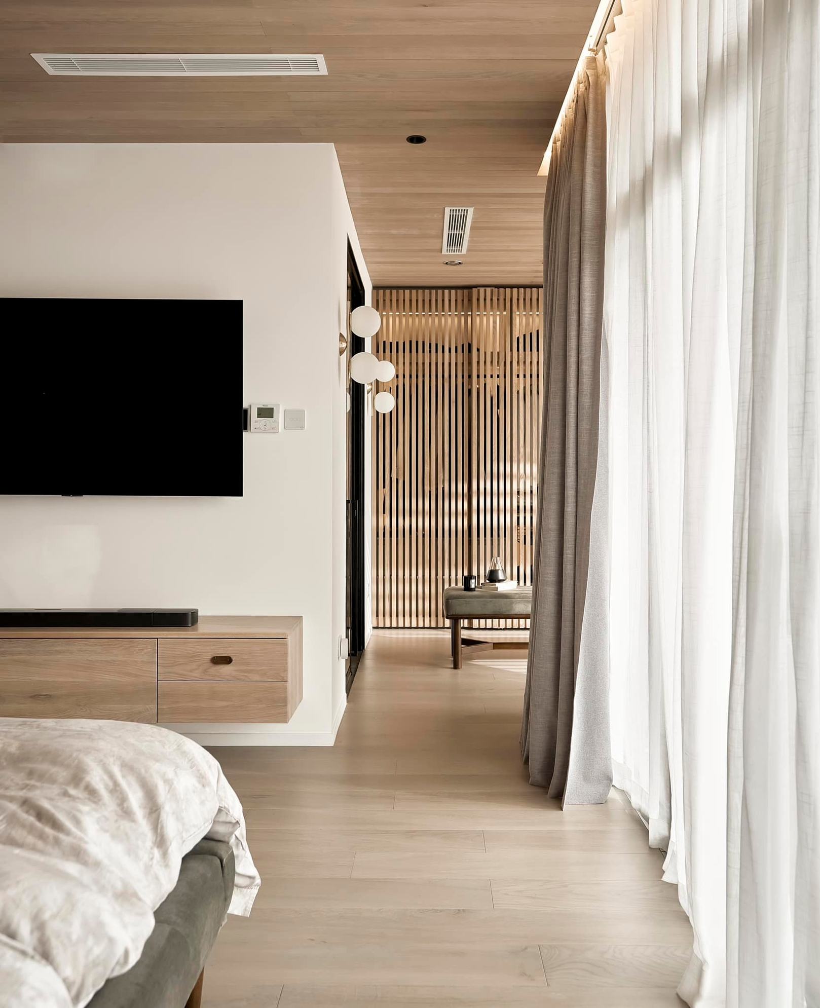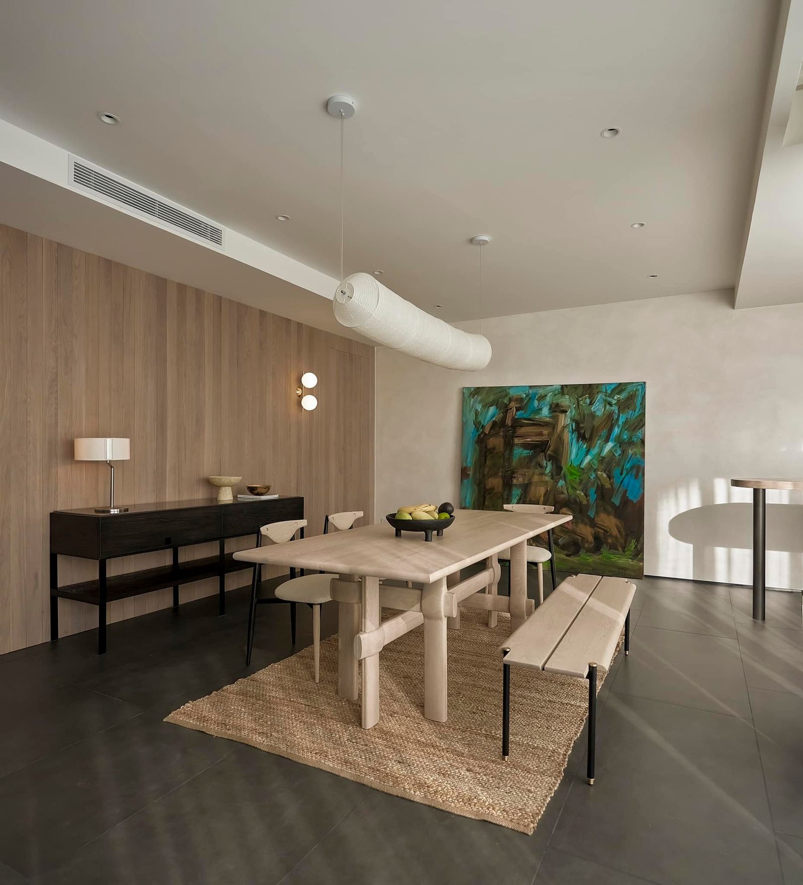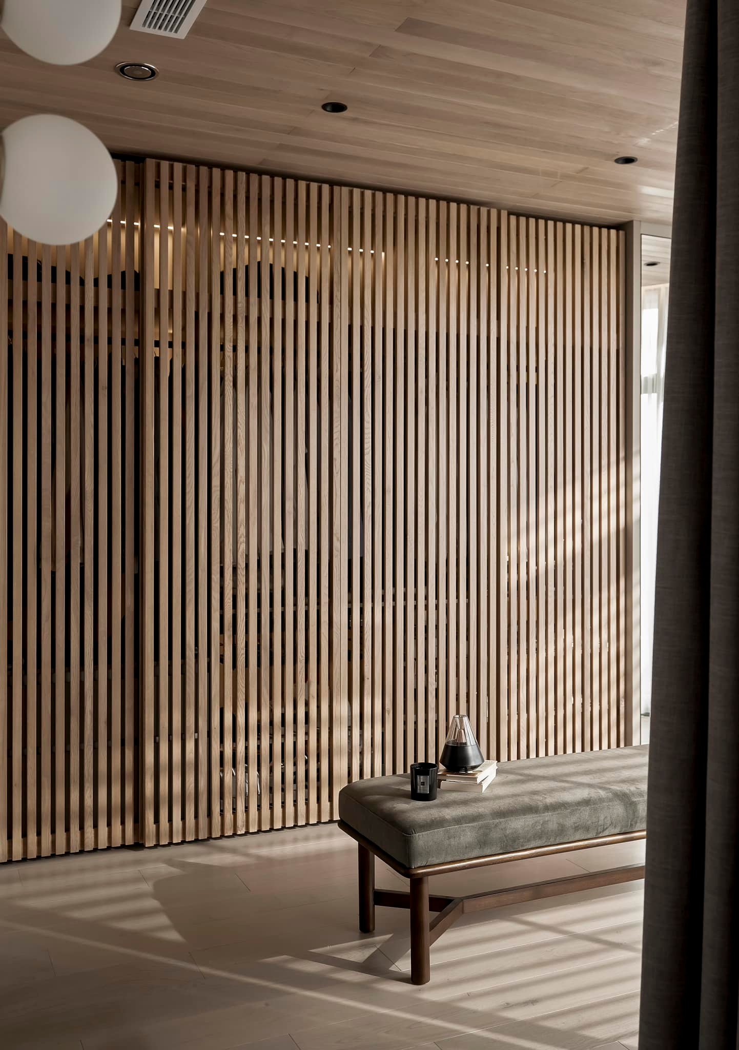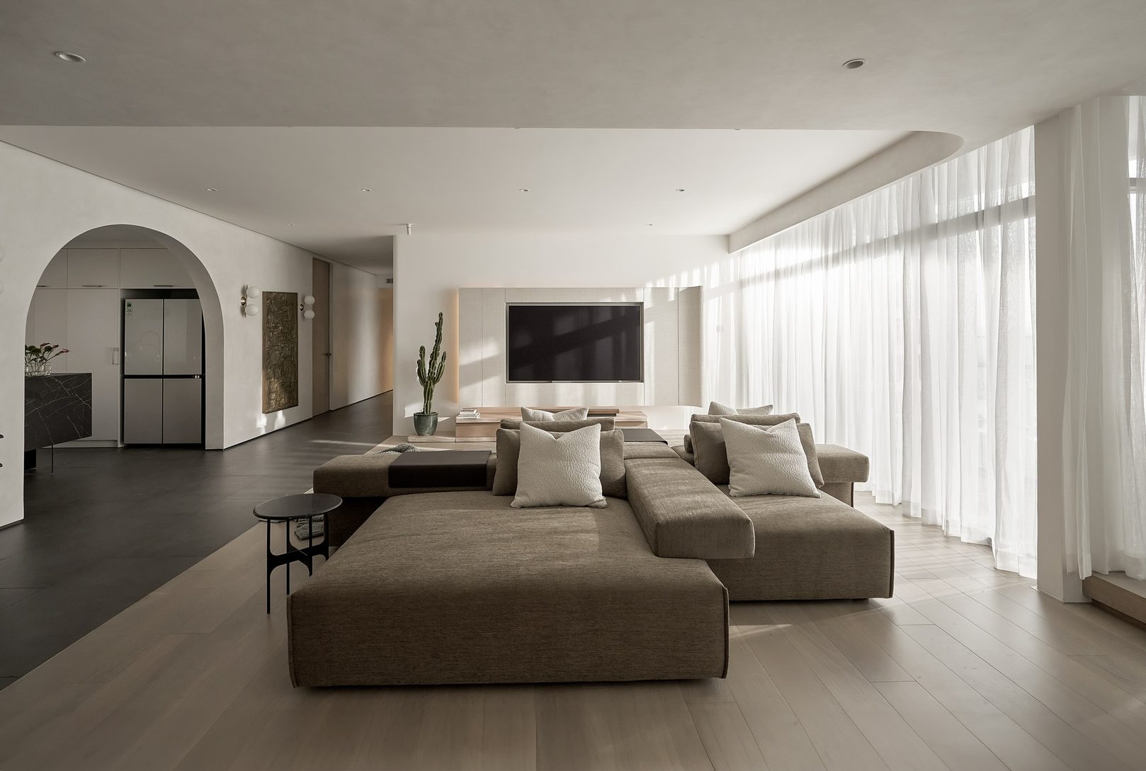生活有一百种过法,简单而平常才是生活的样子卸下一身的城市繁华,让心灵在家的温暖中徜徉。本案的常住人口是3人,经过沟通,我们很快的锁定了设计思路,将风格定为现代简约风,以全新的格局诠释生活的百般情景,让空间的韵律在均衡与秩序中徐徐展开,在这里,隐秘与开放的并行,丰富了生活体验。还在精装原有硬装基础上进行整改优化,配色上融入原木,大理石等元素,构建一个内敛沉静的居室,最终改造后呈现这个家,自带时间洗礼的韵味和故事感,别有一番风味。考虑到屋主的睡眠质量,生活日常等,通过对格局二次布局规划,重组的方式,使空间功能增加,动静进行分区,将原本的现代原木风格在视觉上变得更加温馨。 户型图 1.入户玄关增加收纳柜,保证屋主进出门空间的储物需求。 2.双卫设计满足多口之家日常所需,贴合屋主日常所需每一寸角落都高效利用。 3.休闲室是邻窗的开放式空间,与客厅巧妙联动。 玄关 入户处是一个开放式的玄关空间,无过多的元素堆砌,以原木+白为主色调,温和静谧之中,又不乏高级之美。靠着墙的一侧,设计了顶天立地的玄关柜,内含充足的储物空间,凸显实用性的同时与浅木纹理的外观质感相匹配。左侧的部分则同样选择木饰面材质,强调从入户材质一直延申到室内区域的过渡空间的整体感。 #玄关#玄关柜#绿植 客厅 顺着玄关来到客厅的位置,整个面积十分充裕开阔,直通透明敞亮的落地窗,视野极佳。地面上通铺着温润自然的原木地板,与过道做出区分,简约好打理。墙面则选择白色粉刷,加上中间区域无吊顶的设计,拉高纵向层高视野,使空间呈现清爽又开阔的美感。 #客厅#地板#极简风 视线移步于开放会客厅,组合式的绿色模块沙发,塑造出松弛且灵活自如的场景秩序。它作为整个空间的交互核心和灵魂,打破传统的沙发摆放形式,以“岛屿”的形式呈现,弱化客厅的存在,将客厅作为一个可成长的空间。再放置一张椭圆形的茶几,足以满足屋主休闲于待客的需要,简约好打理。 #客厅#沙发#茶几 客厅无主灯的设计将光源隐藏在天花板与墙壁中,以间接照明的方式营造出柔和,均匀的灯光照明,使得整个空间看起来更加统一,整洁。沙发对面设计的是电视墙的区域,我们在原有墙面的基础上局部叠加了一块长方形的面板,电视机内嵌其中,增添墙面层次感。下方则是设计了一个原木的地柜提供物品收纳的空间。 #客厅#电视柜#简约风#无主灯 休闲区 顺着客厅向后侧望去,是一个开放式的休闲区域。这里的空间与客厅共同享有优质采光条件,设计赋予住宅温柔的奶油色调,抬高地台与地板覆盖着温润的木质,光影下,自然的纹理质感与暖白色形成呼应,邻窗再放置两张同色系的布艺沙发躺椅,让整个空间更有温度。右侧靠着墙放置了一盏落地灯,营造出舒适休闲的阅读娱乐放松区,满足屋主精神充电的需求。 #休闲区#地台#落地灯 餐厅 在餐厅,家人与朋友的欢声笑语交织成最动听的旋律,共享美食的同时,也共享着那份亲密无间的温馨时光。一张长方形的原木餐桌放置在中央,这类款式的实用性极强,四周都可以摆放原木餐椅,容量充足,更符合多人用餐的需求。在里侧沿着墙壁打造了一个黑色系的餐边柜,上有留白下有空间可随意放置收纳物品,增加收纳的空间。 #餐厅#餐桌#餐椅 餐桌上方安置了一个悬挂式的吊灯,管状的造型充满现代时尚风味。原木饰面为装饰提供温润自然的背景板,整体更加美观协调。而餐厨一体化的设计拓宽了空间视野,并以原木色调贯彻始终。木质家具散发着自然韵味,其细腻纹理勾画出静谧而高雅的用餐环境。 #餐厅#餐桌#吊灯#原木 厨房 厨房紧挨着餐厅,开放式的设计能让区域间相连更加紧密。一字型的操作动线,定制的白色橱柜与全屋的风格相一致,与大理石的混搭更显风格的沉稳感。还定制橱柜将空间充分利用起来,邻窗的橱柜恰好容纳电器,上下的空间加强厨房的收纳空间。而外侧的岛台,经典实用,保证公区的清爽整洁。 #厨房#岛台#开放式厨房 厨房岛台与客厅相邻,共享落地窗的优质采光,无论是从客厅望向餐厅,还是从餐厅望向厨房,都是非常和谐的空间感受,在这里用餐,喝咖啡,聊天互动都成为一种享受和幸福。整体搭配依然延续客厅主色调。长方形的岛台采用大理石的材质,利于日常的烹饪与清洁工作。 #厨房#岛台 过道 站在过道看过去的尽头是玄关,走廊两边一边是客厅一边是餐厨区。白色配色构成极简气息十足的过道,地面铺设深灰色瓷砖,串联玄关与餐厨区域提升空间互动感。沿着过道平铺的筒灯则为过道蒙上微黄的灯光,步步生莲熠熠生辉。 #过道#筒灯#动线 客厅无主灯设计让空间瞬间显大一倍,大平层开阔的感觉更为突出。走廊采用柔光地砖无形中与客厅形成视觉分割,空间整体井然有序,展现出家的温馨之意。 #过道#地砖#绿植 卧室 卧室在温馨氛围中彼此衔接,缔造着未来可期的日常生活往事。一张舒适的双人床靠墙放置在卧室的中央,床头的墙面选择带有纹理的浅棕色,增添墙面层次感。搭配现代感床头柜,用造型给空间以趣味感,上方还悬挂着一个可移动式的床头灯。而顶部墙面转角的圆润造型更加凸显本案的温柔感。 #主卧#卧室#床头柜#壁灯 电视悬挂在与床相对的墙面上,下方设计一个悬浮式电视柜,丰富屋主在卧室的娱乐互动。地面上通铺着原木地板,顺着向前的方向,便是封闭