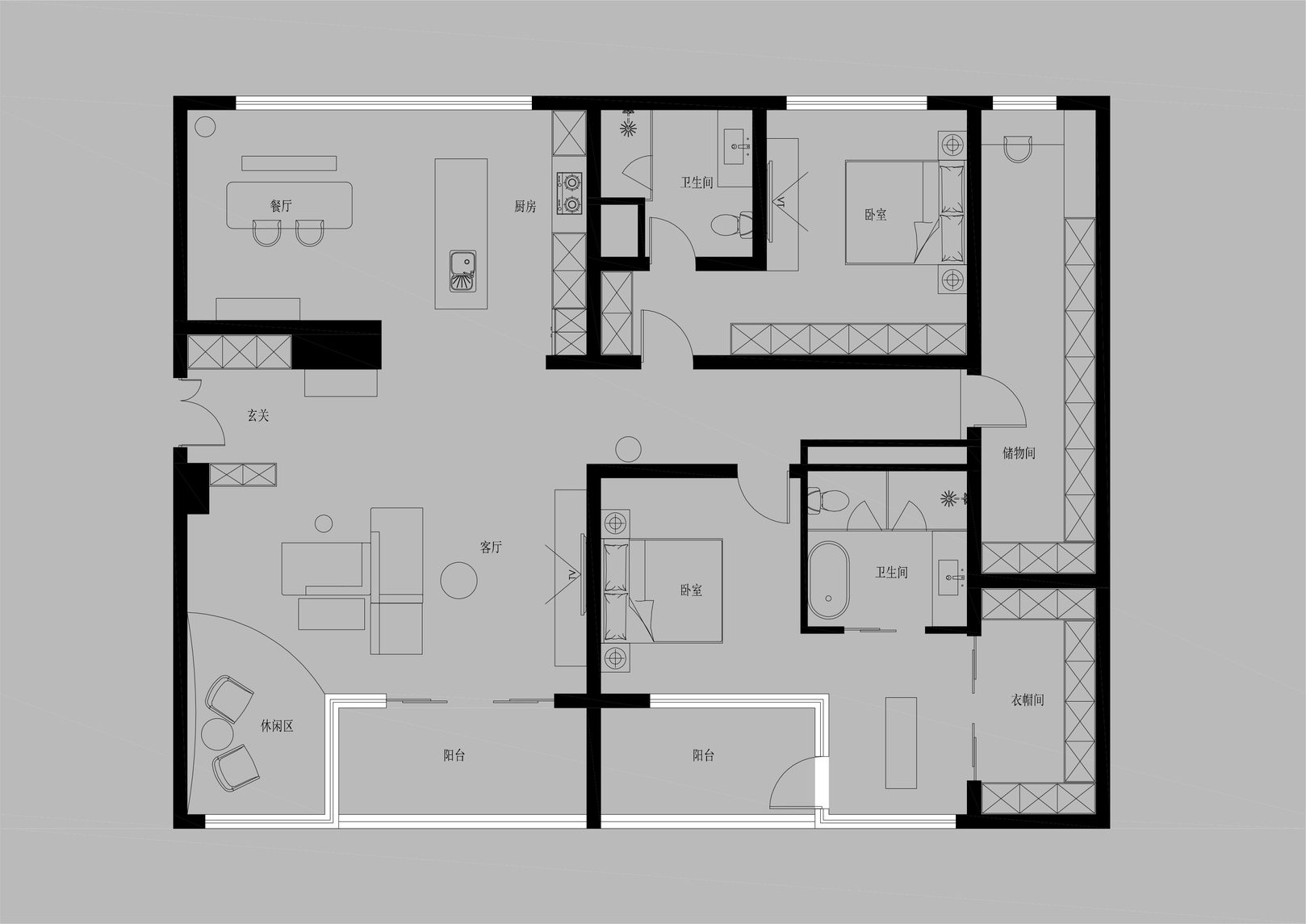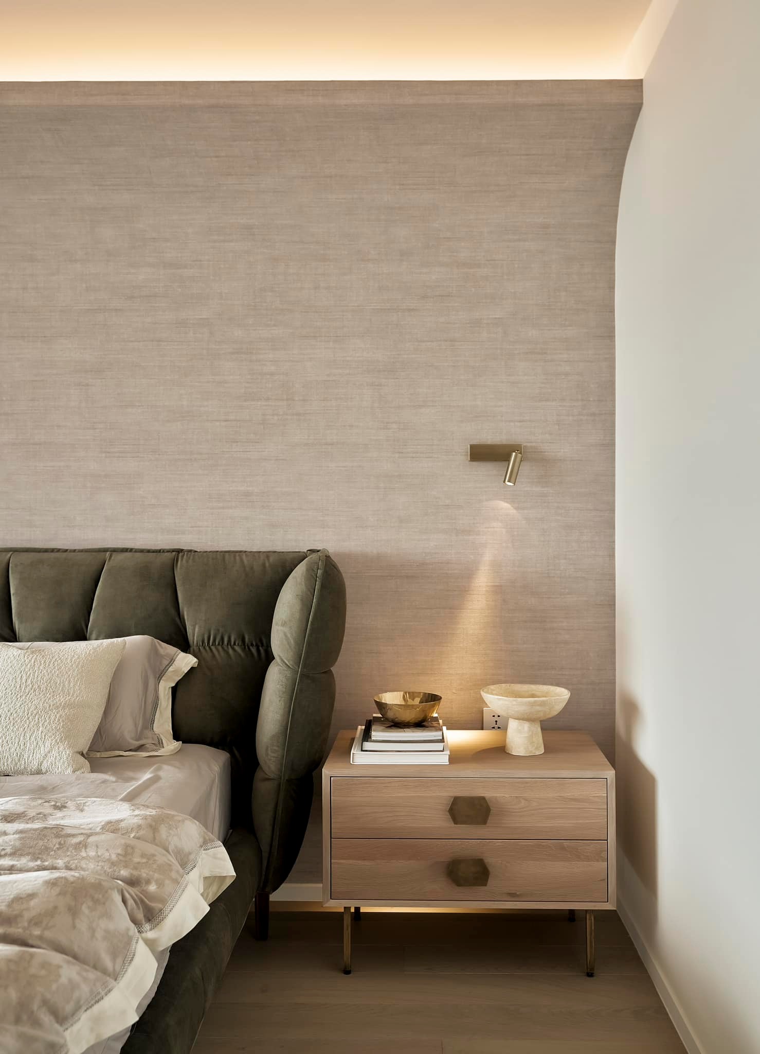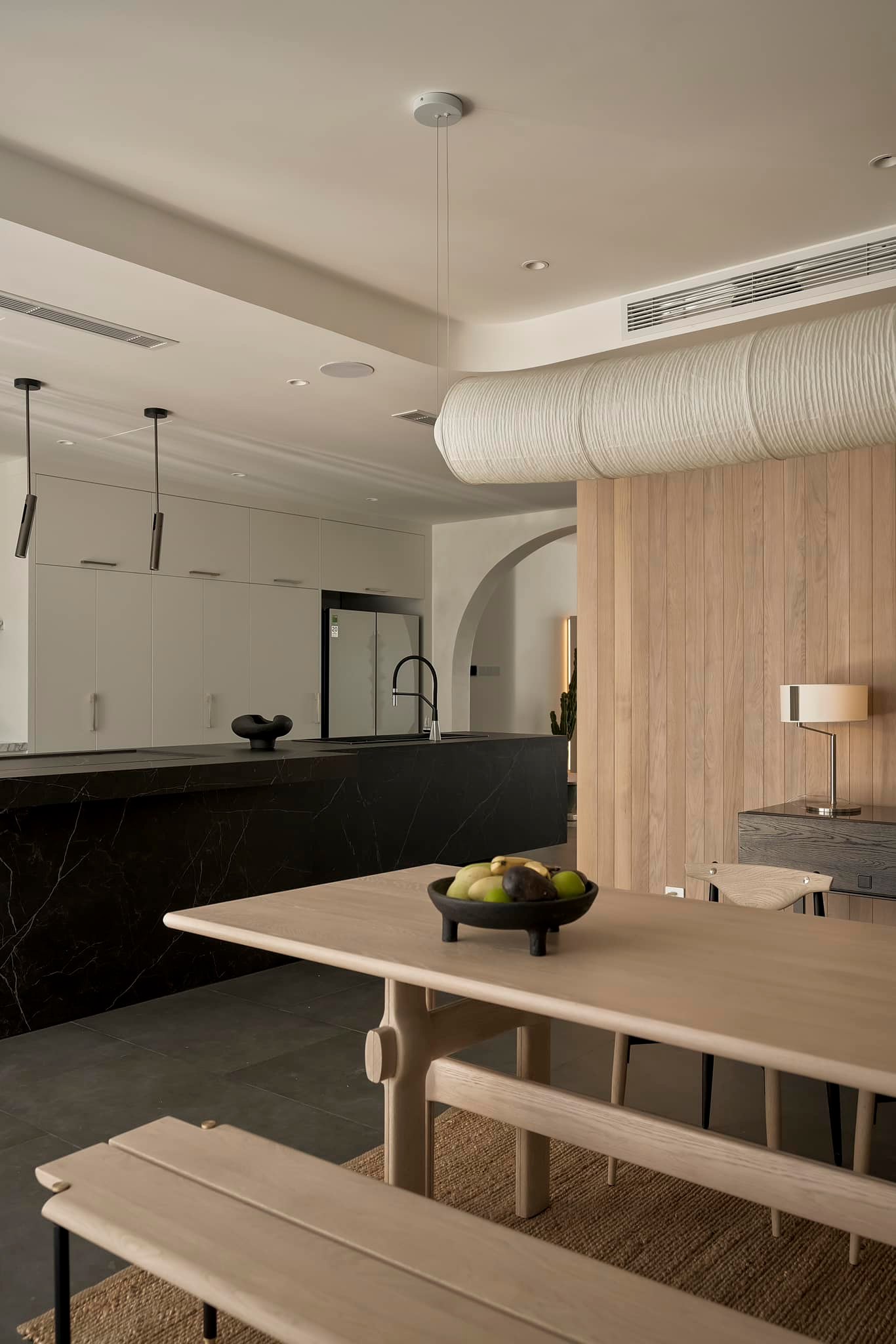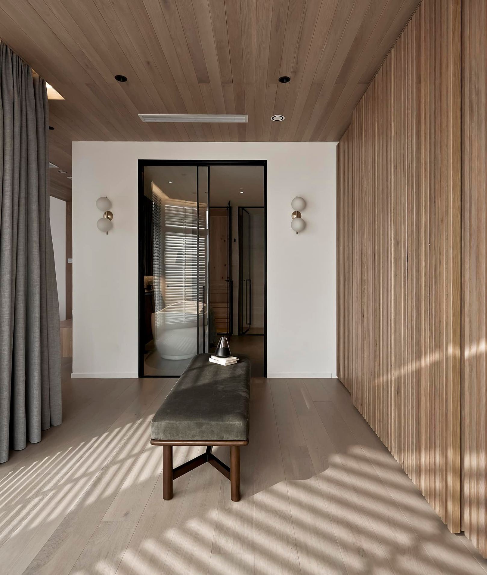 生活有一百种过法,简单而平常才是生活的样子卸下一身的城市繁华,让心灵在家的温暖中徜徉。本案的常住人口是3人,经过沟通,我们很快的锁定了设计思路,将风格定为现代简约风,以全新的格局诠释生活的百般情景,让空间的韵律在均衡与秩序中徐徐展开,在这里,隐秘与开放的并行,丰富了生活体验。还在精装原有硬装基础上进行整改优化,配色上融入原木,大理石等元素,构建一个内敛沉静的居室,最终改造后呈现这个家,自带时间洗礼的韵味和故事感,别有一番风味。考虑到屋主的睡眠质量,生活日常等,通过对格局二次布局规划,重组的方式,使空间功能增加,动静进行分区,将原本的现代原木风格在视觉上变得更加温馨。 户型图 1.入户玄关增加收纳柜,保证屋主进出门空间的储物需求。 2.双卫设计满足多口之家日常所需,贴合屋主日常所需每一寸角落都高效利用。 3.休闲室是邻窗的开放式空间,与客厅巧妙联动。 玄关 入户处是一个开放式的玄关空间,无过多的元素堆砌,以原木+白为主色调,温和静谧之中,又不乏高级之美。靠着墙的一侧,设计了顶天立地的玄关柜,内含充足的储物空间,凸显实用性的同时与浅木纹理的外观质感相匹配。左侧的部分则同样选择木饰面材质,强调从入户材质一直延申到室内区域的过渡空间的整体感。 #玄关#玄关柜#绿植 客厅 顺着玄关来到客厅的位置,整个面积十分充裕开阔,直通透明敞亮的落地窗,视野极佳。地面上通铺着温润自然的原木地板,与过道做出区分,简约好打理。墙面则选择白色粉刷,加上中间区域无吊顶的设计,拉高纵向层高视野,使空间呈现清爽又开阔的美感。 #客厅#地板#极简风 视线移步于开放会客厅,组合式的绿色模块沙发,塑造出松弛且灵活自如的场景秩序。它作为整个空间的交互核心和灵魂,打破传统的沙发摆放形式,以“岛屿”的形式呈现,弱化客厅的存在,将客厅作为一个可成长的空间。再放置一张椭圆形的茶几,足以满足屋主休闲于待客的需要,简约好打理。 #客厅#沙发#茶几 客厅无主灯的设计将光源隐藏在天花板与墙壁中,以间接照明的方式营造出柔和,均匀的灯光照明,使得整个空间看起来更加统一,整洁。沙发对面设计的是电视墙的区域,我们在原有墙面的基础上局部叠加了一块长方形的面板,电视机内嵌其中,增添墙面层次感。下方则是设计了一个原木的地柜提供物品收纳的空间。 #客厅#电视柜#简约风#无主灯 休闲区 顺着客厅向后侧望去,是一个开放式的休闲区域。这里的空间与客厅共同享有优质采光条件,设计赋予住宅温柔的奶油色调,抬高地台与地板覆盖着温润的木质,光影下,自然的纹理质感与暖白色形成呼应,邻窗再放置两张同色系的布艺沙发躺椅,让整个空间更有温度。右侧靠着墙放置了一盏落地灯,营造出舒适休闲的阅读娱乐放松区,满足屋主精神充电的需求。 #休闲区#地台#落地灯 餐厅 在餐厅,家人与朋友的欢声笑语交织成最动听的旋律,共享美食的同时,也共享着那份亲密无间的温馨时光。一张长方形的原木餐桌放置在中央,这类款式的实用性极强,四周都可以摆放原木餐椅,容量充足,更符合多人用餐的需求。在里侧沿着墙壁打造了一个黑色系的餐边柜,上有留白下有空间可随意放置收纳物品,增加收纳的空间。 #餐厅#餐桌#餐椅 餐桌上方安置了一个悬挂式的吊灯,管状的造型充满现代时尚风味。原木饰面为装饰提供温润自然的背景板,整体更加美观协调。而餐厨一体化的设计拓宽了空间视野,并以原木色调贯彻始终。木质家具散发着自然韵味,其细腻纹理勾画出静谧而高雅的用餐环境。 #餐厅#餐桌#吊灯#原木 厨房 厨房紧挨着餐厅,开放式的设计能让区域间相连更加紧密。一字型的操作动线,定制的白色橱柜与全屋的风格相一致,与大理石的混搭更显风格的沉稳感。还定制橱柜将空间充分利用起来,邻窗的橱柜恰好容纳电器,上下的空间加强厨房的收纳空间。而外侧的岛台,经典实用,保证公区的清爽整洁。 #厨房#岛台#开放式厨房 厨房岛台与客厅相邻,共享落地窗的优质采光,无论是从客厅望向餐厅,还是从餐厅望向厨房,都是非常和谐的空间感受,在这里用餐,喝咖啡,聊天互动都成为一种享受和幸福。整体搭配依然延续客厅主色调。长方形的岛台采用大理石的材质,利于日常的烹饪与清洁工作。 #厨房#岛台 过道 站在过道看过去的尽头是玄关,走廊两边一边是客厅一边是餐厨区。白色配色构成极简气息十足的过道,地面铺设深灰色瓷砖,串联玄关与餐厨区域提升空间互动感。沿着过道平铺的筒灯则为过道蒙上微黄的灯光,步步生莲熠熠生辉。 #过道#筒灯#动线 客厅无主灯设计让空间瞬间显大一倍,大平层开阔的感觉更为突出。走廊采用柔光地砖无形中与客厅形成视觉分割,空间整体井然有序,展现出家的温馨之意。 #过道#地砖#绿植 卧室 卧室在温馨氛围中彼此衔接,缔造着未来可期的日常生活往事。一张舒适的双人床靠墙放置在卧室的中央,床头的墙面选择带有纹理的浅棕色,增添墙面层次感。搭配现代感床头柜,用造型给空间以趣味感,上方还悬挂着一个可移动式的床头灯。而顶部墙面转角的圆润造型更加凸显本案的温柔感。 #主卧#卧室#床头柜#壁灯 电视悬挂在与床相对的墙面上,下方设计一个悬浮式电视柜,丰富屋主在卧室的娱乐互动。地面上通铺着原木地板,顺着向前的方向,便是封闭