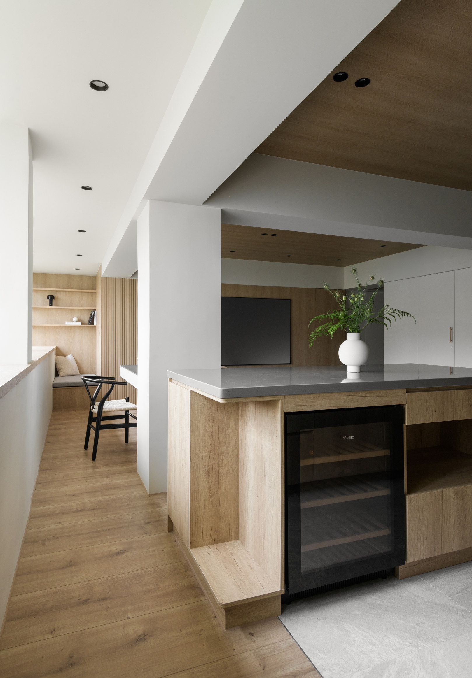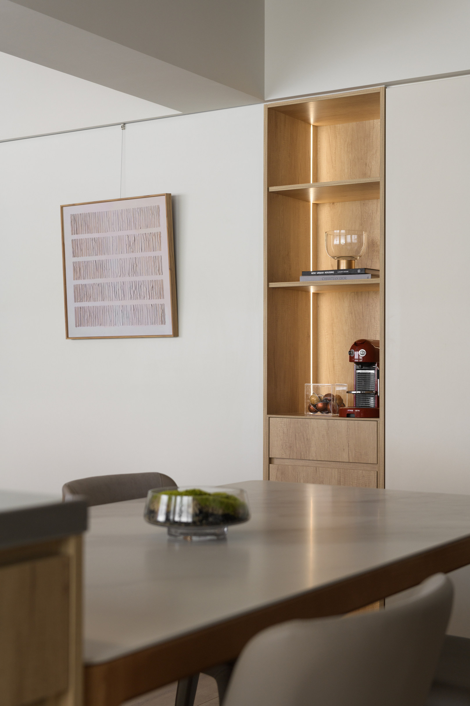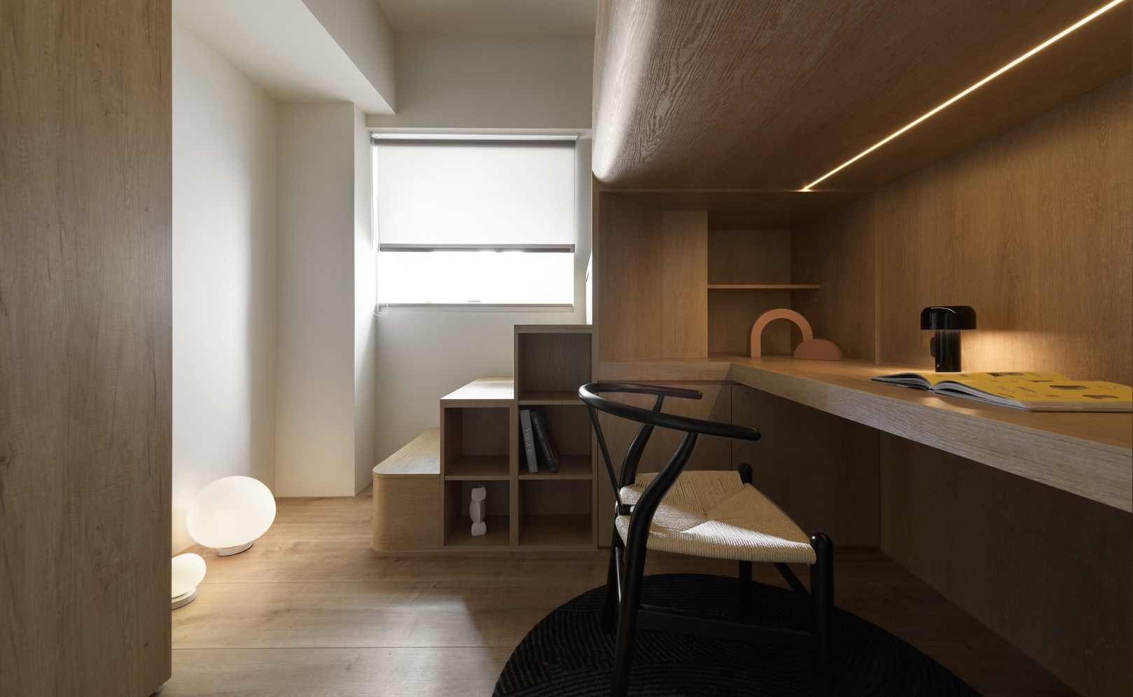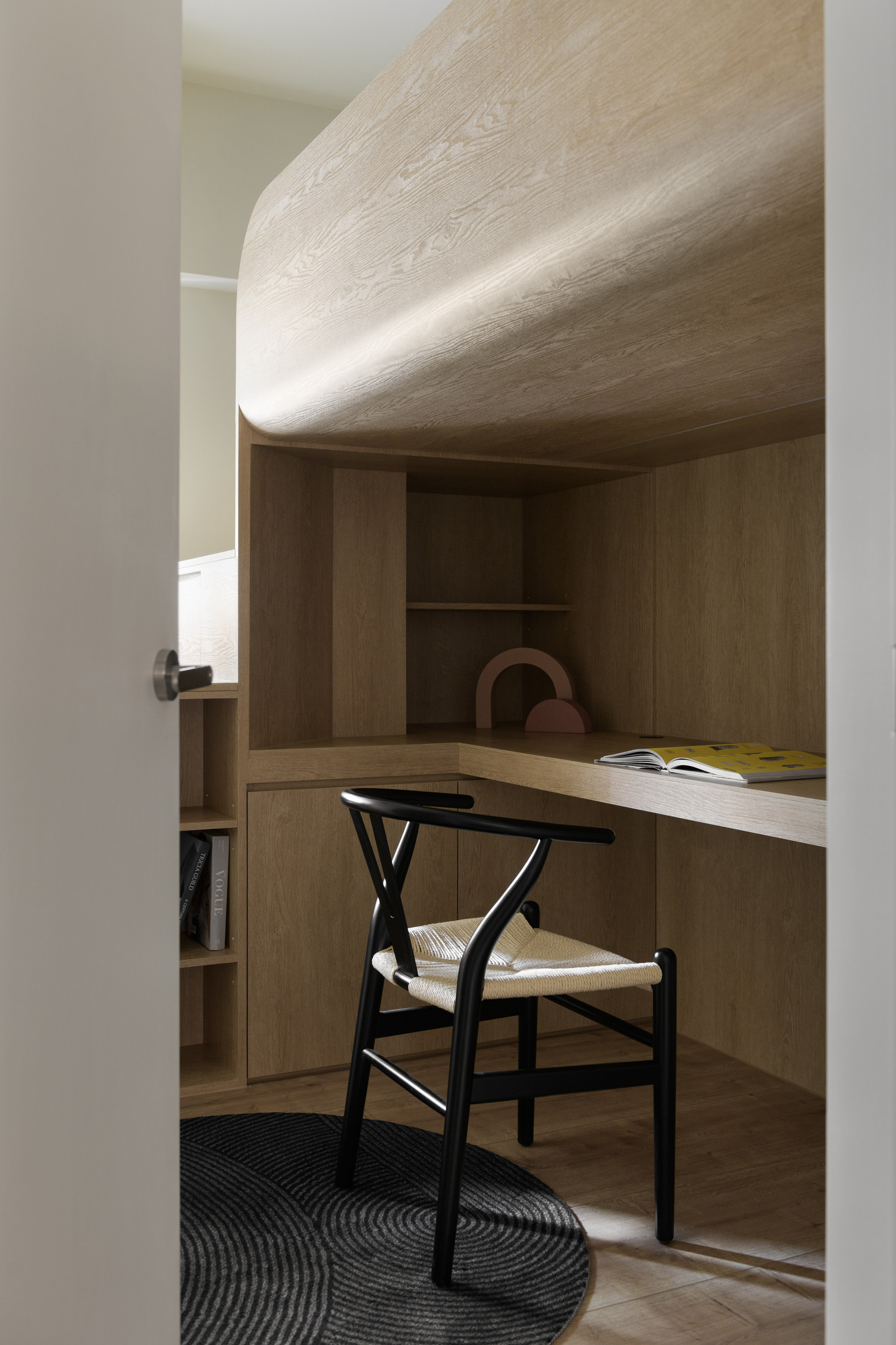 屋主为幸福的三口之家,在生活功能的需求上更多倾向于家庭内部的日常交互和学习需求,在风格和设计上喜欢简约朴素的现代风格,希望摒弃多余的装饰,保留一切生活的本真质朴。 屋主诉求: 对于房子原本的户型,屋主要求不变动,户型周正、采光优质,公共区域开放互通,最大的问题是屋主比较在意极简的设计感,原始承重墙保留,没有大拆大改的空间。对收纳容量也有一定的要求,希望最大化的利用空间,让储物柜自然融入其中,打造统一的平面。 根据屋主的需求和爱好我们最终确定了以简约原木为主基调并且成功落地。用最少的设计打造最有张力的空间,赋予家居生活无限的想象,简约与实用并重,讲究空间的干净素雅,没有复杂的元素和装饰,但是却能立马给人高级且精致的氛围感受,少而精,干净整洁的特点,由此带给人舒适、放松的空间心理感受,打造出屋主一直以来向往的理想家园。 户型图 1.客、餐、厨一体打造互联共通格局组合公区功能,开放厨房+岛台外置满足不同使用需求,补充厨房操作空间进一步完善洄游动线促进空间的连贯性,相序展开,打造高开阔+强互动的空间。 2.入户增加玄关柜扩充储物空间保证进出空间的仪式感。 3.卧室、客厅巧添书桌,区别与传统书房的学习办公功能,更具休闲性。 4.主卧配备独立衣帽间满足屋主日常所需,提升屋主幸福感。 玄关 玄关采用柔光砖与客厅原木地板,形成区分,自然过渡。做悬浮玄关柜预留换鞋区的同时增加空间呼吸感,底部、中部灯带内嵌,巧添温馨,柜体中部开放收纳随手之物,奠定整屋的极简格调。进门便可一览客厅,引人入胜,点亮归家的仪式感。 #玄关#地砖#玄关柜 客厅 客厅是体现极简原木风的空间之一,整体采用了浅木色地板,营造出温暖而自然的基调。整个客厅通过大面积的飘窗引入自然光线,使得整个空间明亮而通透,同时也让居住者在家中每个角落都能感受到自然与舒适的融合。 #客厅#原木风#客厅设计 对于软装搭配上删繁就简,采用浅色系的主沙发为主。方正的线条围和布局,一席同色地毯聚焦会客中心,原木边几敦厚可爱,各种材质,色彩,肌理,结构和谐相处,层次与秩序并存,将空间的功能性与审美性结合得恰到好处,让空间多了几分艺术气息。 #客厅#沙发#边几#原木风 公共区域沙发不靠墙设计强调视觉通透给予屋主创造空间,靠沙发设置原木书桌,迎窗打造沉浸式学习空间,丰富客厅功能。飞碟吊灯增添设计感,同时与客餐厅建立起联系,形式上随生活行为流动转化,加强家人间的沟通互动,家庭氛围自在随性。电视左侧沿飘窗打造小休憩区,上方做原木置物区,伴随着慵懒的温暖气息,更加精致有爱。 #客厅#书桌#吊灯 由墙及顶以原木覆盖,适当留白,温馨且舒适,无主灯设计,场域通透显大。电视背景墙没有做复杂的造型,原木格栅加原木护墙板上墙,线条横纵流动,悬浮电视加灯带内嵌,氛围感十足,下方做深色原木电视柜,收纳、展示功能兼具。 #客厅#客厅设计#电视背景墙 餐厅 客、餐、厨共处一场域,餐厅与开放式厨房+岛台一起牢牢连结,使餐厨一体化。岛台延伸了操作台面,以此形成洄游动线,增强了各个空间的互动性,也兼容会客的休闲娱乐,让空间具备社交共享属性。绿植洋溢,无论是用餐还是阅读都是一个最佳场所。 #餐厅#餐厅设计#岛台 从客厅延伸至餐厅做隐形柜收纳,餐厅区以开放加封闭柜形式展开,柜面与墙体一色,自成一景,中部镂空加原木饰面打造了开放展示区,打破统一带来的单调乏味感,摆放艺术摆件,灯带内嵌,温暖明媚,于细微处体现不凡品味。 #餐厅#餐边柜#收纳 隐藏式收纳是社交型餐、厨的关键,当餐厨功能向社交场合转变时,可快速隐藏收纳厨余电器,岛台与餐厅高低错落发挥不同功能,以原木饰面打底呼应全屋基调,下方做不同形式收纳,大面积桌面为无论是备餐还是学习提供良好条件,软垫靠背椅更是舒适感的来源。 #餐厅#岛台#插花 厨房 兼具功能性和美观的厨房是屋主的需求。我们选择打造一个社交型厨房,运用敞开式设计,结合岛台、餐厅让备餐区与储物区全面打开,将烹饪制作食物与用餐这两者功能结合,餐厨区域的空间充分利用起来,实现餐厨一体化。柜体选用浅色木纹木饰面搭配质感黑色,及免拉手设计,极简造型的设计在不破坏厨房整体性的同时减少磕碰,整体看起来干净又治愈。 #厨房#开放式厨房#橱柜 卧室 主卧设计以舒适度为主,双人床则居于卧室中央,原木护墙板一字延伸,灯带内嵌,辅以灰色靠背设计,朴素柔软的床品给予屋主好的睡眠体验。右侧放置极简床头柜便于收纳随手之物品,强调睡眠空间纯粹的同时,增设艺术壁灯做装饰,精致生活气息弥漫开来。木与白的配色舒适恬静,晕染柔和自然光线,给人岁月静好的感受。 #主卧#壁灯#卧室 衣帽间与卧室相邻,便捷的生活动线全方位提升居者的生活满意度,同时也能共享卧室优质采光,整体原木空间视觉感受干净纯粹独具温暖。以开放加封闭的通体衣橱设计,中部做挂衣区,横平竖直,视觉感受更为宽敞,空间更具呼吸感,内设储物区、叠放区、抽屉收纳区,应有尽有,满足屋主不同的储物需求,挂衣区以灯带烘托精致氛围,增加空间质感。 #衣帽间#原木#收纳 儿童房 为了让空间利用更加紧凑合理,满足孩童学习需求,寓教于乐,我们将床、书桌连接,打造一体式上床下桌,让房间看起来宽敞有余,五脏俱全。进门