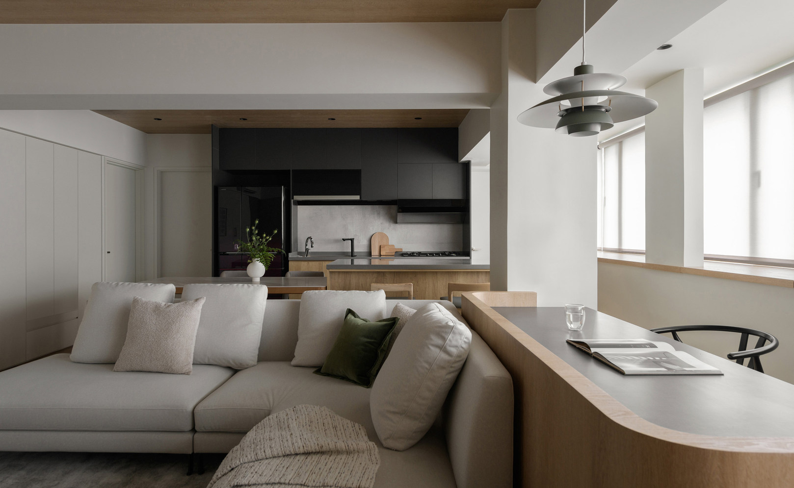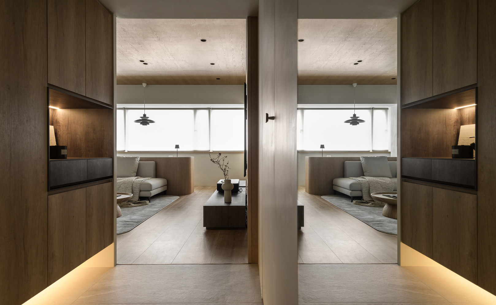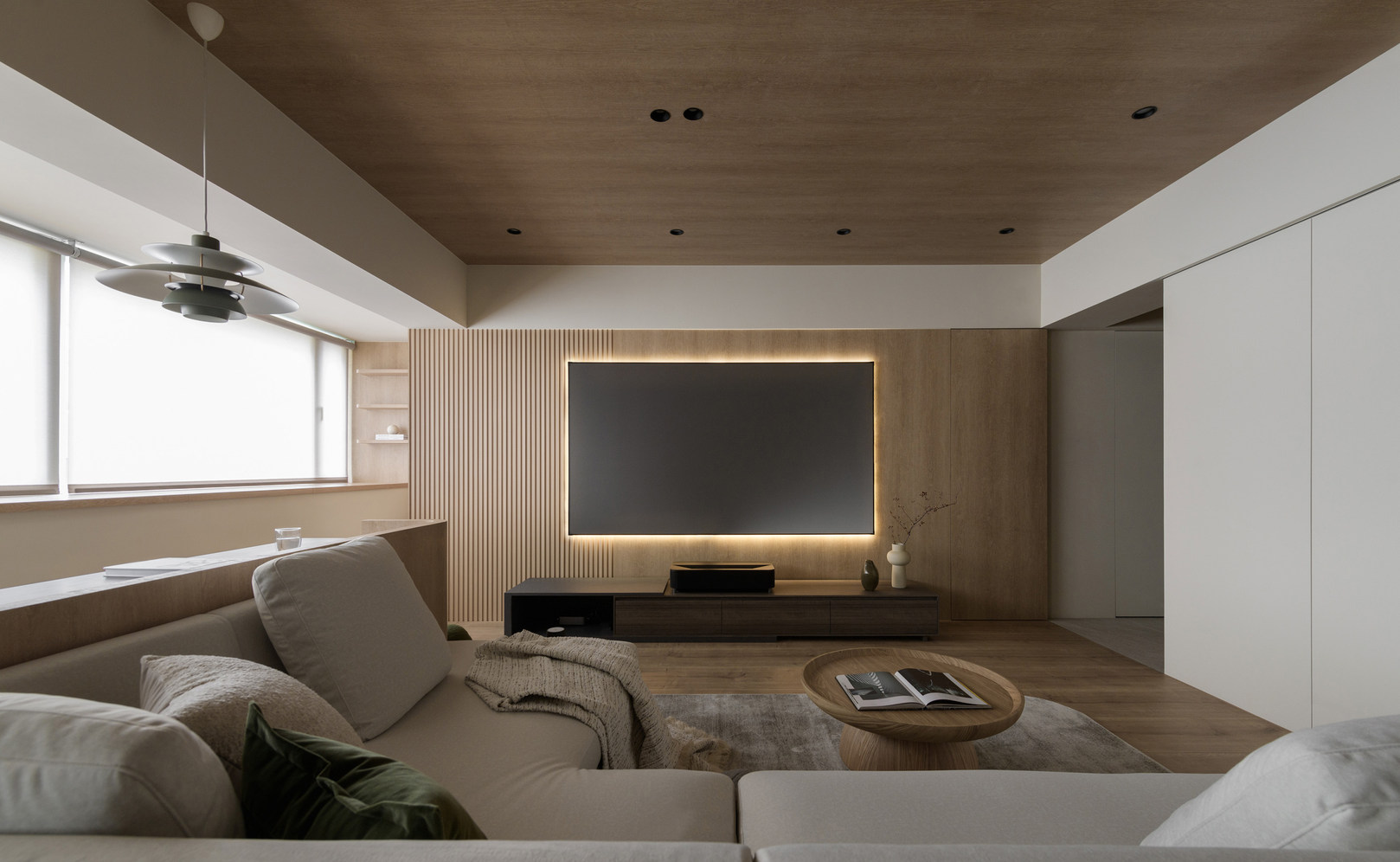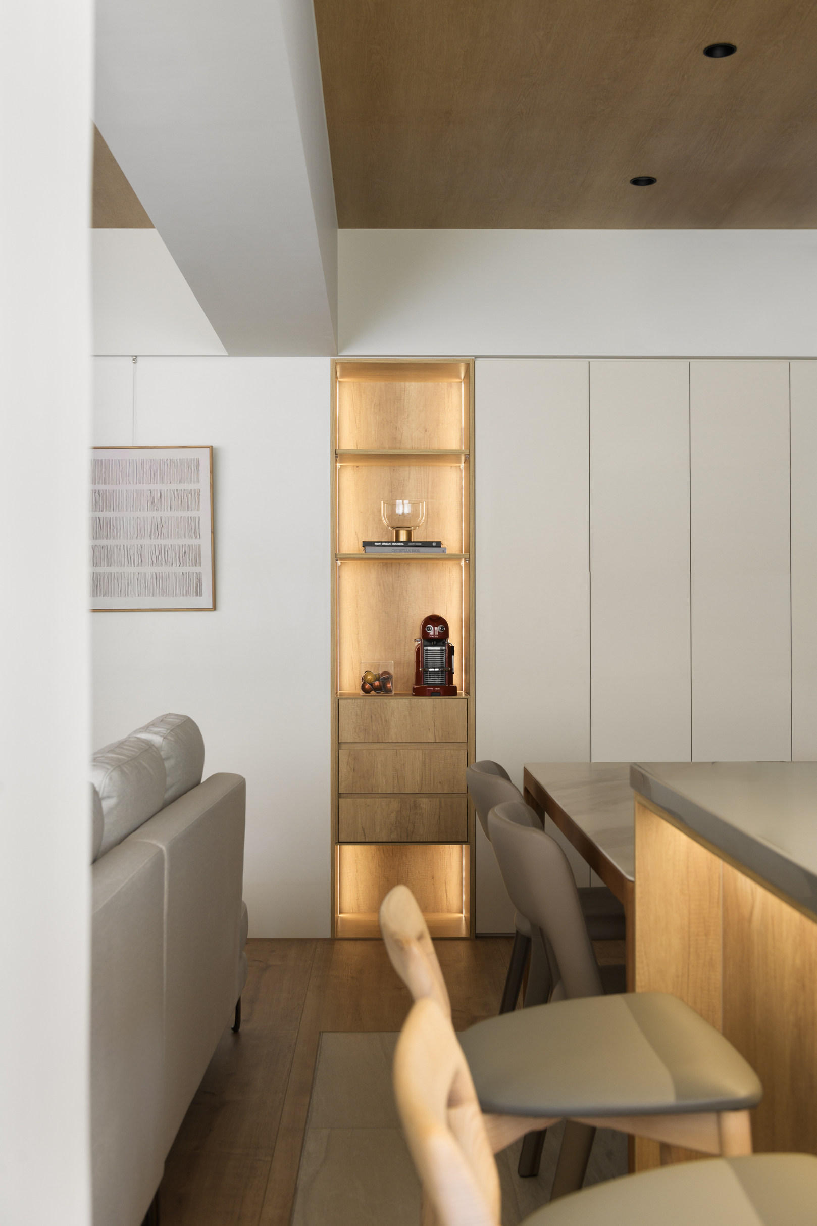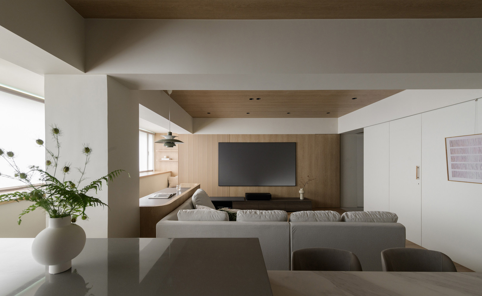 屋主为幸福的三口之家,在生活功能的需求上更多倾向于家庭内部的日常交互和学习需求,在风格和设计上喜欢简约朴素的现代风格,希望摒弃多余的装饰,保留一切生活的本真质朴。 屋主诉求: 对于房子原本的户型,屋主要求不变动,户型周正、采光优质,公共区域开放互通,最大的问题是屋主比较在意极简的设计感,原始承重墙保留,没有大拆大改的空间。对收纳容量也有一定的要求,希望最大化的利用空间,让储物柜自然融入其中,打造统一的平面。 根据屋主的需求和爱好我们最终确定了以简约原木为主基调并且成功落地。用最少的设计打造最有张力的空间,赋予家居生活无限的想象,简约与实用并重,讲究空间的干净素雅,没有复杂的元素和装饰,但是却能立马给人高级且精致的氛围感受,少而精,干净整洁的特点,由此带给人舒适、放松的空间心理感受,打造出屋主一直以来向往的理想家园。 户型图 1.客、餐、厨一体打造互联共通格局组合公区功能,开放厨房+岛台外置满足不同使用需求,补充厨房操作空间进一步完善洄游动线促进空间的连贯性,相序展开,打造高开阔+强互动的空间。 2.入户增加玄关柜扩充储物空间保证进出空间的仪式感。 3.卧室、客厅巧添书桌,区别与传统书房的学习办公功能,更具休闲性。 4.主卧配备独立衣帽间满足屋主日常所需,提升屋主幸福感。 玄关 玄关采用柔光砖与客厅原木地板,形成区分,自然过渡。做悬浮玄关柜预留换鞋区的同时增加空间呼吸感,底部、中部灯带内嵌,巧添温馨,柜体中部开放收纳随手之物,奠定整屋的极简格调。进门便可一览客厅,引人入胜,点亮归家的仪式感。 #玄关#地砖#玄关柜 客厅 客厅是体现极简原木风的空间之一,整体采用了浅木色地板,营造出温暖而自然的基调。整个客厅通过大面积的飘窗引入自然光线,使得整个空间明亮而通透,同时也让居住者在家中每个角落都能感受到自然与舒适的融合。 #客厅#原木风#客厅设计 对于软装搭配上删繁就简,采用浅色系的主沙发为主。方正的线条围和布局,一席同色地毯聚焦会客中心,原木边几敦厚可爱,各种材质,色彩,肌理,结构和谐相处,层次与秩序并存,将空间的功能性与审美性结合得恰到好处,让空间多了几分艺术气息。 #客厅#沙发#边几#原木风 公共区域沙发不靠墙设计强调视觉通透给予屋主创造空间,靠沙发设置原木书桌,迎窗打造沉浸式学习空间,丰富客厅功能。飞碟吊灯增添设计感,同时与客餐厅建立起联系,形式上随生活行为流动转化,加强家人间的沟通互动,家庭氛围自在随性。电视左侧沿飘窗打造小休憩区,上方做原木置物区,伴随着慵懒的温暖气息,更加精致有爱。 #客厅#书桌#吊灯 由墙及顶以原木覆盖,适当留白,温馨且舒适,无主灯设计,场域通透显大。电视背景墙没有做复杂的造型,原木格栅加原木护墙板上墙,线条横纵流动,悬浮电视加灯带内嵌,氛围感十足,下方做深色原木电视柜,收纳、展示功能兼具。 #客厅#客厅设计#电视背景墙 餐厅 客、餐、厨共处一场域,餐厅与开放式厨房+岛台一起牢牢连结,使餐厨一体化。岛台延伸了操作台面,以此形成洄游动线,增强了各个空间的互动性,也兼容会客的休闲娱乐,让空间具备社交共享属性。绿植洋溢,无论是用餐还是阅读都是一个最佳场所。 #餐厅#餐厅设计#岛台 从客厅延伸至餐厅做隐形柜收纳,餐厅区以开放加封闭柜形式展开,柜面与墙体一色,自成一景,中部镂空加原木饰面打造了开放展示区,打破统一带来的单调乏味感,摆放艺术摆件,灯带内嵌,温暖明媚,于细微处体现不凡品味。 #餐厅#餐边柜#收纳 隐藏式收纳是社交型餐、厨的关键,当餐厨功能向社交场合转变时,可快速隐藏收纳厨余电器,岛台与餐厅高低错落发挥不同功能,以原木饰面打底呼应全屋基调,下方做不同形式收纳,大面积桌面为无论是备餐还是学习提供良好条件,软垫靠背椅更是舒适感的来源。 #餐厅#岛台#插花 厨房 兼具功能性和美观的厨房是屋主的需求。我们选择打造一个社交型厨房,运用敞开式设计,结合岛台、餐厅让备餐区与储物区全面打开,将烹饪制作食物与用餐这两者功能结合,餐厨区域的空间充分利用起来,实现餐厨一体化。柜体选用浅色木纹木饰面搭配质感黑色,及免拉手设计,极简造型的设计在不破坏厨房整体性的同时减少磕碰,整体看起来干净又治愈。 #厨房#开放式厨房#橱柜 卧室 主卧设计以舒适度为主,双人床则居于卧室中央,原木护墙板一字延伸,灯带内嵌,辅以灰色靠背设计,朴素柔软的床品给予屋主好的睡眠体验。右侧放置极简床头柜便于收纳随手之物品,强调睡眠空间纯粹的同时,增设艺术壁灯做装饰,精致生活气息弥漫开来。木与白的配色舒适恬静,晕染柔和自然光线,给人岁月静好的感受。 #主卧#壁灯#卧室 衣帽间与卧室相邻,便捷的生活动线全方位提升居者的生活满意度,同时也能共享卧室优质采光,整体原木空间视觉感受干净纯粹独具温暖。以开放加封闭的通体衣橱设计,中部做挂衣区,横平竖直,视觉感受更为宽敞,空间更具呼吸感,内设储物区、叠放区、抽屉收纳区,应有尽有,满足屋主不同的储物需求,挂衣区以灯带烘托精致氛围,增加空间质感。 #衣帽间#原木#收纳 儿童房 为了让空间利用更加紧凑合理,满足孩童学习需求,寓教于乐,我们将床、书桌连接,打造一体式上床下桌,让房间看起来宽敞有余,五脏俱全。进门
