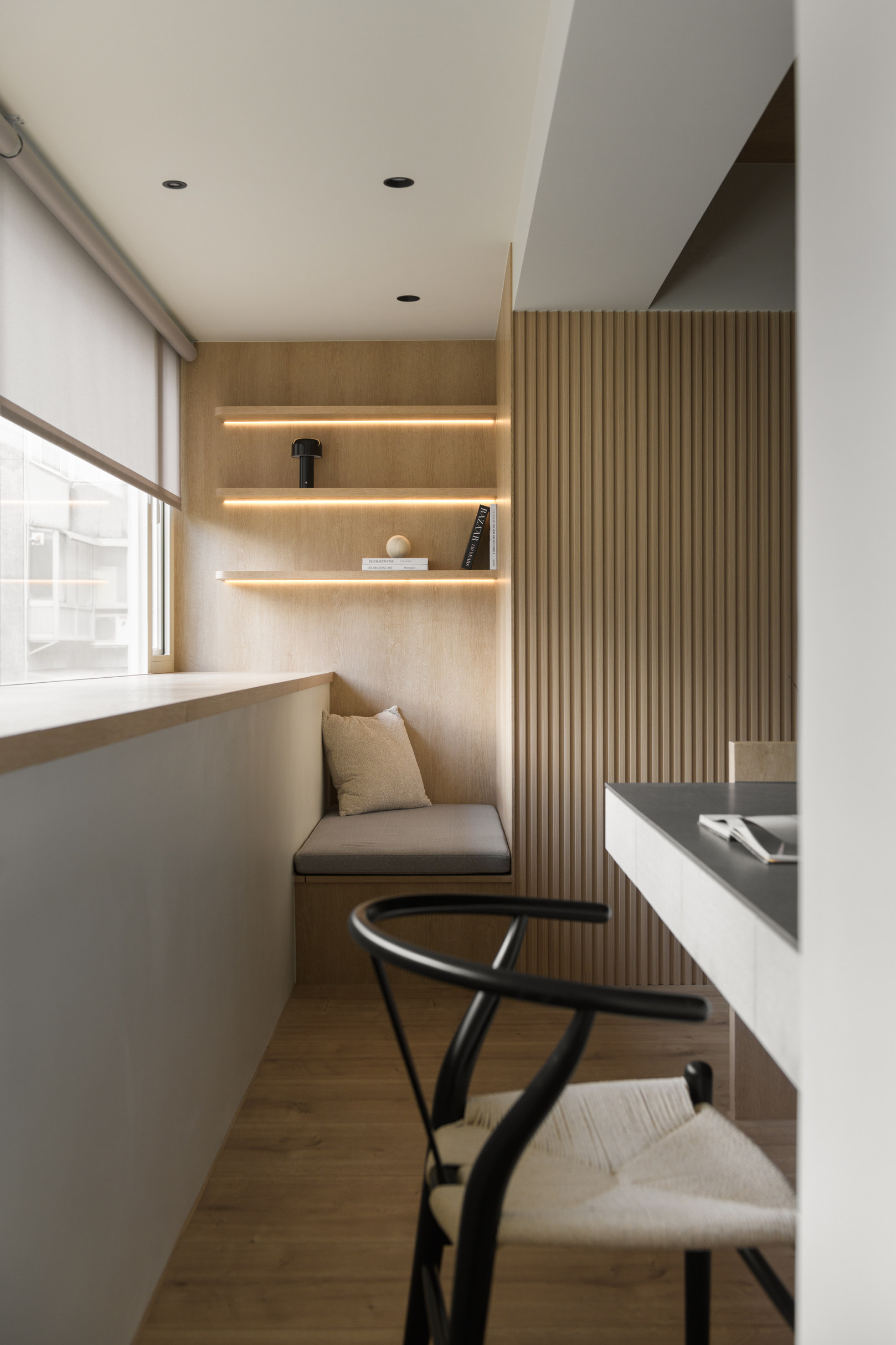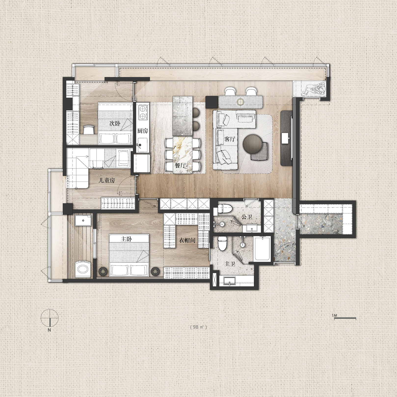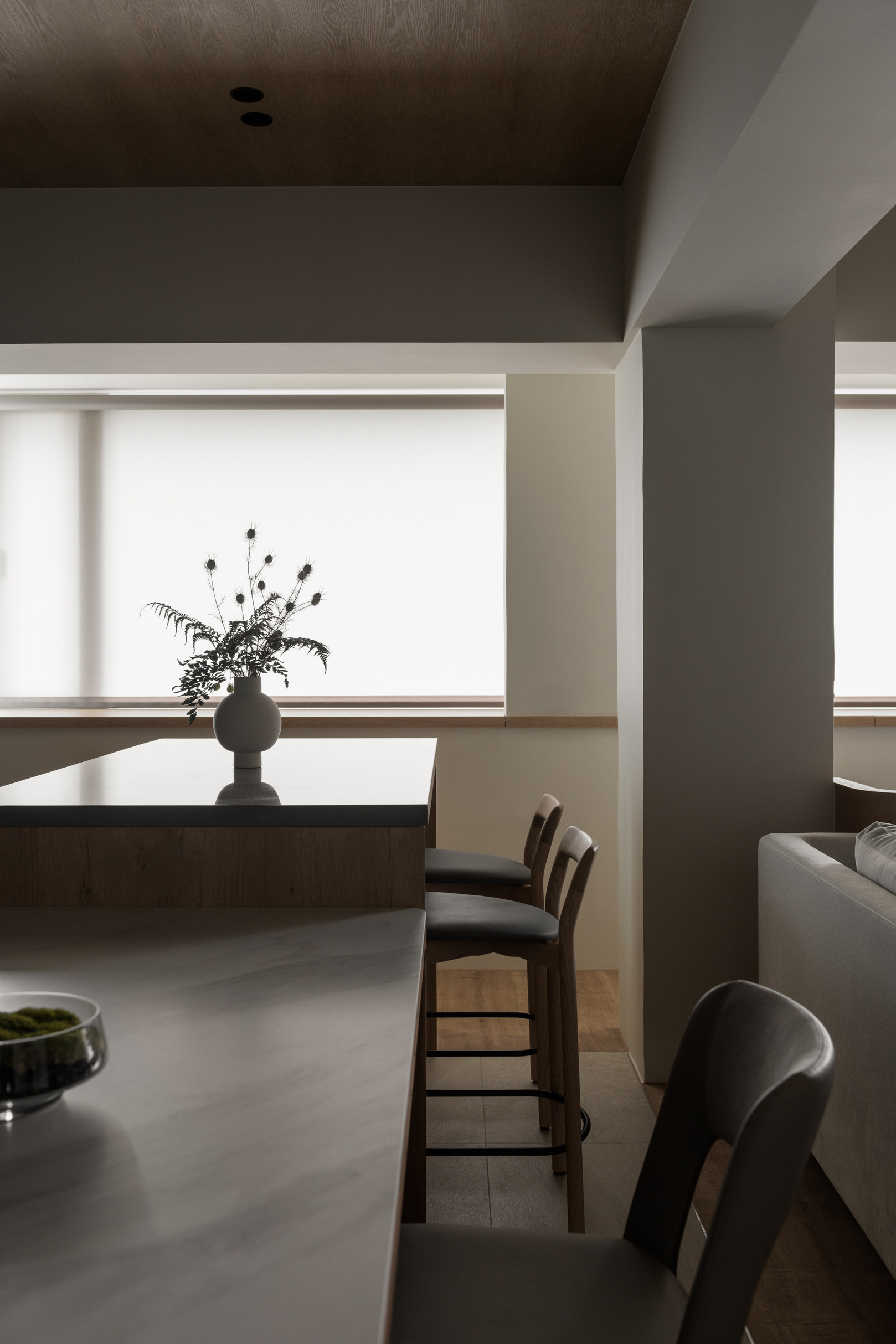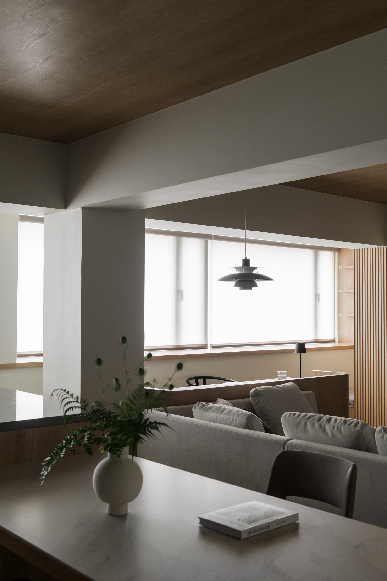 屋主为幸福的三口之家,在生活功能的需求上更多倾向于家庭内部的日常交互和学习需求,在风格和设计上喜欢简约朴素的现代风格,希望摒弃多余的装饰,保留一切生活的本真质朴。 屋主诉求: 对于房子原本的户型,屋主要求不变动,户型周正、采光优质,公共区域开放互通,最大的问题是屋主比较在意极简的设计感,原始承重墙保留,没有大拆大改的空间。对收纳容量也有一定的要求,希望最大化的利用空间,让储物柜自然融入其中,打造统一的平面。 根据屋主的需求和爱好我们最终确定了以简约原木为主基调并且成功落地。用最少的设计打造最有张力的空间,赋予家居生活无限的想象,简约与实用并重,讲究空间的干净素雅,没有复杂的元素和装饰,但是却能立马给人高级且精致的氛围感受,少而精,干净整洁的特点,由此带给人舒适、放松的空间心理感受,打造出屋主一直以来向往的理想家园。 户型图 1.客、餐、厨一体打造互联共通格局组合公区功能,开放厨房+岛台外置满足不同使用需求,补充厨房操作空间进一步完善洄游动线促进空间的连贯性,相序展开,打造高开阔+强互动的空间。 2.入户增加玄关柜扩充储物空间保证进出空间的仪式感。 3.卧室、客厅巧添书桌,区别与传统书房的学习办公功能,更具休闲性。 4.主卧配备独立衣帽间满足屋主日常所需,提升屋主幸福感。 玄关 玄关采用柔光砖与客厅原木地板,形成区分,自然过渡。做悬浮玄关柜预留换鞋区的同时增加空间呼吸感,底部、中部灯带内嵌,巧添温馨,柜体中部开放收纳随手之物,奠定整屋的极简格调。进门便可一览客厅,引人入胜,点亮归家的仪式感。 #玄关#地砖#玄关柜 客厅 客厅是体现极简原木风的空间之一,整体采用了浅木色地板,营造出温暖而自然的基调。整个客厅通过大面积的飘窗引入自然光线,使得整个空间明亮而通透,同时也让居住者在家中每个角落都能感受到自然与舒适的融合。 #客厅#原木风#客厅设计 对于软装搭配上删繁就简,采用浅色系的主沙发为主。方正的线条围和布局,一席同色地毯聚焦会客中心,原木边几敦厚可爱,各种材质,色彩,肌理,结构和谐相处,层次与秩序并存,将空间的功能性与审美性结合得恰到好处,让空间多了几分艺术气息。 #客厅#沙发#边几#原木风 公共区域沙发不靠墙设计强调视觉通透给予屋主创造空间,靠沙发设置原木书桌,迎窗打造沉浸式学习空间,丰富客厅功能。飞碟吊灯增添设计感,同时与客餐厅建立起联系,形式上随生活行为流动转化,加强家人间的沟通互动,家庭氛围自在随性。电视左侧沿飘窗打造小休憩区,上方做原木置物区,伴随着慵懒的温暖气息,更加精致有爱。 #客厅#书桌#吊灯 由墙及顶以原木覆盖,适当留白,温馨且舒适,无主灯设计,场域通透显大。电视背景墙没有做复杂的造型,原木格栅加原木护墙板上墙,线条横纵流动,悬浮电视加灯带内嵌,氛围感十足,下方做深色原木电视柜,收纳、展示功能兼具。 #客厅#客厅设计#电视背景墙 餐厅 客、餐、厨共处一场域,餐厅与开放式厨房+岛台一起牢牢连结,使餐厨一体化。岛台延伸了操作台面,以此形成洄游动线,增强了各个空间的互动性,也兼容会客的休闲娱乐,让空间具备社交共享属性。绿植洋溢,无论是用餐还是阅读都是一个最佳场所。 #餐厅#餐厅设计#岛台 从客厅延伸至餐厅做隐形柜收纳,餐厅区以开放加封闭柜形式展开,柜面与墙体一色,自成一景,中部镂空加原木饰面打造了开放展示区,打破统一带来的单调乏味感,摆放艺术摆件,灯带内嵌,温暖明媚,于细微处体现不凡品味。 #餐厅#餐边柜#收纳 隐藏式收纳是社交型餐、厨的关键,当餐厨功能向社交场合转变时,可快速隐藏收纳厨余电器,岛台与餐厅高低错落发挥不同功能,以原木饰面打底呼应全屋基调,下方做不同形式收纳,大面积桌面为无论是备餐还是学习提供良好条件,软垫靠背椅更是舒适感的来源。 #餐厅#岛台#插花 厨房 兼具功能性和美观的厨房是屋主的需求。我们选择打造一个社交型厨房,运用敞开式设计,结合岛台、餐厅让备餐区与储物区全面打开,将烹饪制作食物与用餐这两者功能结合,餐厨区域的空间充分利用起来,实现餐厨一体化。柜体选用浅色木纹木饰面搭配质感黑色,及免拉手设计,极简造型的设计在不破坏厨房整体性的同时减少磕碰,整体看起来干净又治愈。 #厨房#开放式厨房#橱柜 卧室 主卧设计以舒适度为主,双人床则居于卧室中央,原木护墙板一字延伸,灯带内嵌,辅以灰色靠背设计,朴素柔软的床品给予屋主好的睡眠体验。右侧放置极简床头柜便于收纳随手之物品,强调睡眠空间纯粹的同时,增设艺术壁灯做装饰,精致生活气息弥漫开来。木与白的配色舒适恬静,晕染柔和自然光线,给人岁月静好的感受。 #主卧#壁灯#卧室 衣帽间与卧室相邻,便捷的生活动线全方位提升居者的生活满意度,同时也能共享卧室优质采光,整体原木空间视觉感受干净纯粹独具温暖。以开放加封闭的通体衣橱设计,中部做挂衣区,横平竖直,视觉感受更为宽敞,空间更具呼吸感,内设储物区、叠放区、抽屉收纳区,应有尽有,满足屋主不同的储物需求,挂衣区以灯带烘托精致氛围,增加空间质感。 #衣帽间#原木#收纳 儿童房 为了让空间利用更加紧凑合理,满足孩童学习需求,寓教于乐,我们将床、书桌连接,打造一体式上床下桌,让房间看起来宽敞有余,五脏俱全。进门