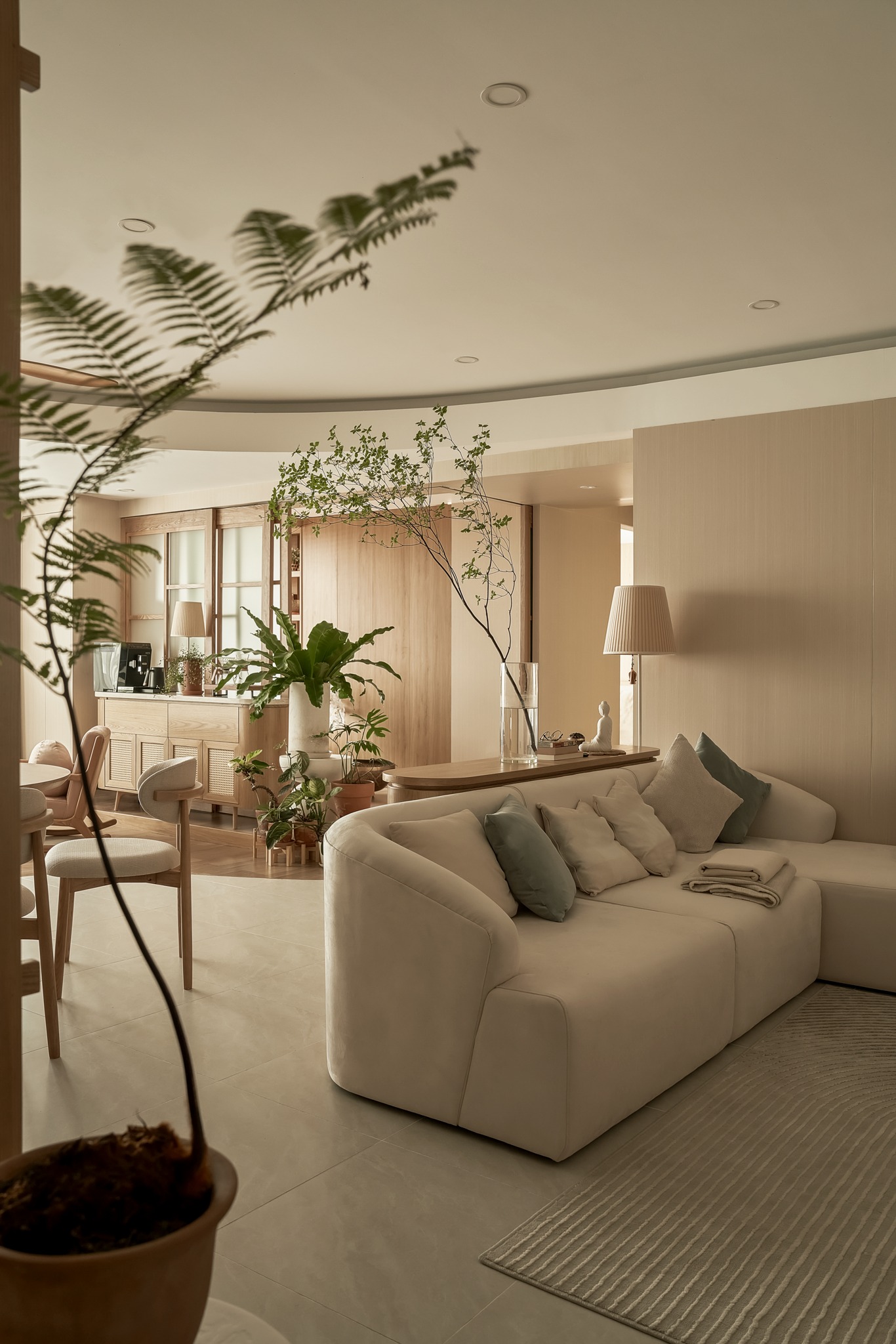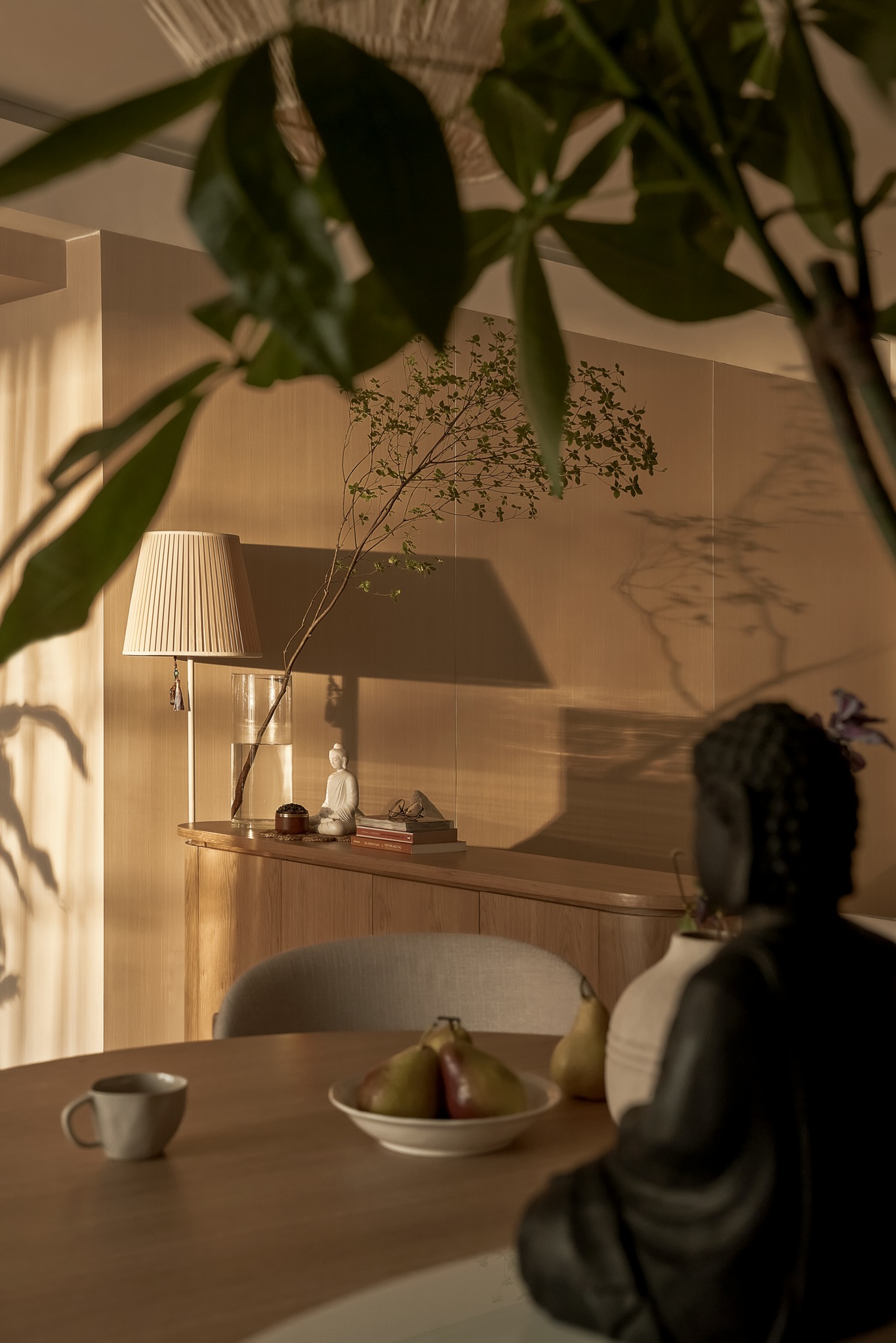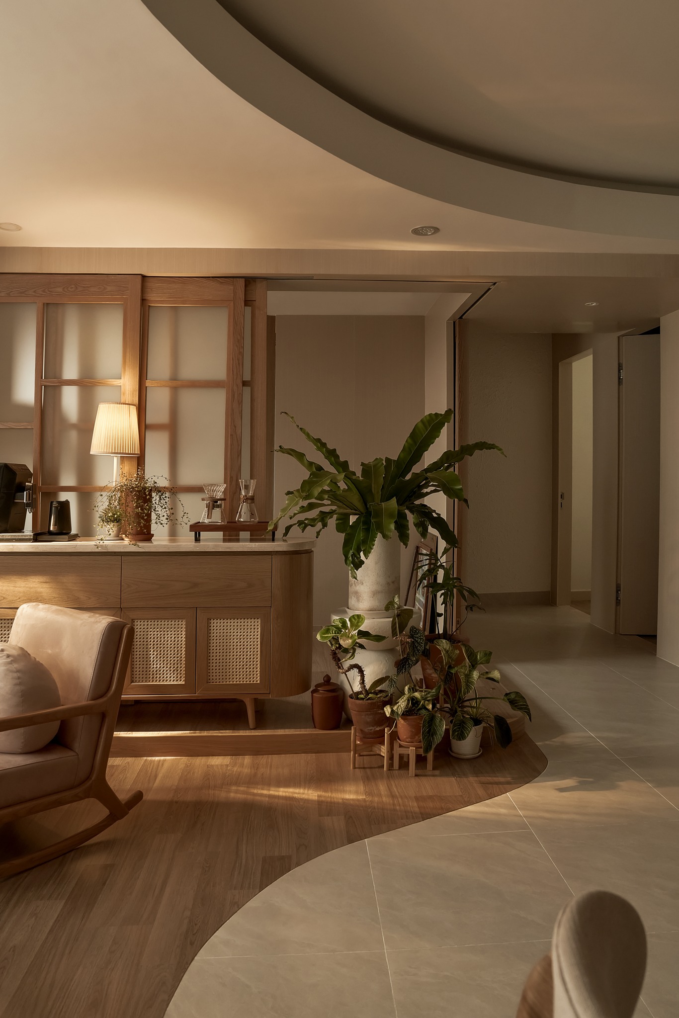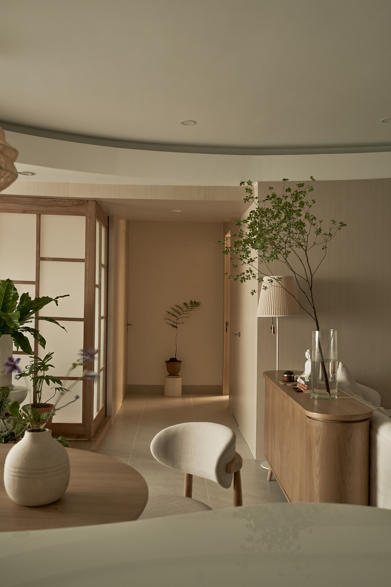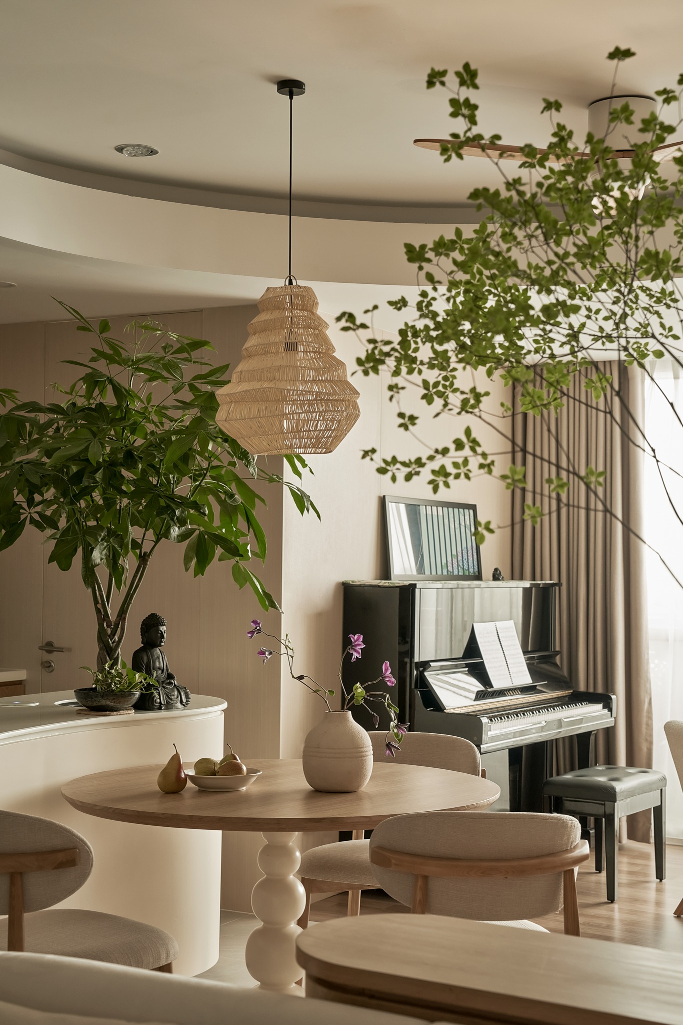 本次案例为新房装修项目,屋主是一对夫妻,房子的风格遵循女主人的想法来的,女主人的性格是一个温婉柔顺且娴静端庄的,比较注重生活仪式感,喜欢归家浪漫的感觉,通过更深一步的交流与沟通了解到屋主酷爱原木元素,更倾向于原木风格。 屋主诉求: 屋主对现代原木和简约风格有深厚的兴趣,她希望在满足空间功能的同时,也能感受到空间温暖的人文气息。能够将室内的优质采光利用起来,扩大明亮,舒适的观感范围,寻求一片宁静的空间放松自己。其次又要兼具实用性需求。在保证功能齐全的情况下,尽量开放式设计,功能区做到分而不隔。 为满足屋主的需求,我们在风格上,新家确定以现代原木为主基调,整个设计围绕屋主的生活方式与审美取向展开,创造一个完美契合需求的家居环境。通过对空间合理的布局,利用光线和色彩营造,力求简洁又不失特色。并在细节处通过抓取“大自然”特质,运用绿色调营造出一种舒适自然的氛围 户型图 1.在玄关处设置了玄关柜以及置鞋区,保证屋主进出需求,增加储物空间。 2.在卧室之间设置独立卫生间缩短生活动线,卧室内加入办公桌扩充使用功能,进一步提升居家舒适度。 3.客餐厅一体化设计,拆除客厅墙体,整个南北通透,增加舒适度和通透感。增设休闲客厅丰盈空间表现形式。 4.开放式厨房与公区空间形成完美联动,打破传统空间的界限视觉上更宽敞明亮,提升家人之间的互动性 5.设置独立书房构建沉浸式学习空间,偏向自然的设计处理让书房更具活力。 玄关 入户是玄关空间,地面上装点着花卉纹饰,形成与客餐厅的过渡空间,让出门入户,更具仪式感。米白的底色增加视觉上的明亮度。左侧的部分设计了一个小型玄关柜,可以收纳鞋具等等,十分方便。同时在墙面上粘贴了几个挂钩,满足屋主的使用需求的同时,减少空间密闭沉闷感。 #玄关#地砖#玄关柜#原木风 客厅 背景墙通刷蜜瓜橙,沙发后方做浅色原木柜收纳,细腿支撑保证充足的储物空间之余,又相对利落轻盈,勾勒造型的立体感。上方绿植与摆件的光影映射在墙面之上,调动情景氛围,家居体验时尚而独特谱写温柔的空间情绪。 #客厅#绿植#沙发#储物柜 从屋主喜好和审美出发,客厅与休闲室平行而设,整体布局合理且实用。暖色调铺陈整个空间,构筑柔和温暖的空间气质。地面选择了大理石地砖,中和暖调,软装方面尽量精简,只通过白色主体沙发,绿植,地毯来凸显客厅中心,让空间更显干净和秩序。 #客厅#地砖#沙发#地毯 夜幕降临,昏黄的灯光不动声色的为空间注入温柔与安然,营造着静谧慰藉的氛围。玻璃折叠门自由切换不同的实用需求。当光透过玻璃流露出含蓄的中式意蕴,为家增添一份源自自然的韵脚。绿植的加入平添几分艺术气息,让家的每一个角落都充满趣味与惊喜。 #客厅#玻璃门#绿植 休闲区域两张沙发椅围绕茶几摆放,柔软的同时具备足够的支撑力,茶几低矮造型减少视觉阻挡,归还屋主最开阔的空间体验。左侧墙面用来归置钢琴,打造一个开放琴房,阳光晴好的午后,携着光影和微风,安宁静谧的小屋响起袅袅琴音,交织出幸福而美好的一刻。 #客厅#沙发椅#茶几#绿植#原木风 书房旁加入斗柜缓解全屋收纳压力,划分出的多个抽屉实现多格储物与分类收纳,榆木的色调+藤编的点缀宛如置身复古的电影情节之中。置放上台灯,摆件,盆栽等物,实现美与实用的共生。旁侧则划分出绿植盆栽区,营造静谧和谐空间语境,美在角落。 #客厅#地台#斗柜#绿植 餐厅 奶油色调一如既往占据餐厅的主导地位,惬意的圆桌,围拢出一家人和谐美满的用餐画面感。在餐厅与厨房之间设计一个圆弧形的吧台隔断,使得这块区域处于半开放的状态,有序的空间便于通行形成自由通达的整体格局。顶部安置了一个手工编织创意吊灯,精准的点亮用餐仪式感。 #餐厅#餐桌#吊灯#岛台#圆桌 圆桌与吊顶上下呼应,将空间视觉变得流畅柔和。将目光聚焦于餐桌质感的来源,原木材质不单是追求视觉上的美感抗污耐油也是线上生活所需。小巧餐桌减轻传统餐桌厚重感更显轻盈,配套餐椅柔软的坐垫给予屋主舒适的就餐体验与细腻的木质纹理共同搭建低调的高级质感。 #餐厅#餐椅#绿植 客餐厅之间联通无界,吊顶边缘做弧形设计化解天花板的棱角与落差,在视觉上层面扩大空间增加延申感,让家更显明亮开阔。客餐厨等公共区域之间以木地板衔接地砖作为界限划分,不影响视野延申的同时强调分区,让家更有秩序感。 #餐厅#地砖#圆桌 厨房 开放式厨房采用双一字型布局合理规划出清晰流畅的操作动线,将每一寸空间的充分利用。整体采用原木+白色调,打造更为清新脱俗的视觉氛围,橱柜的高度遵循人体工学,让家务更轻松。外侧设置吧台扩充厨房操作台面,形成洄游动线提升便利,厨电内嵌演绎理工学美感。 #厨房#橱柜#岛台#开放式厨房 走廊 纵深的走廊加深着空间的层次,无论是立体的墙面设计还是温和的灯光模式都与整个家的主基调相呼应。摇曳的绿植也与空间一同感知着生活的美好,整个空间平和自持,舒缓雅致。 #走廊#绿植 书房 书房整体采用原木包裹,散发温存质朴韵味,偏向休闲的设计让办公学习处于放松自然之间。保留飘窗铺设软垫打造出阅读休憩的好去处,优渥的采光透过木质百叶帘进入室内,浪漫与温馨充斥全屋。靠墙作通顶储物柜,提升书房储物功能,柜内暗藏玄机,安放着