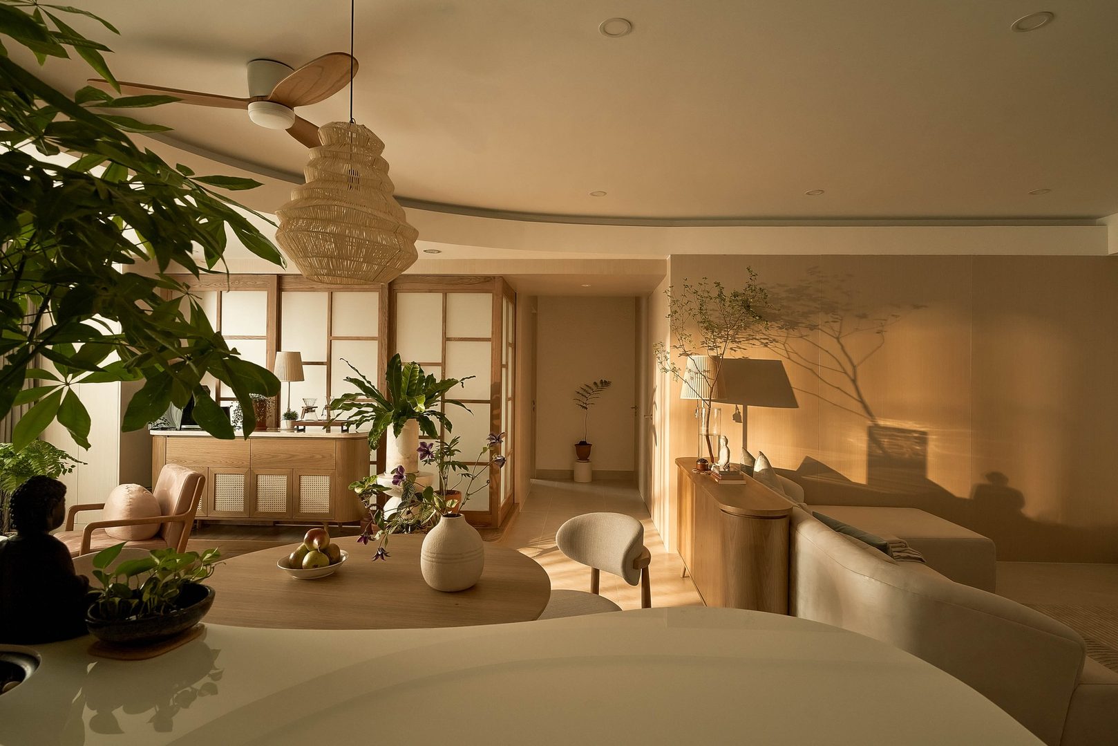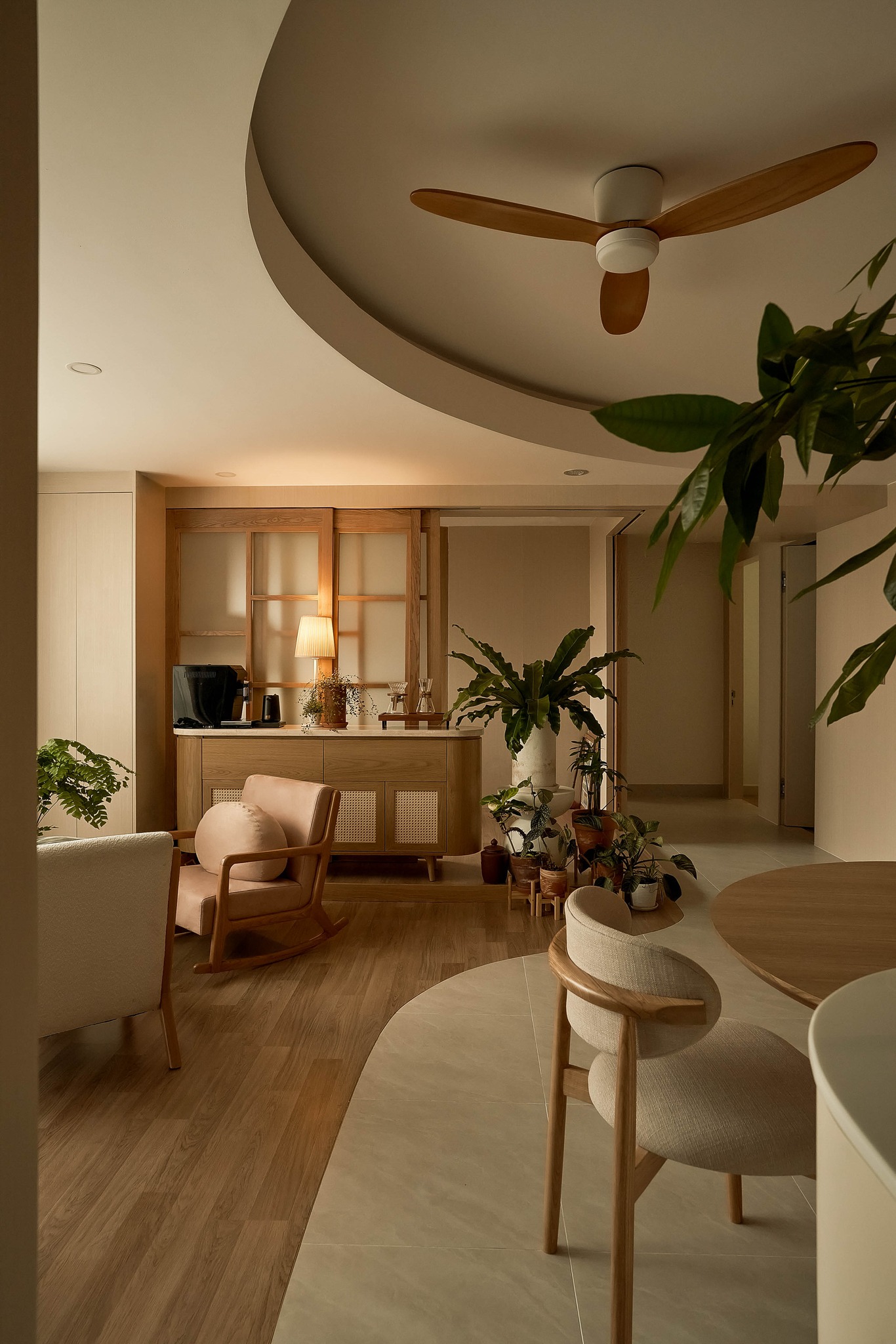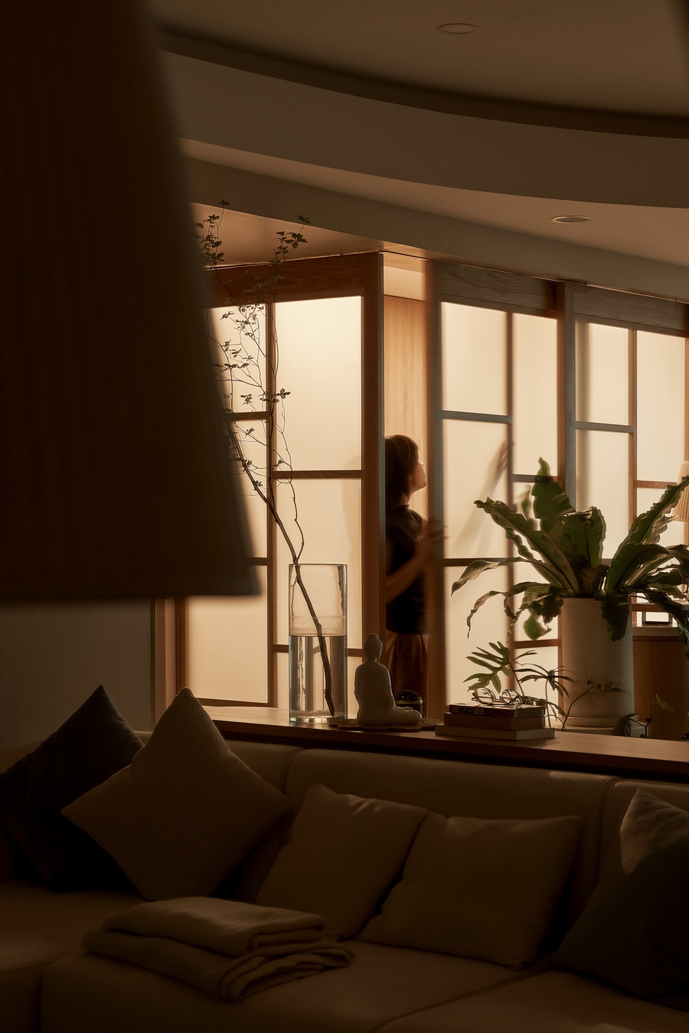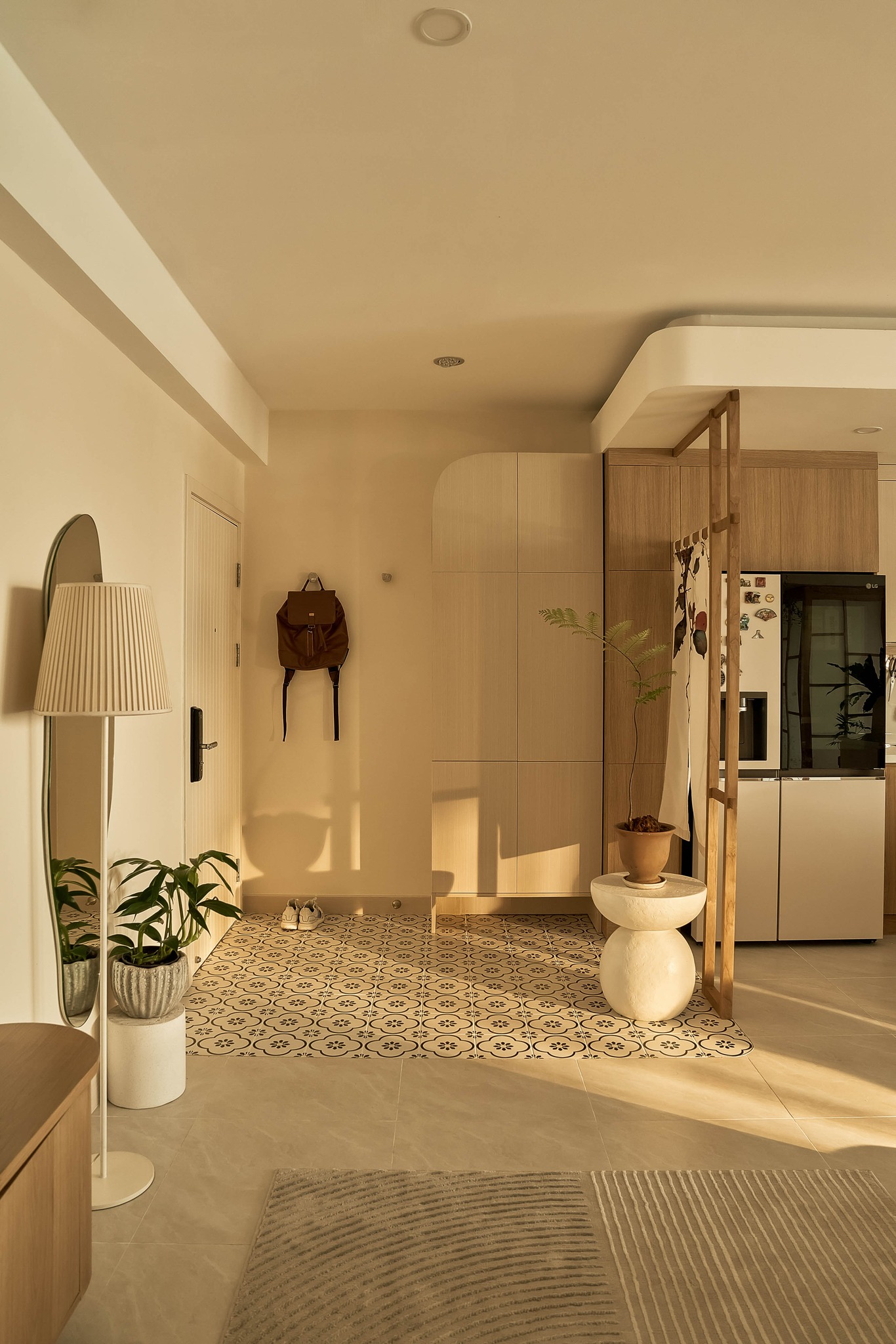 本次案例为新房装修项目,屋主是一对夫妻,房子的风格遵循女主人的想法来的,女主人的性格是一个温婉柔顺且娴静端庄的,比较注重生活仪式感,喜欢归家浪漫的感觉,通过更深一步的交流与沟通了解到屋主酷爱原木元素,更倾向于原木风格。 屋主诉求: 屋主对现代原木和简约风格有深厚的兴趣,她希望在满足空间功能的同时,也能感受到空间温暖的人文气息。能够将室内的优质采光利用起来,扩大明亮,舒适的观感范围,寻求一片宁静的空间放松自己。其次又要兼具实用性需求。在保证功能齐全的情况下,尽量开放式设计,功能区做到分而不隔。 为满足屋主的需求,我们在风格上,新家确定以现代原木为主基调,整个设计围绕屋主的生活方式与审美取向展开,创造一个完美契合需求的家居环境。通过对空间合理的布局,利用光线和色彩营造,力求简洁又不失特色。并在细节处通过抓取“大自然”特质,运用绿色调营造出一种舒适自然的氛围 户型图 1.在玄关处设置了玄关柜以及置鞋区,保证屋主进出需求,增加储物空间。 2.在卧室之间设置独立卫生间缩短生活动线,卧室内加入办公桌扩充使用功能,进一步提升居家舒适度。 3.客餐厅一体化设计,拆除客厅墙体,整个南北通透,增加舒适度和通透感。增设休闲客厅丰盈空间表现形式。 4.开放式厨房与公区空间形成完美联动,打破传统空间的界限视觉上更宽敞明亮,提升家人之间的互动性 5.设置独立书房构建沉浸式学习空间,偏向自然的设计处理让书房更具活力。 玄关 入户是玄关空间,地面上装点着花卉纹饰,形成与客餐厅的过渡空间,让出门入户,更具仪式感。米白的底色增加视觉上的明亮度。左侧的部分设计了一个小型玄关柜,可以收纳鞋具等等,十分方便。同时在墙面上粘贴了几个挂钩,满足屋主的使用需求的同时,减少空间密闭沉闷感。 #玄关#地砖#玄关柜#原木风 客厅 背景墙通刷蜜瓜橙,沙发后方做浅色原木柜收纳,细腿支撑保证充足的储物空间之余,又相对利落轻盈,勾勒造型的立体感。上方绿植与摆件的光影映射在墙面之上,调动情景氛围,家居体验时尚而独特谱写温柔的空间情绪。 #客厅#绿植#沙发#储物柜 从屋主喜好和审美出发,客厅与休闲室平行而设,整体布局合理且实用。暖色调铺陈整个空间,构筑柔和温暖的空间气质。地面选择了大理石地砖,中和暖调,软装方面尽量精简,只通过白色主体沙发,绿植,地毯来凸显客厅中心,让空间更显干净和秩序。 #客厅#地砖#沙发#地毯 夜幕降临,昏黄的灯光不动声色的为空间注入温柔与安然,营造着静谧慰藉的氛围。玻璃折叠门自由切换不同的实用需求。当光透过玻璃流露出含蓄的中式意蕴,为家增添一份源自自然的韵脚。绿植的加入平添几分艺术气息,让家的每一个角落都充满趣味与惊喜。 #客厅#玻璃门#绿植 休闲区域两张沙发椅围绕茶几摆放,柔软的同时具备足够的支撑力,茶几低矮造型减少视觉阻挡,归还屋主最开阔的空间体验。左侧墙面用来归置钢琴,打造一个开放琴房,阳光晴好的午后,携着光影和微风,安宁静谧的小屋响起袅袅琴音,交织出幸福而美好的一刻。 #客厅#沙发椅#茶几#绿植#原木风 书房旁加入斗柜缓解全屋收纳压力,划分出的多个抽屉实现多格储物与分类收纳,榆木的色调+藤编的点缀宛如置身复古的电影情节之中。置放上台灯,摆件,盆栽等物,实现美与实用的共生。旁侧则划分出绿植盆栽区,营造静谧和谐空间语境,美在角落。 #客厅#地台#斗柜#绿植 餐厅 奶油色调一如既往占据餐厅的主导地位,惬意的圆桌,围拢出一家人和谐美满的用餐画面感。在餐厅与厨房之间设计一个圆弧形的吧台隔断,使得这块区域处于半开放的状态,有序的空间便于通行形成自由通达的整体格局。顶部安置了一个手工编织创意吊灯,精准的点亮用餐仪式感。 #餐厅#餐桌#吊灯#岛台#圆桌 圆桌与吊顶上下呼应,将空间视觉变得流畅柔和。将目光聚焦于餐桌质感的来源,原木材质不单是追求视觉上的美感抗污耐油也是线上生活所需。小巧餐桌减轻传统餐桌厚重感更显轻盈,配套餐椅柔软的坐垫给予屋主舒适的就餐体验与细腻的木质纹理共同搭建低调的高级质感。 #餐厅#餐椅#绿植 客餐厅之间联通无界,吊顶边缘做弧形设计化解天花板的棱角与落差,在视觉上层面扩大空间增加延申感,让家更显明亮开阔。客餐厨等公共区域之间以木地板衔接地砖作为界限划分,不影响视野延申的同时强调分区,让家更有秩序感。 #餐厅#地砖#圆桌 厨房 开放式厨房采用双一字型布局合理规划出清晰流畅的操作动线,将每一寸空间的充分利用。整体采用原木+白色调,打造更为清新脱俗的视觉氛围,橱柜的高度遵循人体工学,让家务更轻松。外侧设置吧台扩充厨房操作台面,形成洄游动线提升便利,厨电内嵌演绎理工学美感。 #厨房#橱柜#岛台#开放式厨房 走廊 纵深的走廊加深着空间的层次,无论是立体的墙面设计还是温和的灯光模式都与整个家的主基调相呼应。摇曳的绿植也与空间一同感知着生活的美好,整个空间平和自持,舒缓雅致。 #走廊#绿植 书房 书房整体采用原木包裹,散发温存质朴韵味,偏向休闲的设计让办公学习处于放松自然之间。保留飘窗铺设软垫打造出阅读休憩的好去处,优渥的采光透过木质百叶帘进入室内,浪漫与温馨充斥全屋。靠墙作通顶储物柜,提升书房储物功能,柜内暗藏玄机,安放着