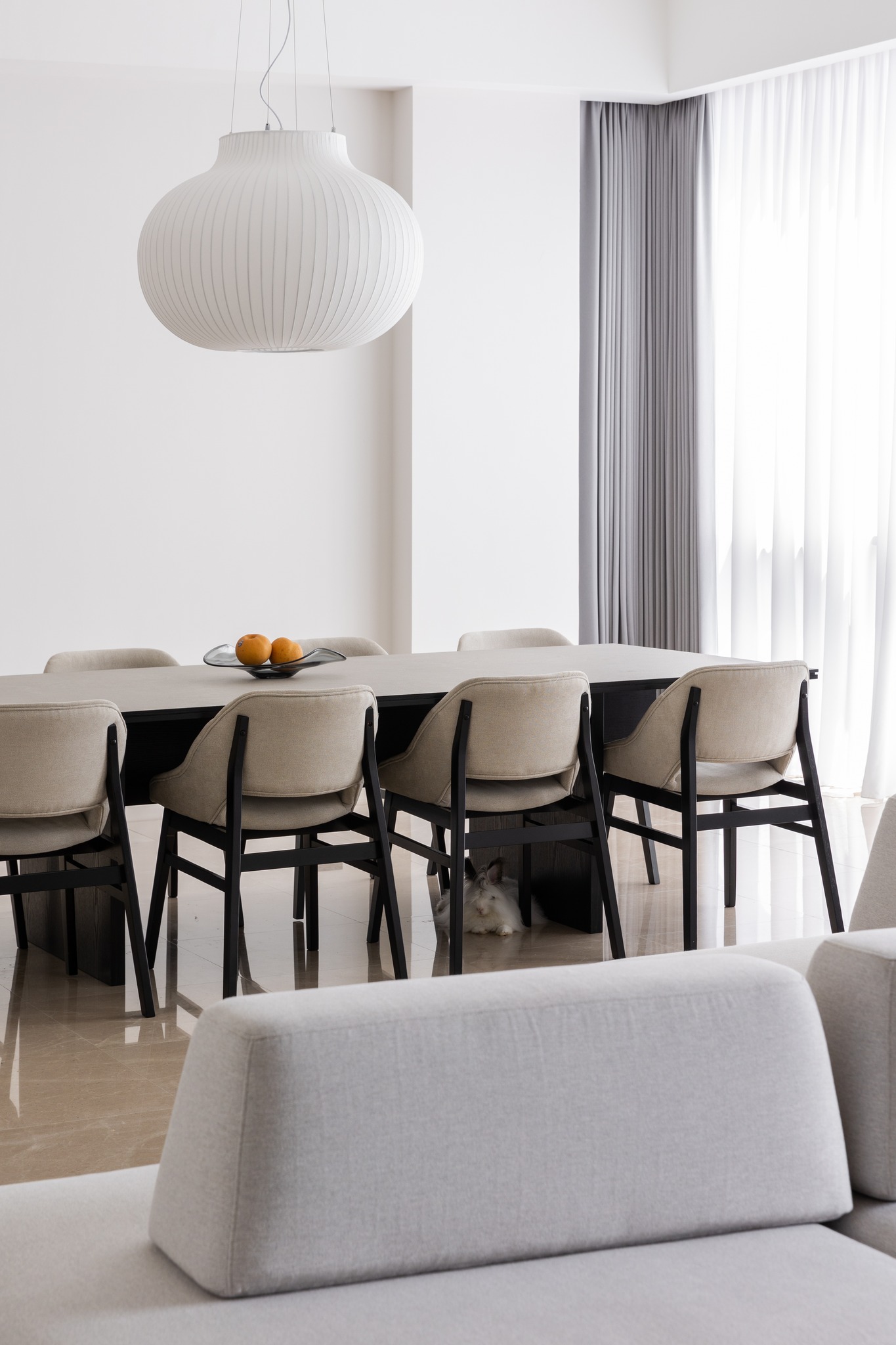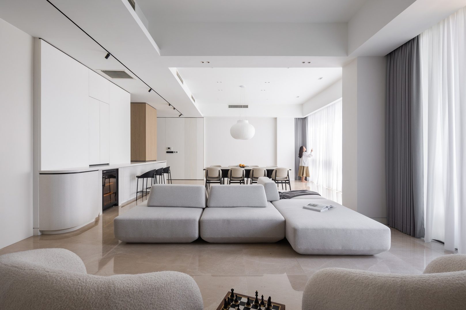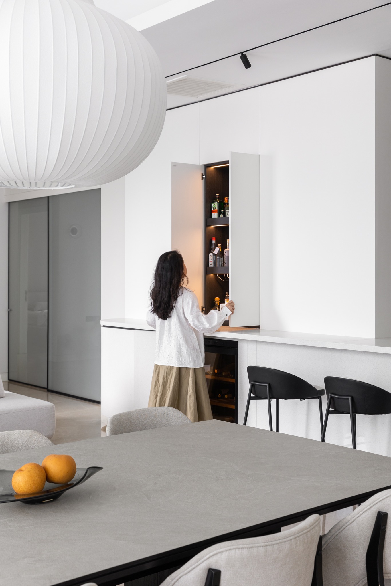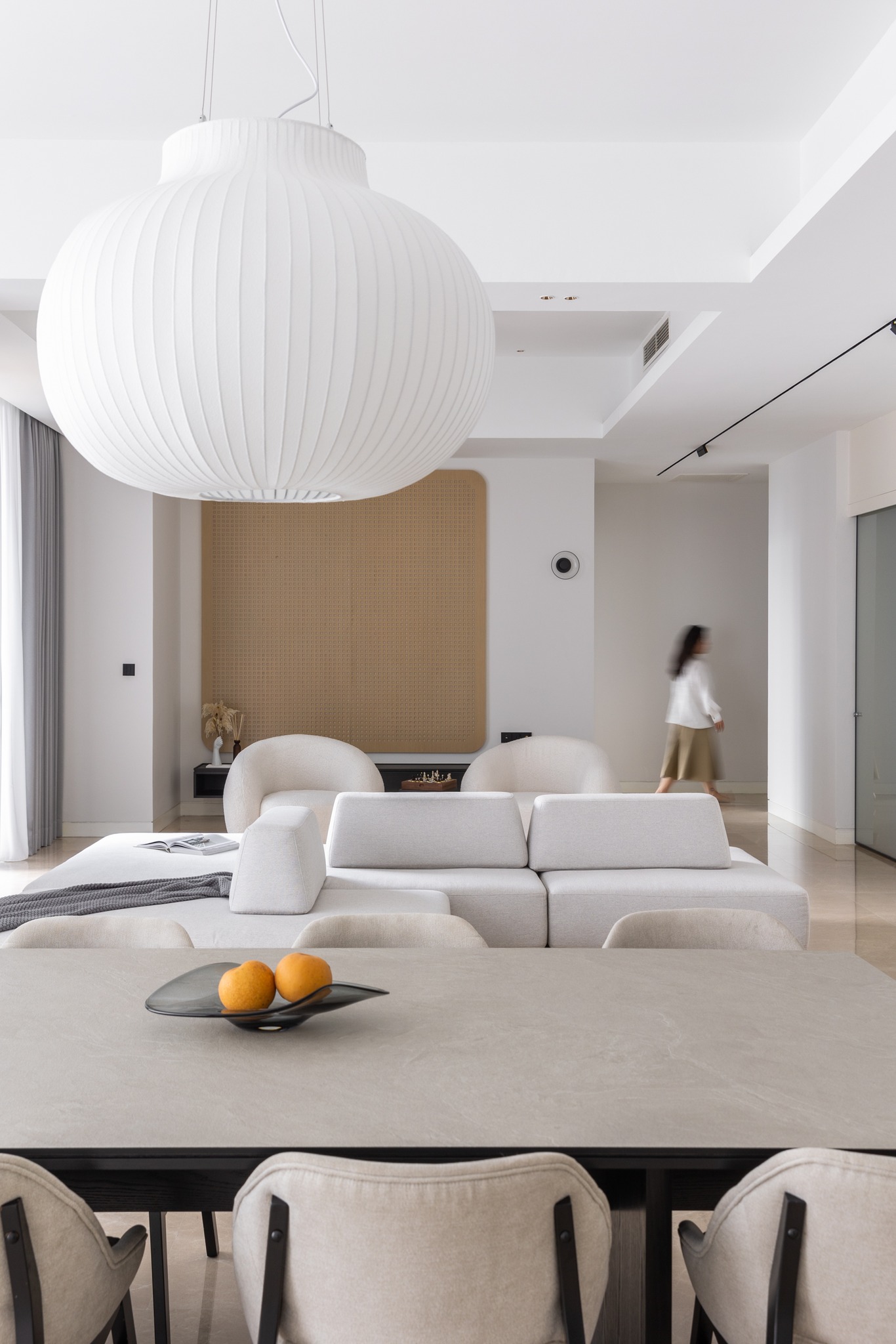 本期案例为新房装修项目,上下两层,屋主喜爱现代轻奢风格,希望能够栖息于精致雅侈的环境,享受质感的生活。 屋主诉求:屋主对于房屋的规划,整体需要有明朗开阔的感觉,颜色的选择上尽量以白色、灰色为主,并将一层的公共区域做客餐厨的一体化设计。功能使用具有便捷度与私密性。彰显他们独特的个人爱好,拥有宽敞舒适的生活空间。 综合考虑到屋主的使用需求,最终确定以现代轻奢为主线,在满足功能性需求的基础上严格把控材质与细节的运用,实现居者理想中的家。软装的搭配增加亮点消弭空间乏味,其次在客厅布局上做一定改变,餐、厨一体化设计增加屋主互动感,搭配吧台缓解厨房压力,增加整体质感。卫生间、卧室相邻,缩短动线,提升屋主幸福感。 户型图 1、功能区合理区分,打通入户格局,厨房、吧台与餐厅结合,环形动线流畅自然。 2.大面积落地窗引入自然光线让空间更开阔通透让一楼空间的整体放大。 3.一楼增设休息室为居者提供放松休息的区域。同时也增加了玄关柜,增加入户收纳空间。 1.二楼则以睡眠区为主采用动静分明的布局。 2.主卧改造成大套间,睡眠区、衣帽间、卫生间一应俱全,构筑私密且舒适的私人空间,给予更为高品质的生活享受。 3.二楼配备休闲区满足居者日常所需,根据屋主生活习惯增加卫生间,做干湿分离。 客厅 客厅空间以简洁温柔的为主基调,干净耐看的白色铺陈空间底色,低饱和纯色墙体在无主灯映射下呈现独特质感,现代软装充盈其中,大理石地板通铺增添雅奢质感,空间充满独特细腻的气息。搭配无主灯设计,在实用的基础上扩充视觉,大面积落地窗引光入室带来丰沛采光。全屋低饱和度色块点缀,恰到好处的气质彰显,将居住者内心抚慰。 #客厅#无主灯#客厅设计#现代风 视线聚焦于开放会客厅,作为整个空间的交互核心和灵魂,打破传统的沙发摆放形式,弱化客厅的存在,将客厅作为一个可成长的空间。墙面,柜体,房门颜色和谐统一,隐藏与展现,视觉效果干净清爽。整体的色调结合四周筒灯、射灯补充光源带来温馨,一切变得宁静美好。 #客厅#沙发#客厅设计#白色 客厅选用组合式白色模块沙发,营造松弛且灵活自如的场景秩序。整体设计去繁就简,去电视设计贴合当代年轻人需求,墙体大面积留白,客、餐、厨处于同一场域,在层层递进中找到空间的节奏。以布艺、木纹、艺术涂料三种材质搭配,将生活与休闲自然过渡。 #客厅#沙发#客厅设计#吊灯#无主灯 餐厅 客餐一体开放式设计增加空间流动性,餐厅展示优雅基调,餐厅采用鱼肚白的岩板餐桌,自带打光效果的岩板餐桌不仅让餐厅成为家居中的一道亮丽风景线,更是彰显出主人的品味和格调。奶白色的皮质餐椅组成,色调淡雅温柔,自然细腻的肌理让用餐场域显得娴静而优雅。长桌配置能够同时容纳多人用餐,依托落地窗通透感,空间规划大气平整。 #餐厅#餐桌#餐椅#长桌#吊灯 方形餐桌把握着人与人之间恰到好处的距离。餐桌的台面选择了加宽的设计,更符合多人用餐的需求。岩板质地诠释中式雅致气息,不同于传统的用物质堆砌而成的美感,意式轻奢更为简洁、大方,白色灯笼吊灯聚焦餐桌中央,点亮用餐仪式感。 #餐厅#餐桌#吊灯 厨房 厨房封闭设计,隔绝油烟,定制L型橱柜使在厨房内的动线布局都是在转身之间完成,橱柜白+浅绿配色清新自然,斑点地砖消弭单调,与全屋色系上保持统一性,简约耐看。清新的配色让整个空间的舒适度提升了不少,也避免小空间的沉闷感,美观又实用。 #厨房#橱柜 厨房外侧设计为环绕吧台,紧衔餐、厨,延展厨房、餐厅功能,从橱柜到岛台采用纯白色+极简造型+隐形柜门,把简约和利落贯彻到底。采用吧台相互衔接,餐厨结构一下子被拉大,方便又实用。吧台不仅包揽用餐、收纳、料理台的功能,还能增进与家人之间的沟通,提升幸福感,也为生活增添趣仪式感。底部灯带环绕,氛围感拉满。 #厨房#吧台#中岛#岛台 吧台环绕,台面、承重柱点缀暖色系木饰面,内嵌水槽扩充厨房功能,电器平整嵌入,空间最大化利用的同时演绎理工学美感,满足西厨爱好者,在纯净舒适的空间里感知温馨客餐厅一体化开放布局,空间互通超敞亮~多处隐形柜从细节上去设计收纳、让家久住如新通过简单的材质打造静谧的生活气息~ #吧台 吧台外置高椅,黑色细腿设计提升质感的同时轻巧灵动减少笨重感,底部做白色隐形柜,为全屋收纳提供有力支撑,空间层次丰富,形成动线上的视觉联动,让家有更多的可能性。开放式的布局,提高空间利用率,同时缩短家居动线。客餐厨地面选择统一的米色地砖铺贴,保证了空间的完整性,沉稳大气的同时,还方便清洁打理。 #吧台#地砖 客、餐、吧台处于同一场域,打造超实用开放空间,公共区域完美分配空间,满足休憩、会客等功能,一切融洽,既独立又统一。墙体巧做隐形柜体,虚实结合,缓解视觉单调,同时满足不同的储物需求,原木点缀增加空间层次感,隐形灯带蔓延环绕整个吧台区域,打造见光不见影的精致感。 #吧台#灯带 吧台左侧墙体镂空,内嵌储物柜,放置厨具,与白色墙面融为一体,打开之后别有洞天,家电平整嵌入隐形收纳的同时也打破通体白色带来的单调感,射灯环绕丰富室内光源。 #吧台#收纳 卧室 主卧设计以简约为主,整个空间以高级灰和现代简约为基础,低调的色彩搭配营造了舒适又有格调的享受!背景墙采用灰色搭