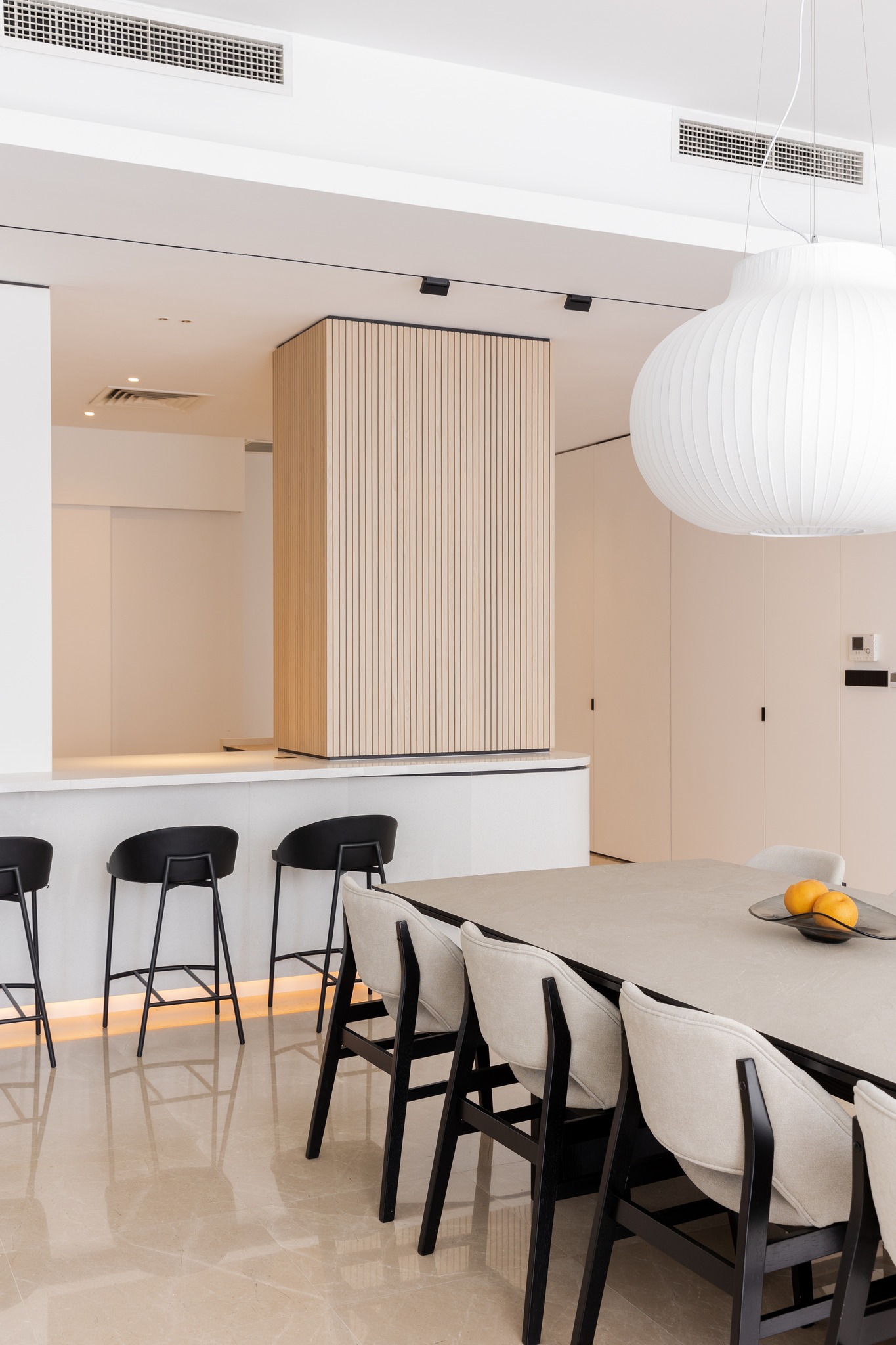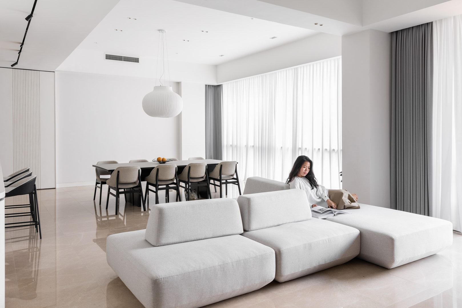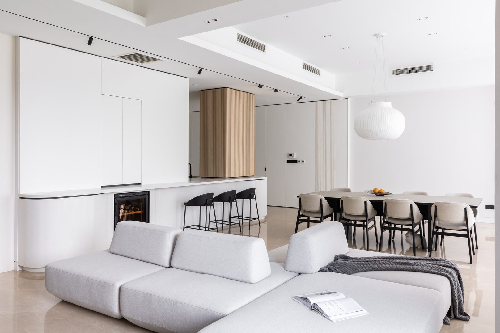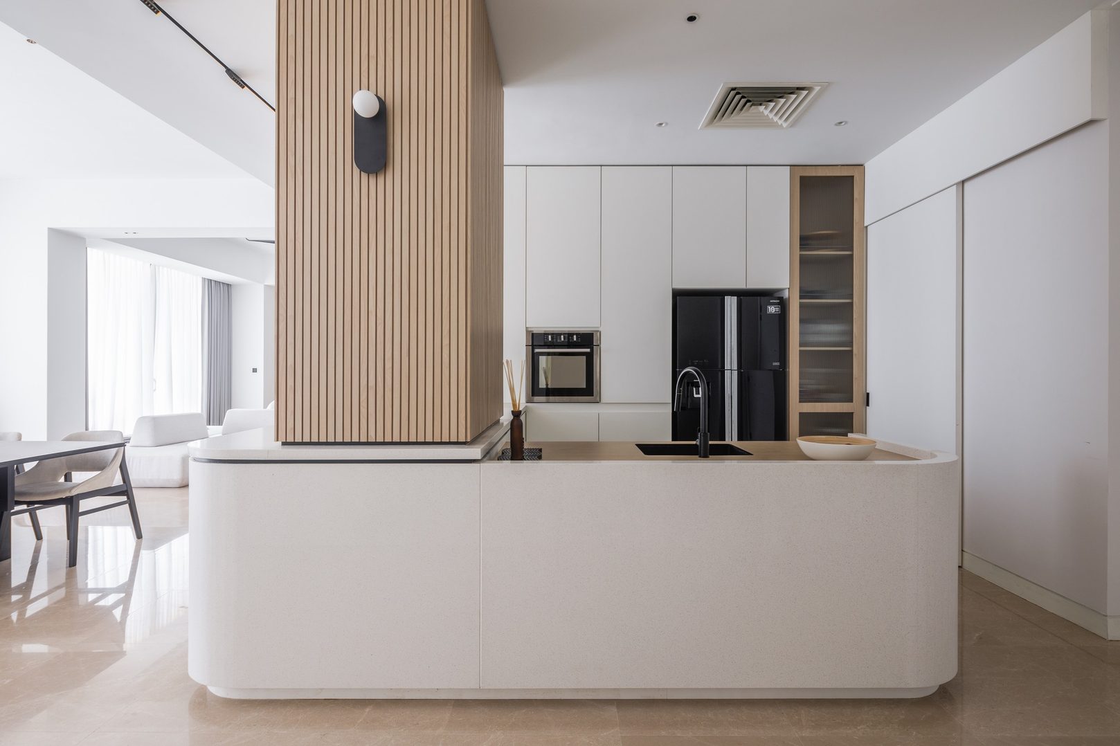 本期案例为新房装修项目,上下两层,屋主喜爱现代轻奢风格,希望能够栖息于精致雅侈的环境,享受质感的生活。 屋主诉求:屋主对于房屋的规划,整体需要有明朗开阔的感觉,颜色的选择上尽量以白色、灰色为主,并将一层的公共区域做客餐厨的一体化设计。功能使用具有便捷度与私密性。彰显他们独特的个人爱好,拥有宽敞舒适的生活空间。 综合考虑到屋主的使用需求,最终确定以现代轻奢为主线,在满足功能性需求的基础上严格把控材质与细节的运用,实现居者理想中的家。软装的搭配增加亮点消弭空间乏味,其次在客厅布局上做一定改变,餐、厨一体化设计增加屋主互动感,搭配吧台缓解厨房压力,增加整体质感。卫生间、卧室相邻,缩短动线,提升屋主幸福感。 户型图 1、功能区合理区分,打通入户格局,厨房、吧台与餐厅结合,环形动线流畅自然。 2.大面积落地窗引入自然光线让空间更开阔通透让一楼空间的整体放大。 3.一楼增设休息室为居者提供放松休息的区域。同时也增加了玄关柜,增加入户收纳空间。 1.二楼则以睡眠区为主采用动静分明的布局。 2.主卧改造成大套间,睡眠区、衣帽间、卫生间一应俱全,构筑私密且舒适的私人空间,给予更为高品质的生活享受。 3.二楼配备休闲区满足居者日常所需,根据屋主生活习惯增加卫生间,做干湿分离。 客厅 客厅空间以简洁温柔的为主基调,干净耐看的白色铺陈空间底色,低饱和纯色墙体在无主灯映射下呈现独特质感,现代软装充盈其中,大理石地板通铺增添雅奢质感,空间充满独特细腻的气息。搭配无主灯设计,在实用的基础上扩充视觉,大面积落地窗引光入室带来丰沛采光。全屋低饱和度色块点缀,恰到好处的气质彰显,将居住者内心抚慰。 #客厅#无主灯#客厅设计#现代风 视线聚焦于开放会客厅,作为整个空间的交互核心和灵魂,打破传统的沙发摆放形式,弱化客厅的存在,将客厅作为一个可成长的空间。墙面,柜体,房门颜色和谐统一,隐藏与展现,视觉效果干净清爽。整体的色调结合四周筒灯、射灯补充光源带来温馨,一切变得宁静美好。 #客厅#沙发#客厅设计#白色 客厅选用组合式白色模块沙发,营造松弛且灵活自如的场景秩序。整体设计去繁就简,去电视设计贴合当代年轻人需求,墙体大面积留白,客、餐、厨处于同一场域,在层层递进中找到空间的节奏。以布艺、木纹、艺术涂料三种材质搭配,将生活与休闲自然过渡。 #客厅#沙发#客厅设计#吊灯#无主灯 餐厅 客餐一体开放式设计增加空间流动性,餐厅展示优雅基调,餐厅采用鱼肚白的岩板餐桌,自带打光效果的岩板餐桌不仅让餐厅成为家居中的一道亮丽风景线,更是彰显出主人的品味和格调。奶白色的皮质餐椅组成,色调淡雅温柔,自然细腻的肌理让用餐场域显得娴静而优雅。长桌配置能够同时容纳多人用餐,依托落地窗通透感,空间规划大气平整。 #餐厅#餐桌#餐椅#长桌#吊灯 方形餐桌把握着人与人之间恰到好处的距离。餐桌的台面选择了加宽的设计,更符合多人用餐的需求。岩板质地诠释中式雅致气息,不同于传统的用物质堆砌而成的美感,意式轻奢更为简洁、大方,白色灯笼吊灯聚焦餐桌中央,点亮用餐仪式感。 #餐厅#餐桌#吊灯 厨房 厨房封闭设计,隔绝油烟,定制L型橱柜使在厨房内的动线布局都是在转身之间完成,橱柜白+浅绿配色清新自然,斑点地砖消弭单调,与全屋色系上保持统一性,简约耐看。清新的配色让整个空间的舒适度提升了不少,也避免小空间的沉闷感,美观又实用。 #厨房#橱柜 厨房外侧设计为环绕吧台,紧衔餐、厨,延展厨房、餐厅功能,从橱柜到岛台采用纯白色+极简造型+隐形柜门,把简约和利落贯彻到底。采用吧台相互衔接,餐厨结构一下子被拉大,方便又实用。吧台不仅包揽用餐、收纳、料理台的功能,还能增进与家人之间的沟通,提升幸福感,也为生活增添趣仪式感。底部灯带环绕,氛围感拉满。 #厨房#吧台#中岛#岛台 吧台环绕,台面、承重柱点缀暖色系木饰面,内嵌水槽扩充厨房功能,电器平整嵌入,空间最大化利用的同时演绎理工学美感,满足西厨爱好者,在纯净舒适的空间里感知温馨客餐厅一体化开放布局,空间互通超敞亮~多处隐形柜从细节上去设计收纳、让家久住如新通过简单的材质打造静谧的生活气息~ #吧台 吧台外置高椅,黑色细腿设计提升质感的同时轻巧灵动减少笨重感,底部做白色隐形柜,为全屋收纳提供有力支撑,空间层次丰富,形成动线上的视觉联动,让家有更多的可能性。开放式的布局,提高空间利用率,同时缩短家居动线。客餐厨地面选择统一的米色地砖铺贴,保证了空间的完整性,沉稳大气的同时,还方便清洁打理。 #吧台#地砖 客、餐、吧台处于同一场域,打造超实用开放空间,公共区域完美分配空间,满足休憩、会客等功能,一切融洽,既独立又统一。墙体巧做隐形柜体,虚实结合,缓解视觉单调,同时满足不同的储物需求,原木点缀增加空间层次感,隐形灯带蔓延环绕整个吧台区域,打造见光不见影的精致感。 #吧台#灯带 吧台左侧墙体镂空,内嵌储物柜,放置厨具,与白色墙面融为一体,打开之后别有洞天,家电平整嵌入隐形收纳的同时也打破通体白色带来的单调感,射灯环绕丰富室内光源。 #吧台#收纳 卧室 主卧设计以简约为主,整个空间以高级灰和现代简约为基础,低调的色彩搭配营造了舒适又有格调的享受!背景墙采用灰色搭