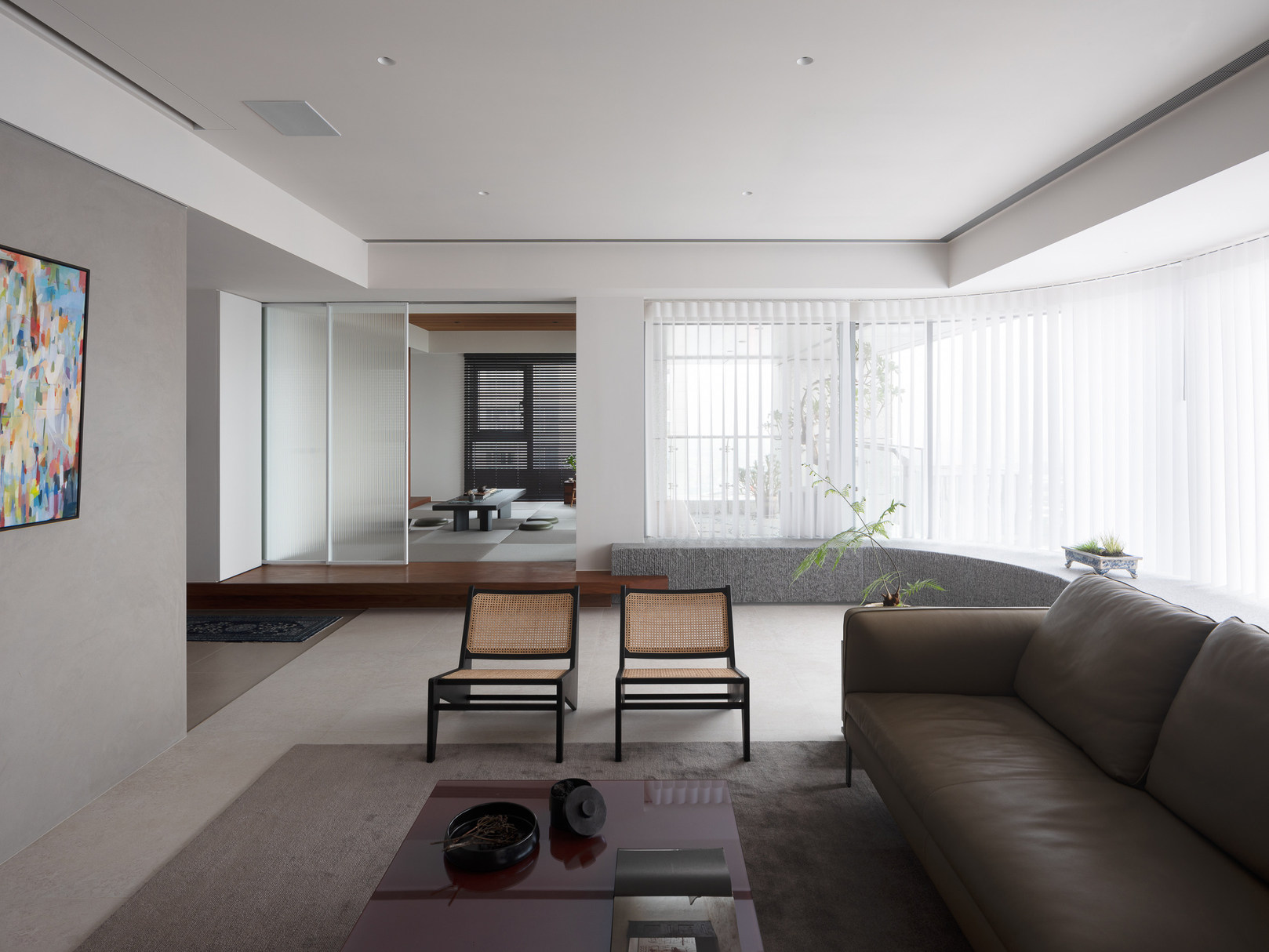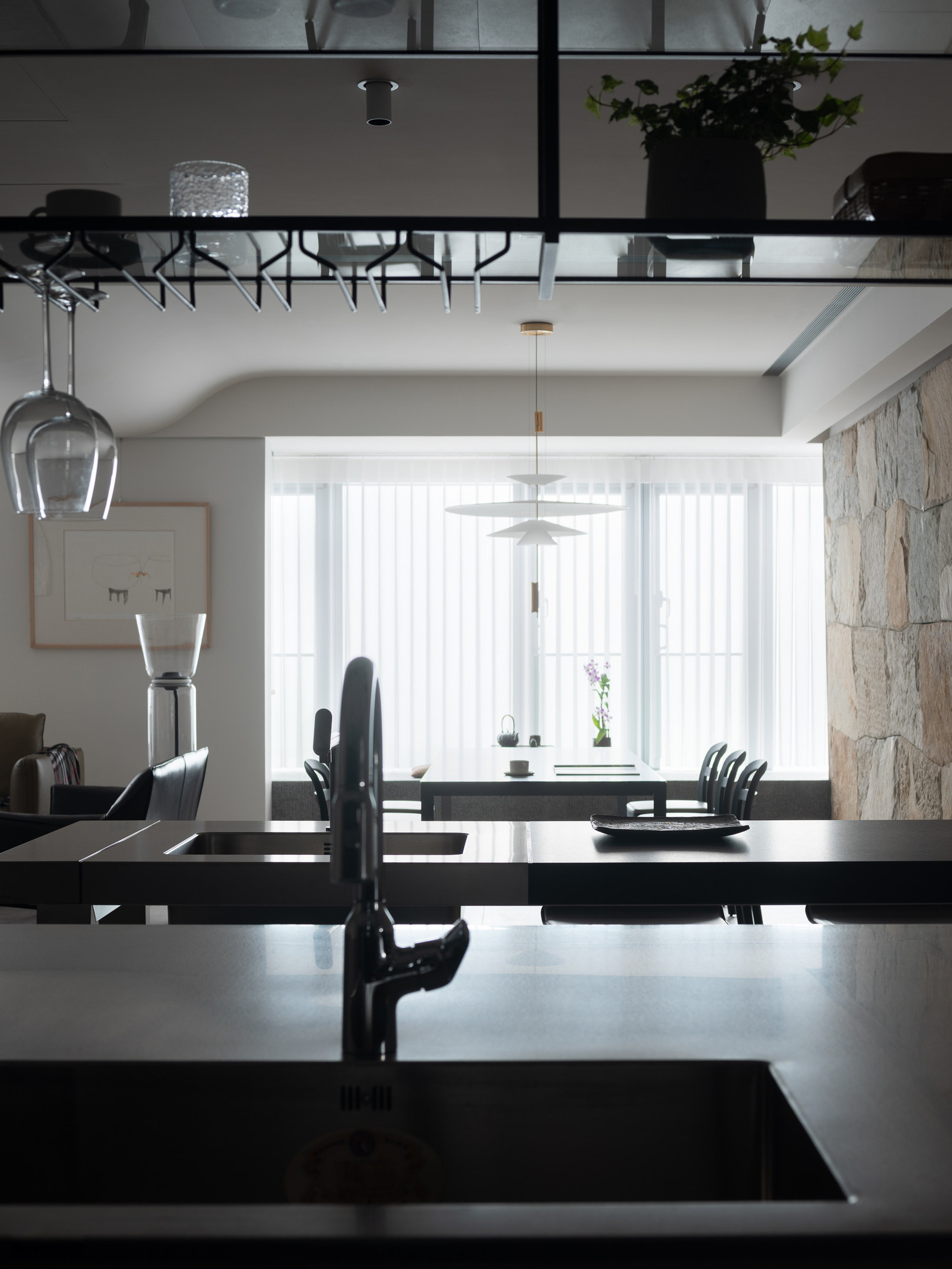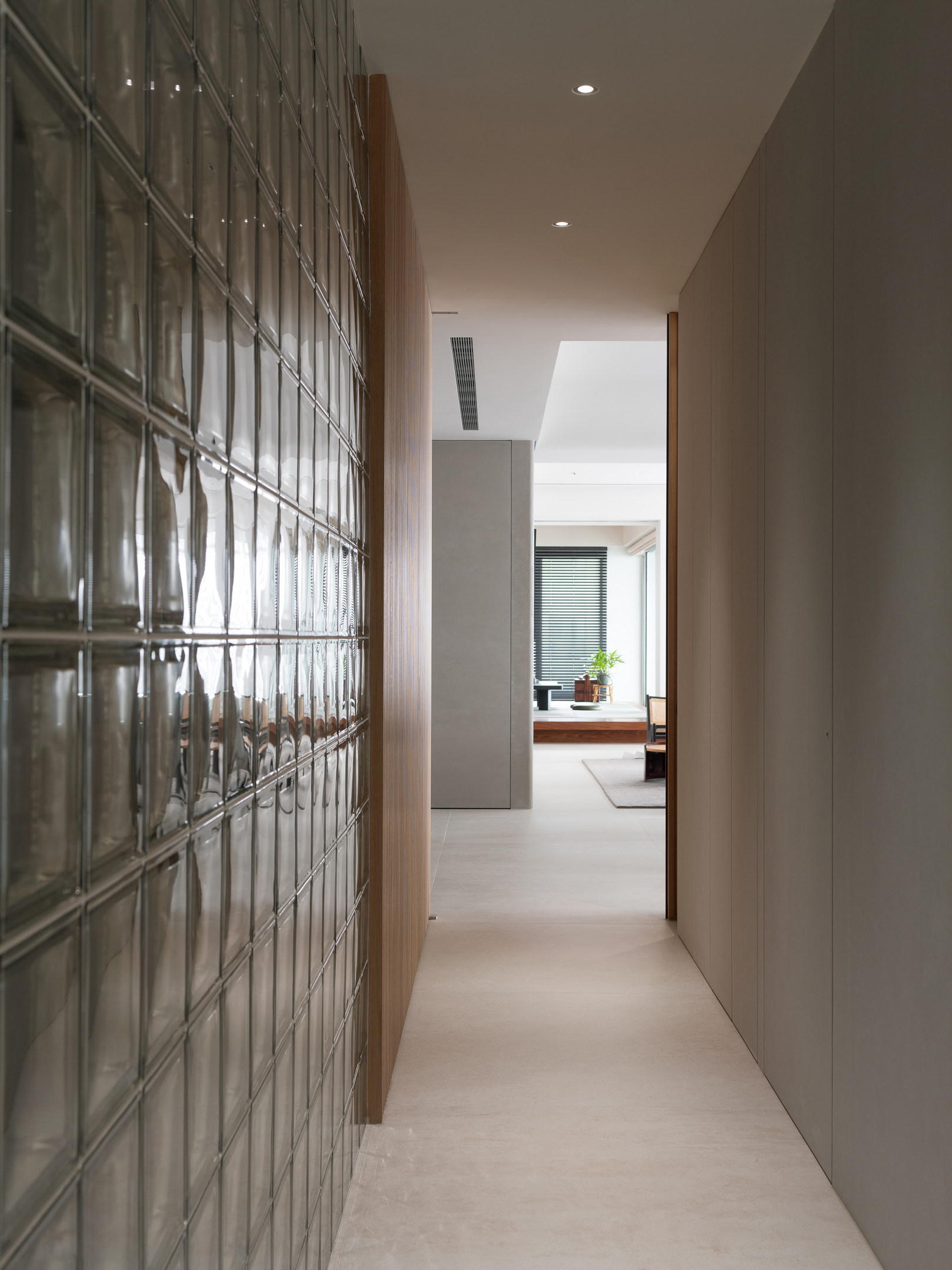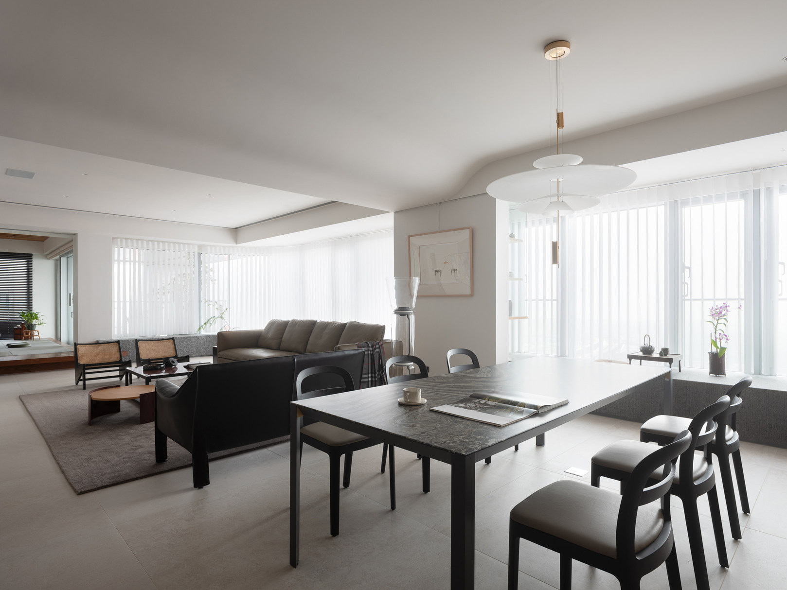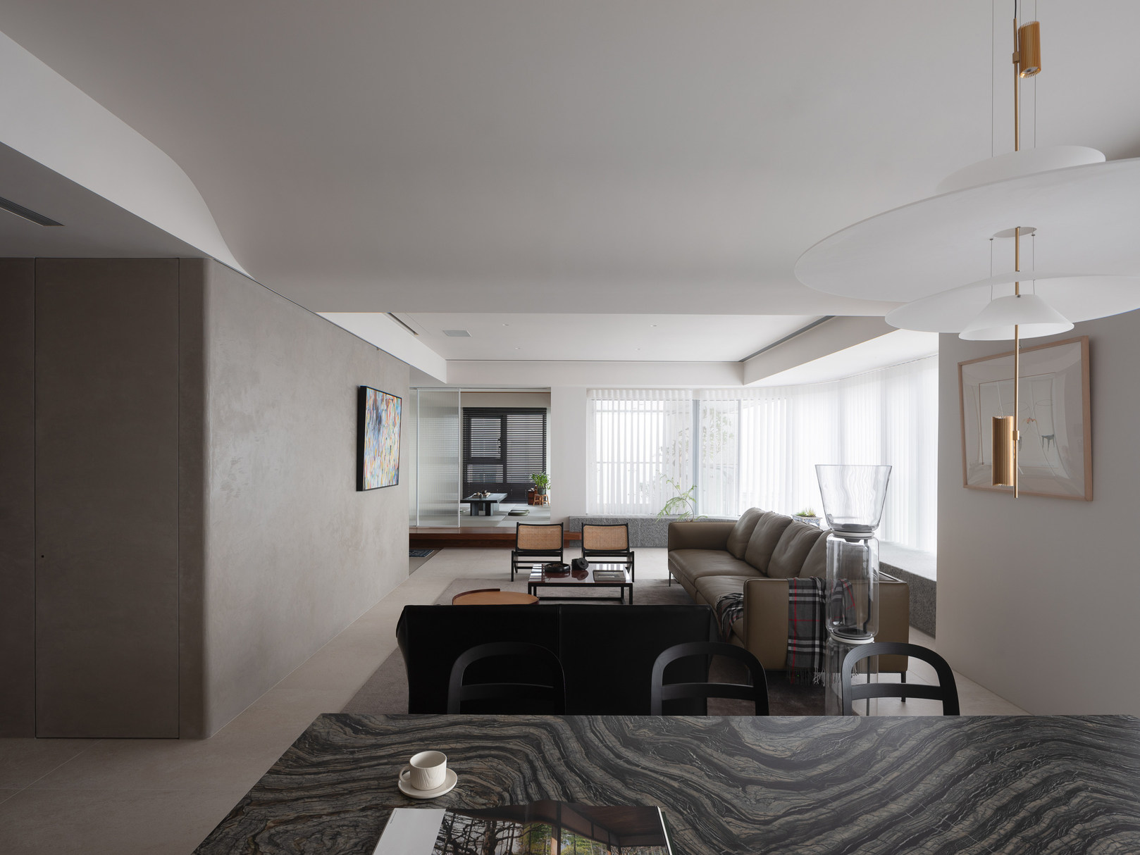 本次案例为新房装修项目。常住一家四口,在日常的生活中品质追求的比较高,喜好公共区域兼顾休闲娱乐一体化的功能。 屋主诉求: 对于家的设定,是想要一个明亮干净,且能满足居家办公需求,储物收纳合理整洁,适合自己的生活方式的环境。对于整体设计追求空间的明亮,即使有时候一个人独处时间长,也不会觉得压抑,享受温暖舒适的氛围。并且还对茶室书房有一定·的要求,希望能够充分打造艺术氛围。 针对屋主的需求,我们以时下最为流行的现代风为基础,不断加入屋主所喜爱的艺术元素与自身的绘画作品,并在软装的选择上注重质感,细节之处通过原木大理石等营造随性洒脱的氛围。而对于局部巧设地台与茶室进行有效连接,过道处通过水纹玻璃,原木格栅等配置营造出一个温暖的,时髦的,有人情味的居住空间。同时根据屋主的爱好,将书房更趋向于画室的设计,使每一寸空间都得到最大的发挥 户型图 1.阳台纳入室内,大竖厅布局,地台+落地窗的形式展现,让空间采光以及通透性得到最优化。 2.双卫生间设计,提升屋主的生活质量。 3.厨房与餐厅的部分做了一个融合的设计,能最大程度利用有限的空间以打造开阔的视野。 4.设置独立书房满足屋主日常学习绘画,增设茶室构筑多元化的家居体验。 #平面布置图#户型图 玄关 玄关入户后,是一个开放式的区域,视野直通阳台。采用哑光地砖通铺,强调出独立功能区域的同时随之弥漫开来的是空间层次感。两侧搭配嵌入式玄关柜,满足日常收纳需求,删繁就简的几何设计理念贯穿整个空间 #玄关#玄关柜#地砖 客厅 木质,艺术漆,棉麻,皮革,绿植,用细节给居住者以充盈的感官体验。独立又充满联结的空间结构,营造出更好的互动性与社交可能。考虑到屋主并不打算放置电视,于是我们放弃了安置传统机柜组合,依照屋主追求的艺术氛围,在墙上悬挂了一幅屋主最为满意的手绘画作,四周墙面也均做了留白处理,以灰作为打底色后为软装的搭配衍生出更多可能。 #客厅#挂画#绿植#客厅设计 客厅大面积的留白与层次递进,呈现恰到好处的以简驭繁。沙发选择模块沙发,柔软的坐垫,简洁流畅的线条结合深色系的地毯,两张单人椅的加入营造出围合式的氛围,为空间装饰增添丰富的层次感和视觉深度。大理石茶几居于中央,深色调营造低调内敛的空间语境。 #客厅#沙发#茶几#地毯 来到客厅,交界处抬高地台,无声的过渡着空间,突出客厅区域。顺着地台流畅的弧形,前进至另一侧墙体,完美衔接过渡,在“直曲”的碰撞中,把存储收纳与视觉延申的双重功能收入空间。灰色地砖通铺,在不同光照条件下,灰呈现出不一样的色感,哑光的肌理在不经意间释放出岁月缓缓流逝的氛围感。顶部保留原始层高,做边吊+无主灯设计,四周嵌入筒灯,为客厅空间呈现独家的光影变化。 #客厅#地砖#地台 餐厅 一张长方形的大理石餐桌放置在沙发后面,两侧搭配同色系的靠背餐椅,软糯的坐垫与弧形的构造为空间增添了一份舒适和稳重。上方装置了一盏奶油质感的吊灯,花朵的设计外观,加上双层样式的落定减轻繁重的感觉,不经意的点亮桌面。 客厅与餐厅动线空间充足灵活,所占空间位置相对舒适自由,两个区域相互借用空间,紧密沟通彼此串联,展现整体风格。餐桌依靠阳台得到全新的采光效果,各功能区域之间的互通与共融,让家的氛围在流动,共享之中,四溢的不仅仅是食物的香气,更有温情的流淌。 #餐厅#客餐一体#餐桌#吊灯 设计注重户外与自然的无缝连接,将阳台巧妙改造,打造地台。选用了冷冽的大理石,颜色与纹理与整体空间色调保持和谐。周围配置了茶具,软垫,使之成为了一处远离喧嚣,静谧惬意的品茶角落。 #餐厅#地台#茶具 厨房 厨房遵循简约至上的理念,高级的灰与凝练的黑相得益彰。减少墙体之间的隔断,采用开放式的设计在视觉上增加松弛的维度。精心挑选的橱柜,岛台,创造出既具现代简约的气质又充满烹饪趣味的厨房空间,无不体现着屋主对于餐厨空间的考究。左侧的一字型储物柜则起到了收纳的作用,嵌入墙体,灰色的肌理在视觉上清爽干净。 #厨房#橱柜#储物柜#岛台 休闲区 借助建筑语言,套景手法,令客厅和茶室发挥着枢纽过渡的属性,在方圆中映入室内空间。榻榻米茶室更加还原中式茶文化的氛围与韵味,地面抬高,强化领域感。摆设茶桌,茶具与坐垫,燃一炷香,煮一壶茶,可以获得全身心的放松。 #茶室#地台#茶桌#坐垫 茶室内部整体以高级黑为主,木饰面吊顶在空间画出一道泾渭分明的线,真实细腻的材质纹理,配以素雅的国画作品与整个空间主题相容。融入绿植小景,营造东方美学气质,气韵生动的贯穿整个空间清雅古朴,情趣盎然。 #茶室#木饰面 过道 过道是家中风格的完美体现,木与白色的交织极简的手法内嵌式筒灯构建出简约小天地耐人寻味。将过道在原有尺度的基础上面进行扩大,打造成特色的艺术走廊,与餐厨连接,共同织就了一个别具一格的十字形公共空间布局。原木格栅墙面过渡自然消弭尖角提高空间安全性,实现黄金比例优化细节,层次分明。 #过道#格栅#墙面 为实现从公区到卧室的过渡,采用过道将两者建立分割线。一条主轴线顺畅关联起各功能分区,左侧墙体打通后砌上一块块通透明亮的水纹玻璃,波光粼粼围合整体空间,弱化空间强硬感,渲染出朦胧含蓄的雅致氛围。通铺的微水泥地砖与墙面呈现出原始