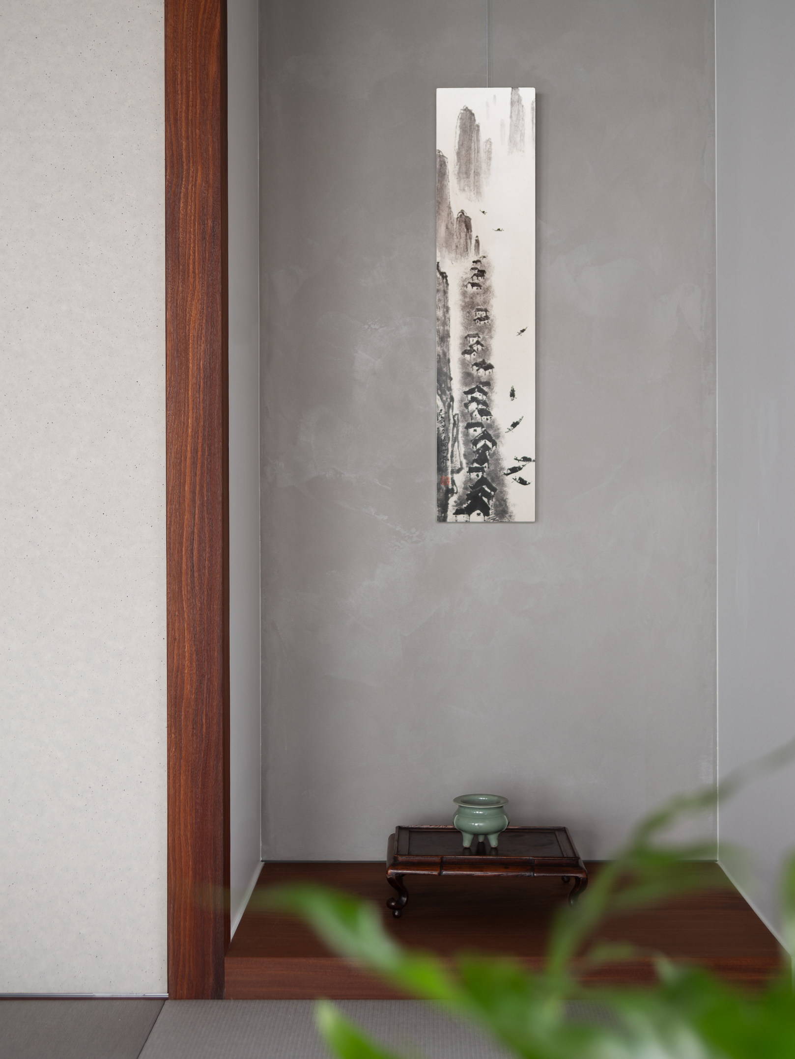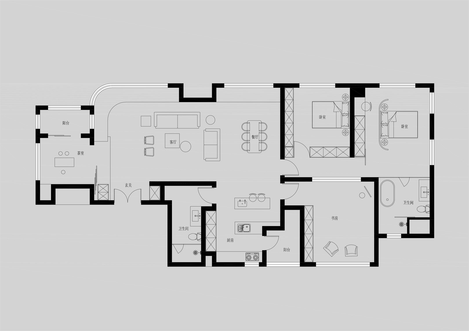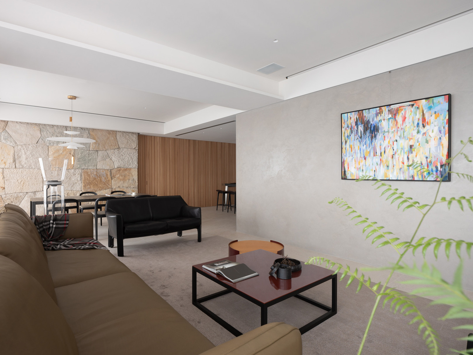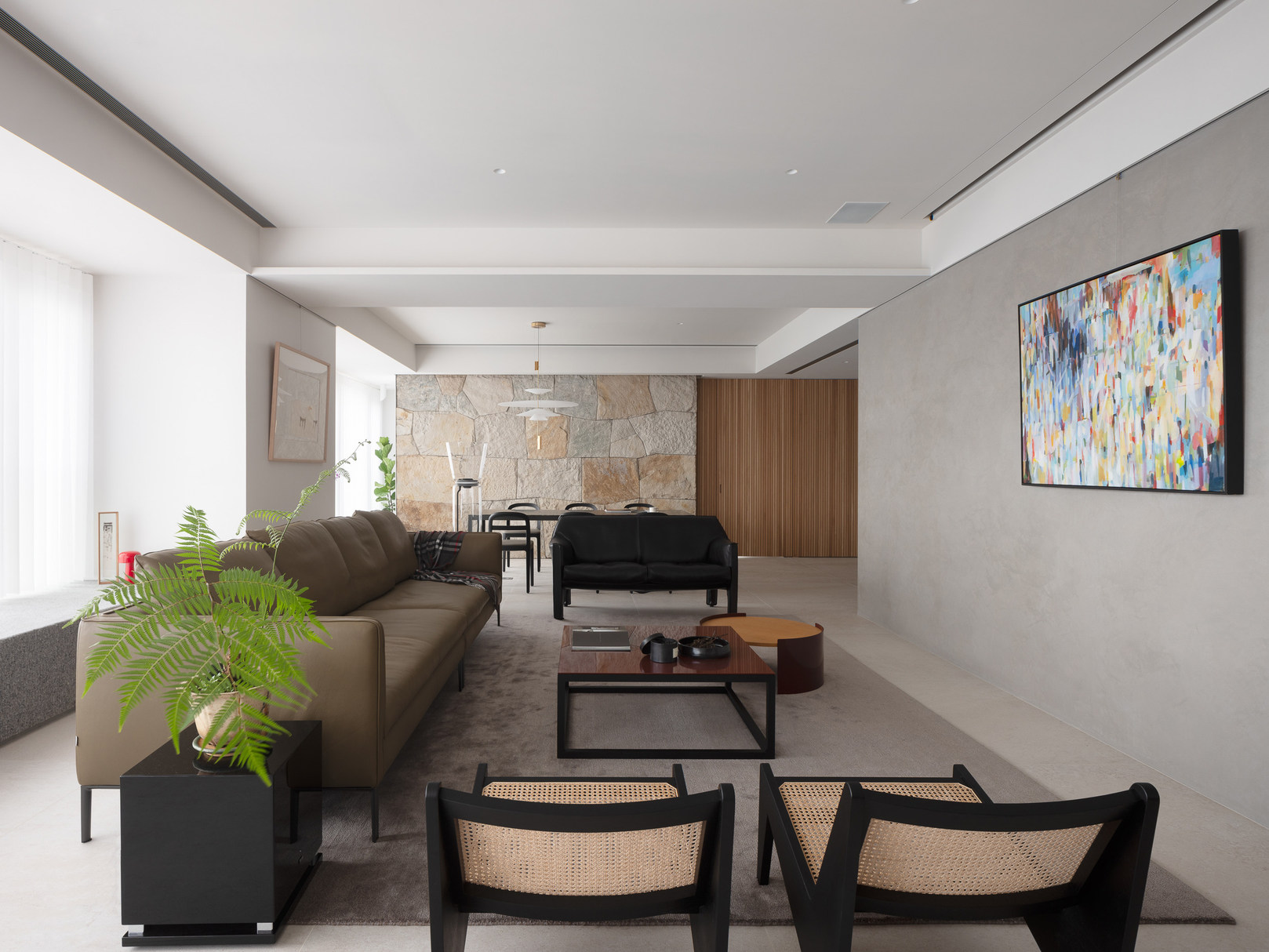 本次案例为新房装修项目。常住一家四口,在日常的生活中品质追求的比较高,喜好公共区域兼顾休闲娱乐一体化的功能。 屋主诉求: 对于家的设定,是想要一个明亮干净,且能满足居家办公需求,储物收纳合理整洁,适合自己的生活方式的环境。对于整体设计追求空间的明亮,即使有时候一个人独处时间长,也不会觉得压抑,享受温暖舒适的氛围。并且还对茶室书房有一定·的要求,希望能够充分打造艺术氛围。 针对屋主的需求,我们以时下最为流行的现代风为基础,不断加入屋主所喜爱的艺术元素与自身的绘画作品,并在软装的选择上注重质感,细节之处通过原木大理石等营造随性洒脱的氛围。而对于局部巧设地台与茶室进行有效连接,过道处通过水纹玻璃,原木格栅等配置营造出一个温暖的,时髦的,有人情味的居住空间。同时根据屋主的爱好,将书房更趋向于画室的设计,使每一寸空间都得到最大的发挥 户型图 1.阳台纳入室内,大竖厅布局,地台+落地窗的形式展现,让空间采光以及通透性得到最优化。 2.双卫生间设计,提升屋主的生活质量。 3.厨房与餐厅的部分做了一个融合的设计,能最大程度利用有限的空间以打造开阔的视野。 4.设置独立书房满足屋主日常学习绘画,增设茶室构筑多元化的家居体验。 #平面布置图#户型图 玄关 玄关入户后,是一个开放式的区域,视野直通阳台。采用哑光地砖通铺,强调出独立功能区域的同时随之弥漫开来的是空间层次感。两侧搭配嵌入式玄关柜,满足日常收纳需求,删繁就简的几何设计理念贯穿整个空间 #玄关#玄关柜#地砖 客厅 木质,艺术漆,棉麻,皮革,绿植,用细节给居住者以充盈的感官体验。独立又充满联结的空间结构,营造出更好的互动性与社交可能。考虑到屋主并不打算放置电视,于是我们放弃了安置传统机柜组合,依照屋主追求的艺术氛围,在墙上悬挂了一幅屋主最为满意的手绘画作,四周墙面也均做了留白处理,以灰作为打底色后为软装的搭配衍生出更多可能。 #客厅#挂画#绿植#客厅设计 客厅大面积的留白与层次递进,呈现恰到好处的以简驭繁。沙发选择模块沙发,柔软的坐垫,简洁流畅的线条结合深色系的地毯,两张单人椅的加入营造出围合式的氛围,为空间装饰增添丰富的层次感和视觉深度。大理石茶几居于中央,深色调营造低调内敛的空间语境。 #客厅#沙发#茶几#地毯 来到客厅,交界处抬高地台,无声的过渡着空间,突出客厅区域。顺着地台流畅的弧形,前进至另一侧墙体,完美衔接过渡,在“直曲”的碰撞中,把存储收纳与视觉延申的双重功能收入空间。灰色地砖通铺,在不同光照条件下,灰呈现出不一样的色感,哑光的肌理在不经意间释放出岁月缓缓流逝的氛围感。顶部保留原始层高,做边吊+无主灯设计,四周嵌入筒灯,为客厅空间呈现独家的光影变化。 #客厅#地砖#地台 餐厅 一张长方形的大理石餐桌放置在沙发后面,两侧搭配同色系的靠背餐椅,软糯的坐垫与弧形的构造为空间增添了一份舒适和稳重。上方装置了一盏奶油质感的吊灯,花朵的设计外观,加上双层样式的落定减轻繁重的感觉,不经意的点亮桌面。 客厅与餐厅动线空间充足灵活,所占空间位置相对舒适自由,两个区域相互借用空间,紧密沟通彼此串联,展现整体风格。餐桌依靠阳台得到全新的采光效果,各功能区域之间的互通与共融,让家的氛围在流动,共享之中,四溢的不仅仅是食物的香气,更有温情的流淌。 #餐厅#客餐一体#餐桌#吊灯 设计注重户外与自然的无缝连接,将阳台巧妙改造,打造地台。选用了冷冽的大理石,颜色与纹理与整体空间色调保持和谐。周围配置了茶具,软垫,使之成为了一处远离喧嚣,静谧惬意的品茶角落。 #餐厅#地台#茶具 厨房 厨房遵循简约至上的理念,高级的灰与凝练的黑相得益彰。减少墙体之间的隔断,采用开放式的设计在视觉上增加松弛的维度。精心挑选的橱柜,岛台,创造出既具现代简约的气质又充满烹饪趣味的厨房空间,无不体现着屋主对于餐厨空间的考究。左侧的一字型储物柜则起到了收纳的作用,嵌入墙体,灰色的肌理在视觉上清爽干净。 #厨房#橱柜#储物柜#岛台 休闲区 借助建筑语言,套景手法,令客厅和茶室发挥着枢纽过渡的属性,在方圆中映入室内空间。榻榻米茶室更加还原中式茶文化的氛围与韵味,地面抬高,强化领域感。摆设茶桌,茶具与坐垫,燃一炷香,煮一壶茶,可以获得全身心的放松。 #茶室#地台#茶桌#坐垫 茶室内部整体以高级黑为主,木饰面吊顶在空间画出一道泾渭分明的线,真实细腻的材质纹理,配以素雅的国画作品与整个空间主题相容。融入绿植小景,营造东方美学气质,气韵生动的贯穿整个空间清雅古朴,情趣盎然。 #茶室#木饰面 过道 过道是家中风格的完美体现,木与白色的交织极简的手法内嵌式筒灯构建出简约小天地耐人寻味。将过道在原有尺度的基础上面进行扩大,打造成特色的艺术走廊,与餐厨连接,共同织就了一个别具一格的十字形公共空间布局。原木格栅墙面过渡自然消弭尖角提高空间安全性,实现黄金比例优化细节,层次分明。 #过道#格栅#墙面 为实现从公区到卧室的过渡,采用过道将两者建立分割线。一条主轴线顺畅关联起各功能分区,左侧墙体打通后砌上一块块通透明亮的水纹玻璃,波光粼粼围合整体空间,弱化空间强硬感,渲染出朦胧含蓄的雅致氛围。通铺的微水泥地砖与墙面呈现出原始