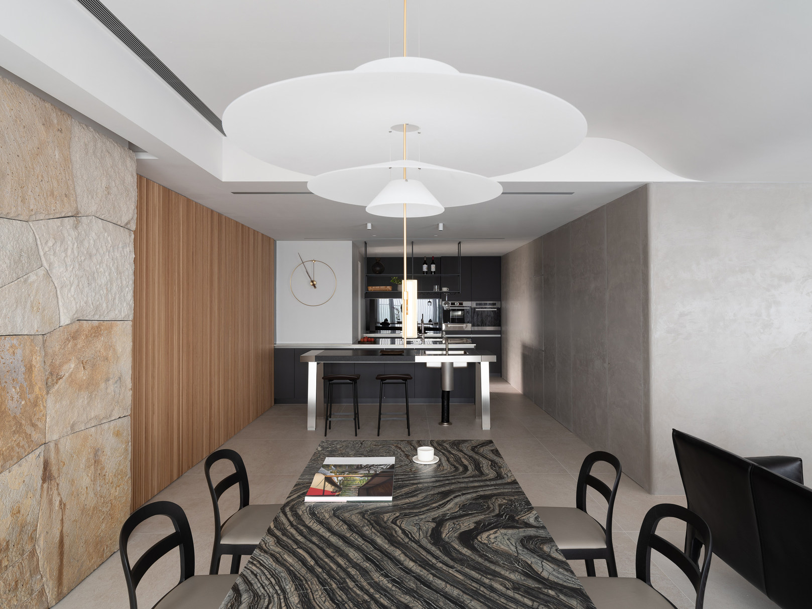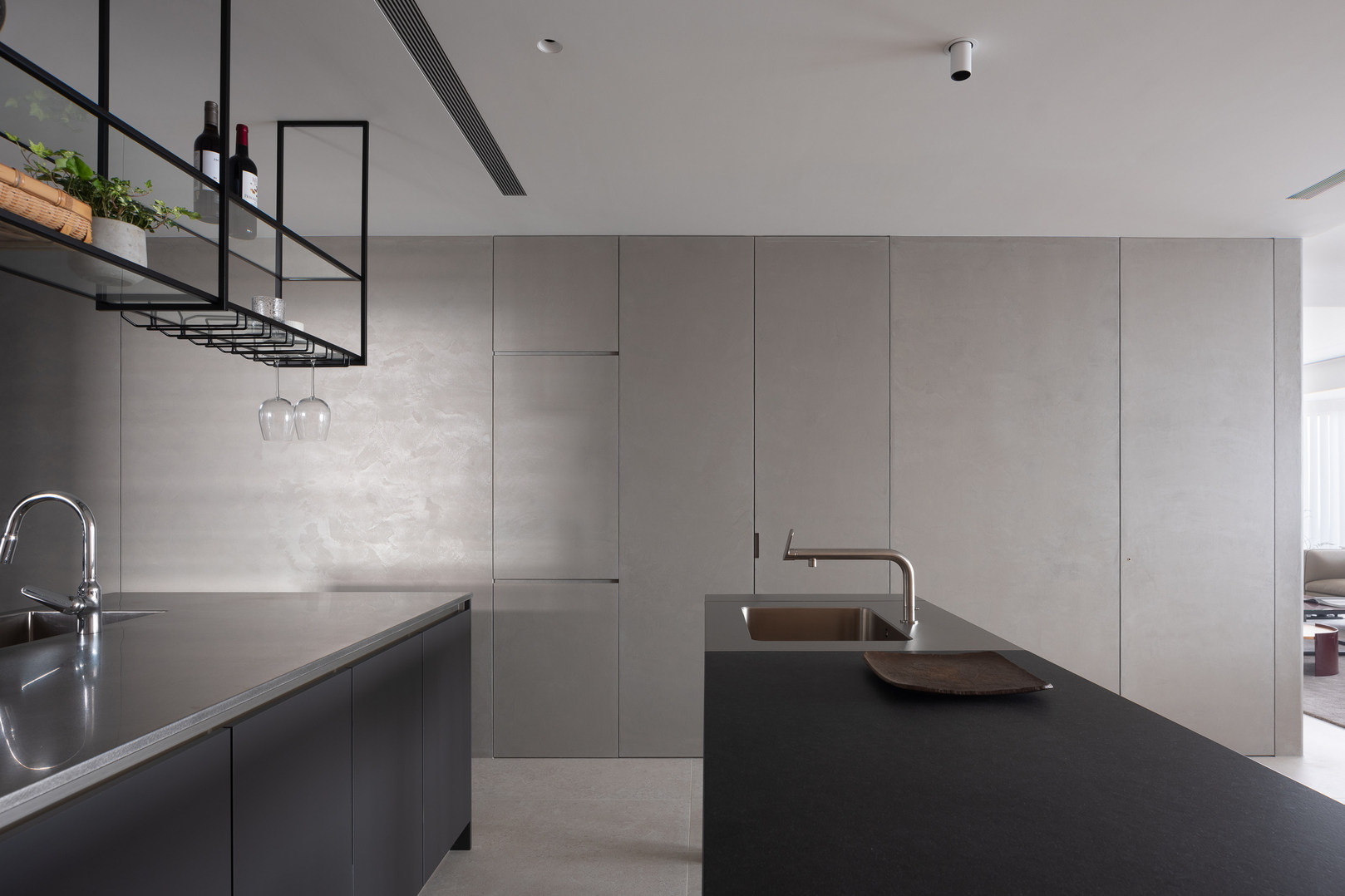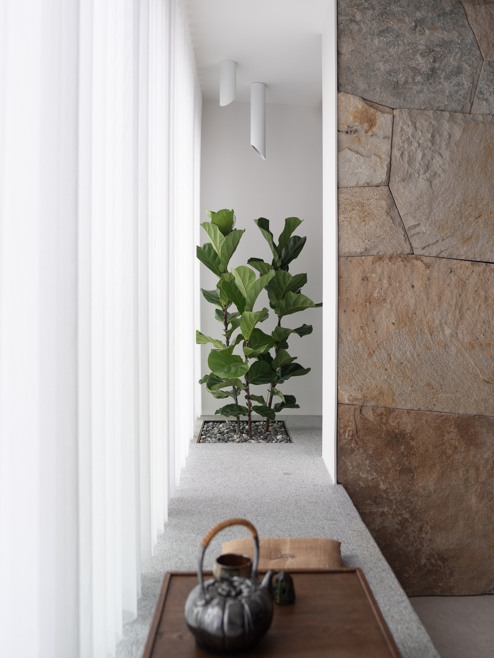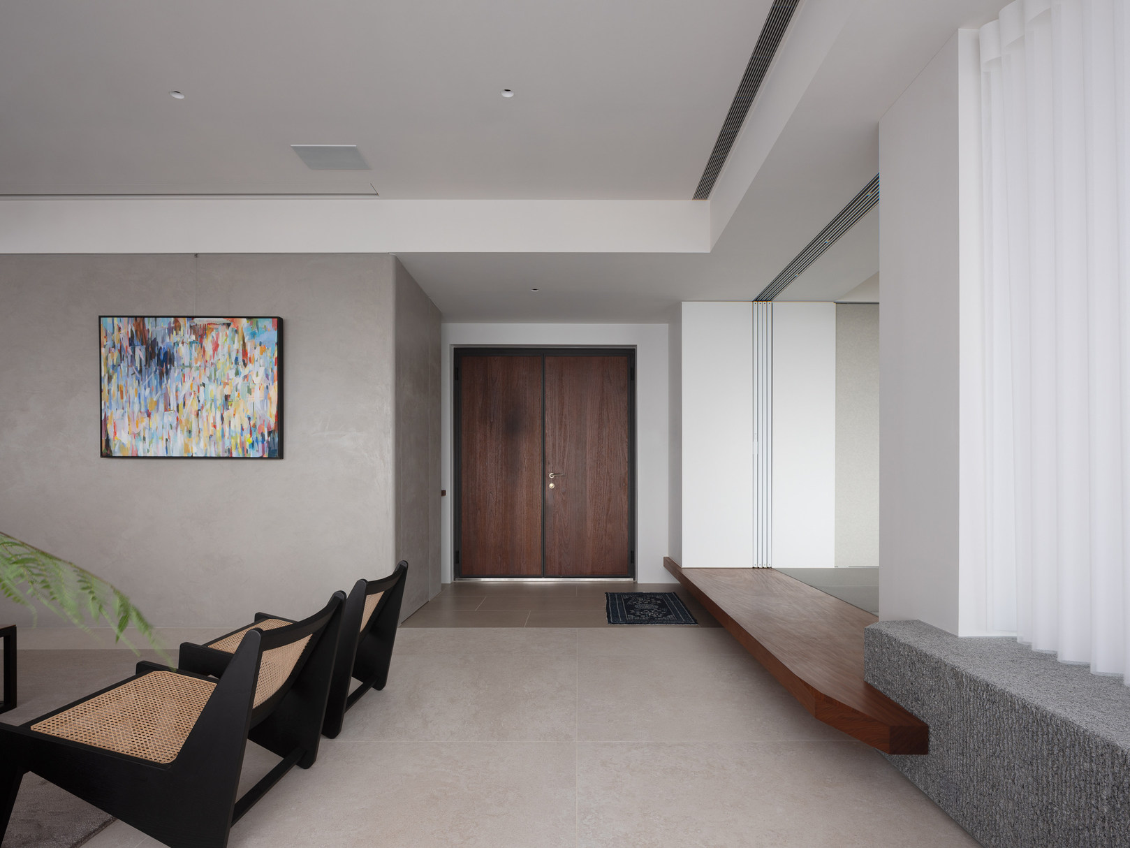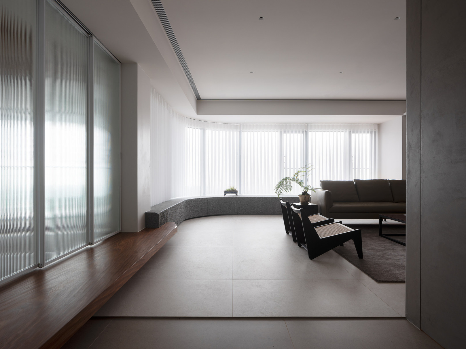 本次案例为新房装修项目。常住一家四口,在日常的生活中品质追求的比较高,喜好公共区域兼顾休闲娱乐一体化的功能。 屋主诉求: 对于家的设定,是想要一个明亮干净,且能满足居家办公需求,储物收纳合理整洁,适合自己的生活方式的环境。对于整体设计追求空间的明亮,即使有时候一个人独处时间长,也不会觉得压抑,享受温暖舒适的氛围。并且还对茶室书房有一定·的要求,希望能够充分打造艺术氛围。 针对屋主的需求,我们以时下最为流行的现代风为基础,不断加入屋主所喜爱的艺术元素与自身的绘画作品,并在软装的选择上注重质感,细节之处通过原木大理石等营造随性洒脱的氛围。而对于局部巧设地台与茶室进行有效连接,过道处通过水纹玻璃,原木格栅等配置营造出一个温暖的,时髦的,有人情味的居住空间。同时根据屋主的爱好,将书房更趋向于画室的设计,使每一寸空间都得到最大的发挥 户型图 1.阳台纳入室内,大竖厅布局,地台+落地窗的形式展现,让空间采光以及通透性得到最优化。 2.双卫生间设计,提升屋主的生活质量。 3.厨房与餐厅的部分做了一个融合的设计,能最大程度利用有限的空间以打造开阔的视野。 4.设置独立书房满足屋主日常学习绘画,增设茶室构筑多元化的家居体验。 #平面布置图#户型图 玄关 玄关入户后,是一个开放式的区域,视野直通阳台。采用哑光地砖通铺,强调出独立功能区域的同时随之弥漫开来的是空间层次感。两侧搭配嵌入式玄关柜,满足日常收纳需求,删繁就简的几何设计理念贯穿整个空间 #玄关#玄关柜#地砖 客厅 木质,艺术漆,棉麻,皮革,绿植,用细节给居住者以充盈的感官体验。独立又充满联结的空间结构,营造出更好的互动性与社交可能。考虑到屋主并不打算放置电视,于是我们放弃了安置传统机柜组合,依照屋主追求的艺术氛围,在墙上悬挂了一幅屋主最为满意的手绘画作,四周墙面也均做了留白处理,以灰作为打底色后为软装的搭配衍生出更多可能。 #客厅#挂画#绿植#客厅设计 客厅大面积的留白与层次递进,呈现恰到好处的以简驭繁。沙发选择模块沙发,柔软的坐垫,简洁流畅的线条结合深色系的地毯,两张单人椅的加入营造出围合式的氛围,为空间装饰增添丰富的层次感和视觉深度。大理石茶几居于中央,深色调营造低调内敛的空间语境。 #客厅#沙发#茶几#地毯 来到客厅,交界处抬高地台,无声的过渡着空间,突出客厅区域。顺着地台流畅的弧形,前进至另一侧墙体,完美衔接过渡,在“直曲”的碰撞中,把存储收纳与视觉延申的双重功能收入空间。灰色地砖通铺,在不同光照条件下,灰呈现出不一样的色感,哑光的肌理在不经意间释放出岁月缓缓流逝的氛围感。顶部保留原始层高,做边吊+无主灯设计,四周嵌入筒灯,为客厅空间呈现独家的光影变化。 #客厅#地砖#地台 餐厅 一张长方形的大理石餐桌放置在沙发后面,两侧搭配同色系的靠背餐椅,软糯的坐垫与弧形的构造为空间增添了一份舒适和稳重。上方装置了一盏奶油质感的吊灯,花朵的设计外观,加上双层样式的落定减轻繁重的感觉,不经意的点亮桌面。 客厅与餐厅动线空间充足灵活,所占空间位置相对舒适自由,两个区域相互借用空间,紧密沟通彼此串联,展现整体风格。餐桌依靠阳台得到全新的采光效果,各功能区域之间的互通与共融,让家的氛围在流动,共享之中,四溢的不仅仅是食物的香气,更有温情的流淌。 #餐厅#客餐一体#餐桌#吊灯 设计注重户外与自然的无缝连接,将阳台巧妙改造,打造地台。选用了冷冽的大理石,颜色与纹理与整体空间色调保持和谐。周围配置了茶具,软垫,使之成为了一处远离喧嚣,静谧惬意的品茶角落。 #餐厅#地台#茶具 厨房 厨房遵循简约至上的理念,高级的灰与凝练的黑相得益彰。减少墙体之间的隔断,采用开放式的设计在视觉上增加松弛的维度。精心挑选的橱柜,岛台,创造出既具现代简约的气质又充满烹饪趣味的厨房空间,无不体现着屋主对于餐厨空间的考究。左侧的一字型储物柜则起到了收纳的作用,嵌入墙体,灰色的肌理在视觉上清爽干净。 #厨房#橱柜#储物柜#岛台 休闲区 借助建筑语言,套景手法,令客厅和茶室发挥着枢纽过渡的属性,在方圆中映入室内空间。榻榻米茶室更加还原中式茶文化的氛围与韵味,地面抬高,强化领域感。摆设茶桌,茶具与坐垫,燃一炷香,煮一壶茶,可以获得全身心的放松。 #茶室#地台#茶桌#坐垫 茶室内部整体以高级黑为主,木饰面吊顶在空间画出一道泾渭分明的线,真实细腻的材质纹理,配以素雅的国画作品与整个空间主题相容。融入绿植小景,营造东方美学气质,气韵生动的贯穿整个空间清雅古朴,情趣盎然。 #茶室#木饰面 过道 过道是家中风格的完美体现,木与白色的交织极简的手法内嵌式筒灯构建出简约小天地耐人寻味。将过道在原有尺度的基础上面进行扩大,打造成特色的艺术走廊,与餐厨连接,共同织就了一个别具一格的十字形公共空间布局。原木格栅墙面过渡自然消弭尖角提高空间安全性,实现黄金比例优化细节,层次分明。 #过道#格栅#墙面 为实现从公区到卧室的过渡,采用过道将两者建立分割线。一条主轴线顺畅关联起各功能分区,左侧墙体打通后砌上一块块通透明亮的水纹玻璃,波光粼粼围合整体空间,弱化空间强硬感,渲染出朦胧含蓄的雅致氛围。通铺的微水泥地砖与墙面呈现出原始