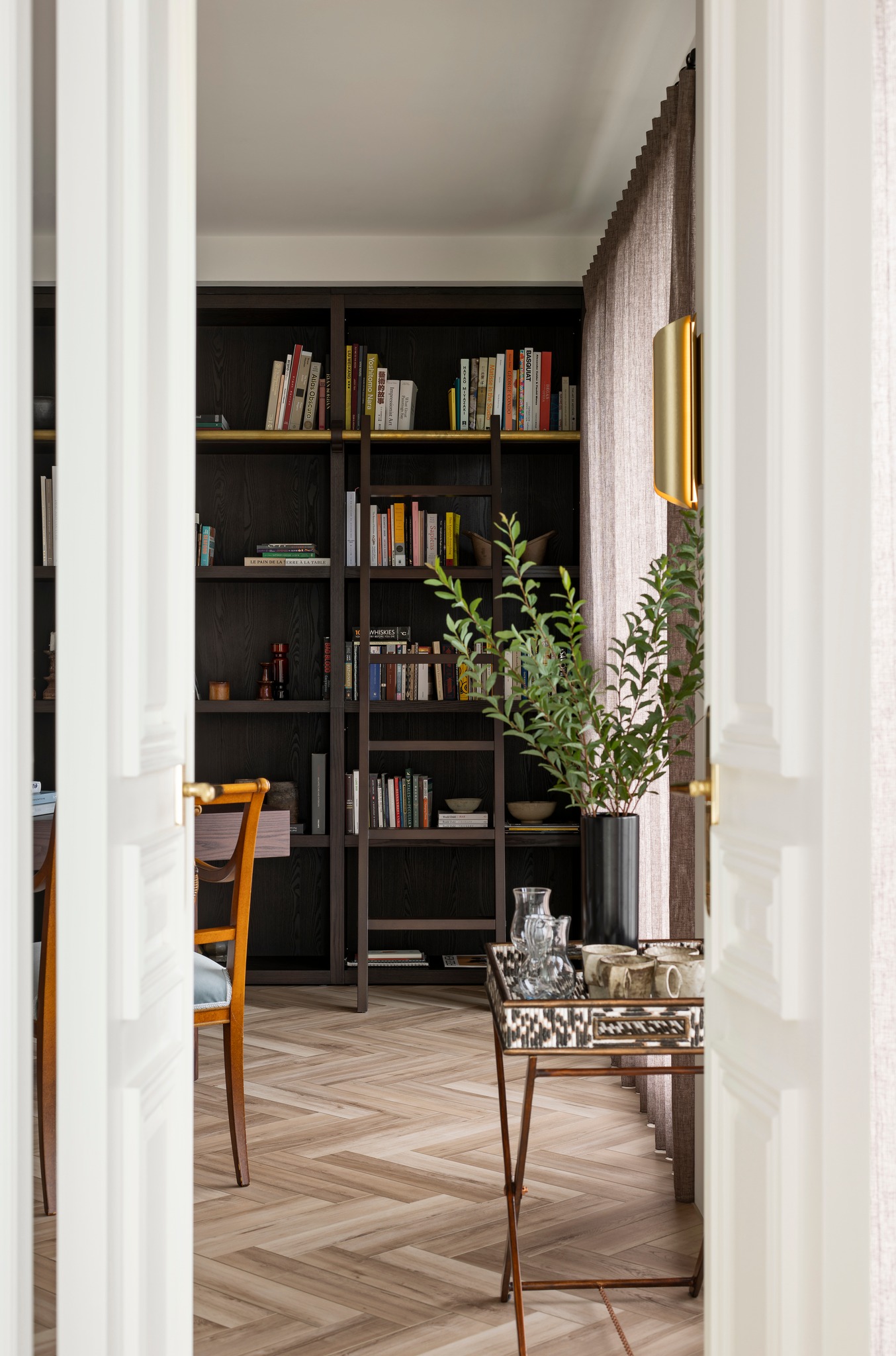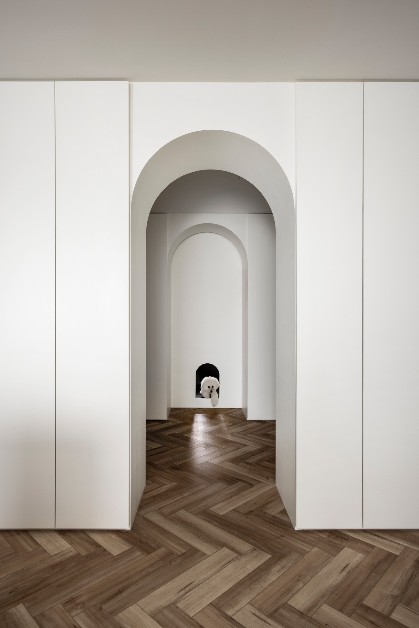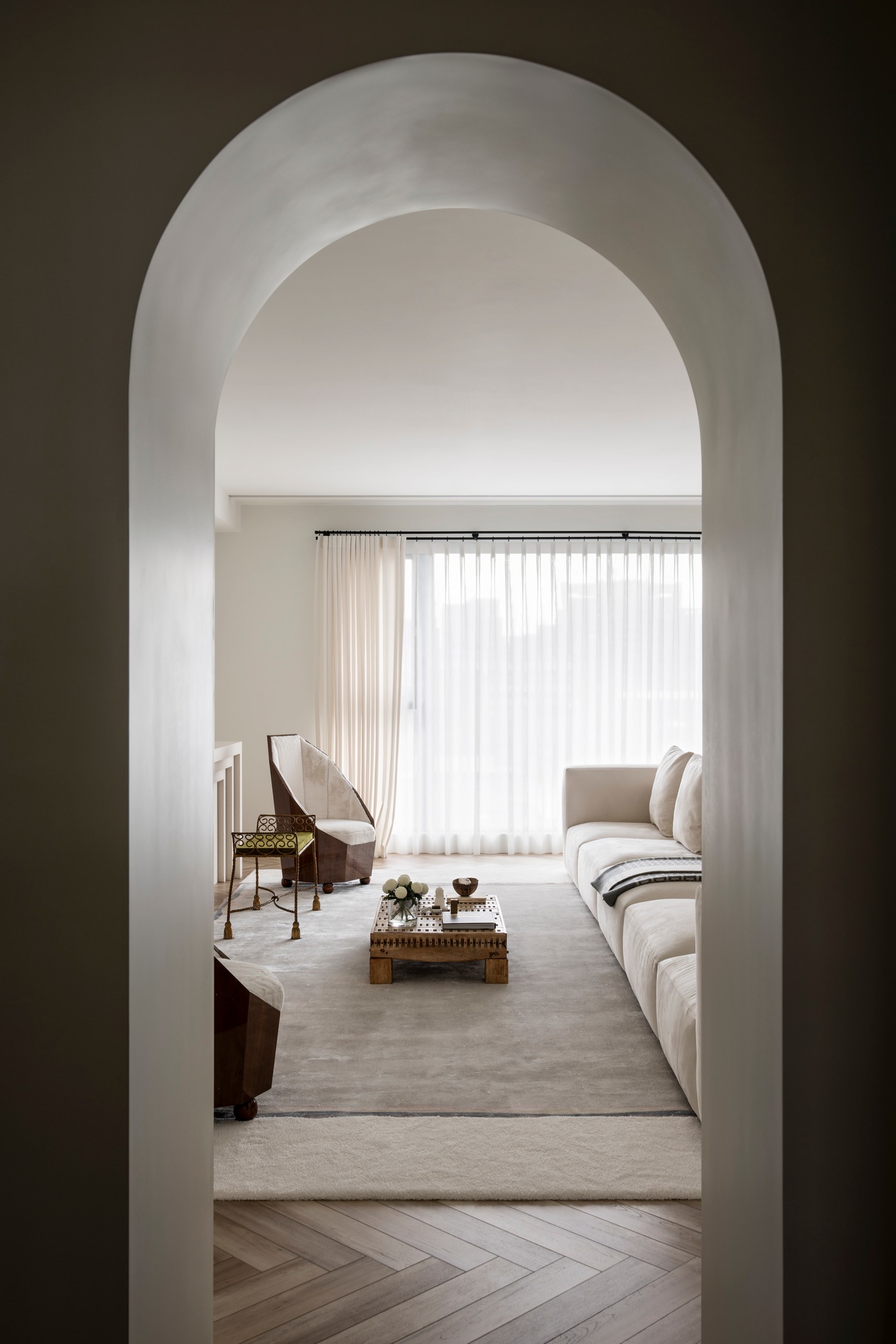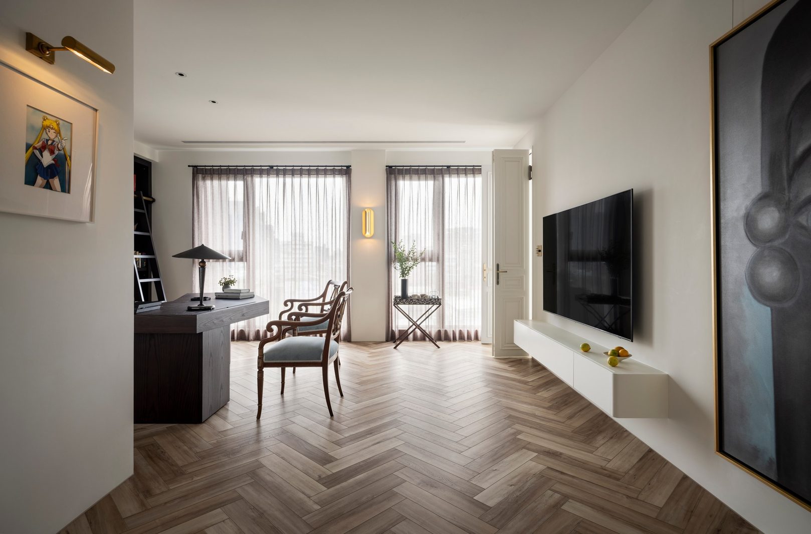 本期案例为新房装修项目,屋主是一名医生,喜爱偏法式风格,但又希望空间不拘泥于单一风格,能够在单一的本质中,享受带出多元的面貌。构建一个浪漫家园。 屋主诉求: 屋主对于房屋的规划,既要满足家居整体氛围优雅浪漫,其次又要兼具实用性需求。在与屋主深入沟通后了解到屋主喜欢法式的浪漫与温柔,原木的温润与自然,风格多变。希望在工作之余能有一个喜欢的氛围以供休憩。我们选择以混搭作为全屋设计方向,通过深浅进退的线条、充满个性的家具拣选,古典元素与现代美学之间的冲击与对比,构造满足屋主诉求的多元风格。满足风格的基础上保证储物空间。 我们以法式、原木、轻奢相搭配,根据业主的兴趣爱好和生活习惯,将空间的墙体进行拆改,通铺原木地板为业主打造出一个开放兼质感的气质之家。让屋主在忙碌一天回到家之后,可以卸下全身心的疲惫,从而与这个家融为一体,安稳宁静的世外桃源,则是心灵的栖息地。 户型图 1.客餐一体打造互联共通格局组合公区功能,封闭式厨房+吧台外置满足不同使用需求,补充厨房操作空间进一步完善洄游动线促进空间的连贯性。 2.独立书房增加电视,区别与传统书房的学习办公功能,更具休闲性。 3.大量设置通顶定制储物柜扩大家中储物功能。 4.阳台纳入客厅做整体规划,拓宽公共活动区设计面积,加之阳台的宽幅落地窗引入的大量光线,客厅更显通透宽敞; 玄关 玄关弧形门洞设计连接公区打破直线条硬朗感,增加视觉纵深丰富空间层次。柔美的拱型门洞搭配原木人字形地板,温润与柔美体现淋漓尽致。壁灯点缀点亮归家仪式感。墙面弧形镂空洞别出心裁,成为半密闭的过道空间的绝妙联动端口,突破秩序营造美感,在简单之上将空间拉回另一个时空。 #玄关#拱形门洞#地板#壁灯 客厅 客厅以白色为基调透露出松弛优雅的氛围,原木地板带来温润质感,大胆运用线条元素为客厅注入轻法式浪漫感,米色布艺沙发柔软舒适满足多人落座,以舒适的坐感诠释着对生活品质的追求,米色地毯置于原木地板之上,减少生活噪音提升舒适脚感,浅色系搭配使得整体空间在视觉上更加柔和纯粹。 #客厅#沙发#地毯#地板 一道弧形拱门引入客厅,为空间注入弧形柔美。大尺度客厅保证了视野的开阔,巨大落地窗进一步打开客厅通透的阀门,搭配纱帘调节光感。原木轻奢单人椅正对沙发,选用轻巧灵动的藤编工艺茶几,点缀朴素敦实的空间语境,高度的颜色对比制造空间焦点,让人忍不住将视线定格于此,中古风美感尽显。不同物质在空间内穿插,每一处都是居者的生活写照,空间线条不拖泥带水共同构筑出明亮有序的舒适空间。 #客厅#落地窗#单人椅#弧形#边几 去电视设计于客厅添置壁炉,墙面硬朗的石膏线搭配壁炉体现工艺与艺术比例美学的雅致。壁炉上方台面加宽做收纳、展示,不同材质与线条为空间加上法式滤镜,古典气息与现代感的环境巧妙结合,使得整个空间散发法式风格独有的慵懒氛围。 #客厅#壁炉 餐厅 基于大平层次设计,客餐一体布局摒弃传统固化风格,糅合了法式、复古、时尚元素,用现代简约的设计手法呈现法式的优雅,实木餐桌、艺术吊灯、大理石、羊羔毛等不同质感重合交叠,空间在和谐统一的基础,上更具视觉层次感,自然细腻的肌理让用餐场域显得娴静而优雅。 #餐厅#客餐一体#吊灯#餐桌 深色原木餐桌承载起一家人的温馨时刻,长形餐桌可容纳多人用餐既不显得拥挤也不至于太过疏远,无论中餐、西餐完全适配。米色餐椅在具备舒适坐垫的同时也有着坚实的支撑力。原木的经久耐用会与时光一起历久弥新。法式吊灯既能作为空间中的艺术装置又为用餐提供良好照明。 #餐厅#餐桌#餐椅#吊灯 纯白的餐边柜搭配水墨大理石台面,消弭空间单调,提升整个空间的品质感和奢华感,满足收纳的同时集展示于一体。搭配水槽设计,拥有简单备餐功能,便于餐前餐后清洁。上方做大理石置物架,增加空间层次感。 #餐厅#餐边柜#大理石#置物架 大平层设计使得公区功能连贯,视野开阔。客餐一体布局搭配吧台,满足屋主多样化需求。背景墙定制整面收纳柜,柜面极简设计去掉多余的装饰利用石膏线勾勒出满目的法式风情,让这个区域散发出优雅精致的设计,左侧将重点落于收纳设置柜体以收纳厨房用具。 #餐厅#吧台#收纳柜#客餐一体 厨房 厨房惟妙惟肖的展现了法式、原木的治愈,纯白+奶油色橱柜吊柜描摹质感。原木台面耐用易清洁。中部釉砖打破单调的同时增加空间质感。一字型布局的厨房动线充分考虑到空间狭小的问题,将厨房空间最大发挥。 #厨房#橱柜#吊柜#台面 书房 书房设计别具一格,原木为主基调,典雅古朴气质贯穿于此。整体空间简单而不失质感,增加电视设计,寓静于动,让书房不仅是简单的书房,让线条与纹理进行理性而有序的视觉交叠,于新中式中流露出写意之美,古朴而简雅。打造沉浸式阅读空间,兼具功能性、颜值、收纳,大落地窗也让整个书房更贴合自然,采光通透。 #书房#电视#落地窗 沿墙定制整面的通顶书墙,深色原木再加上满墙书香气的加持,有一种别样的高阶美,扶梯设计方便上下拿取书籍,书柜注重实用性和美观性的结合,拥有丰富的储物空间,开放格设计满足储存和展示的各种需求。书柜前设置--张宽大的胡桃木大书桌,满足办公、会客、学习,皮质座椅兼具舒适的同时增加轻奢质感。 