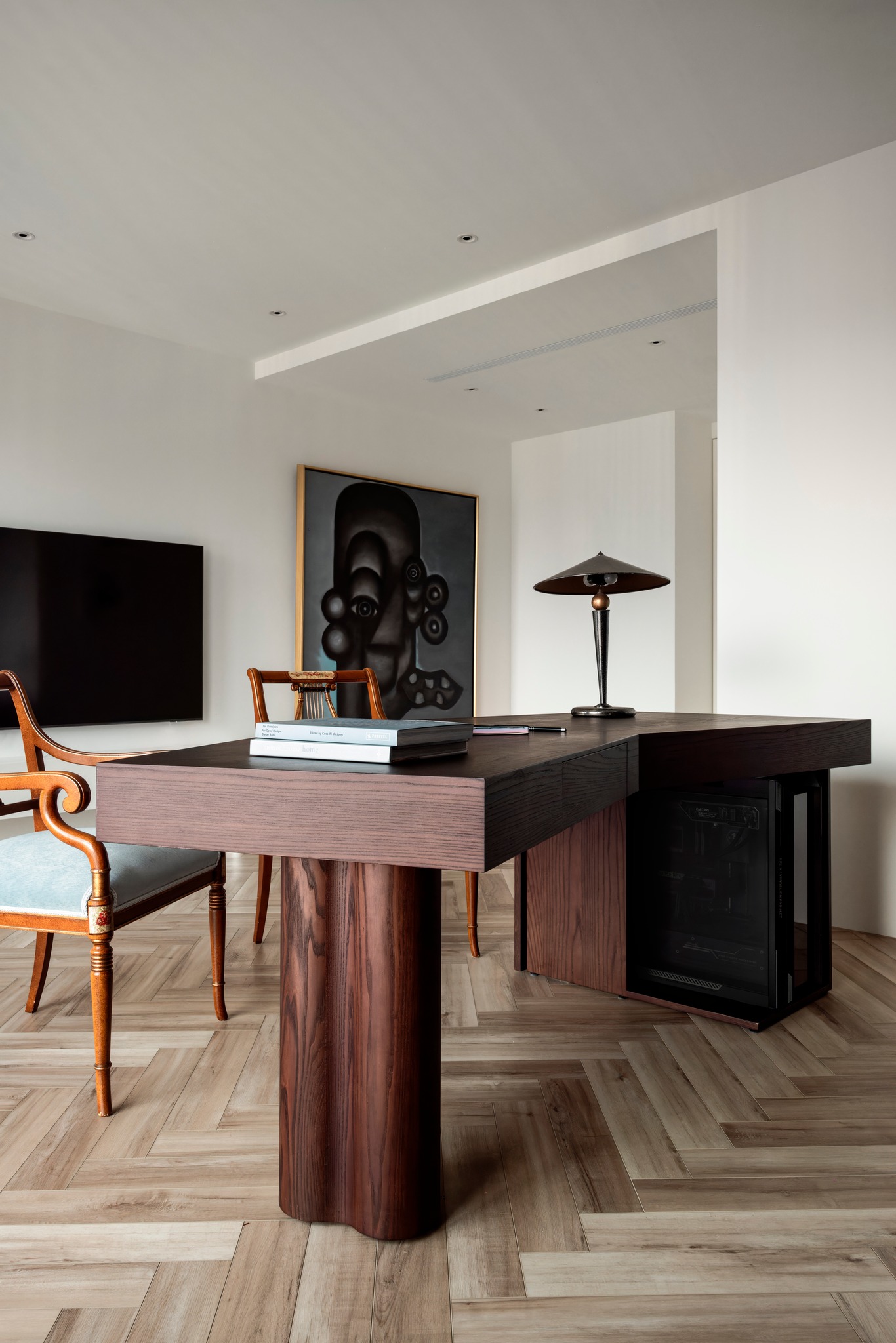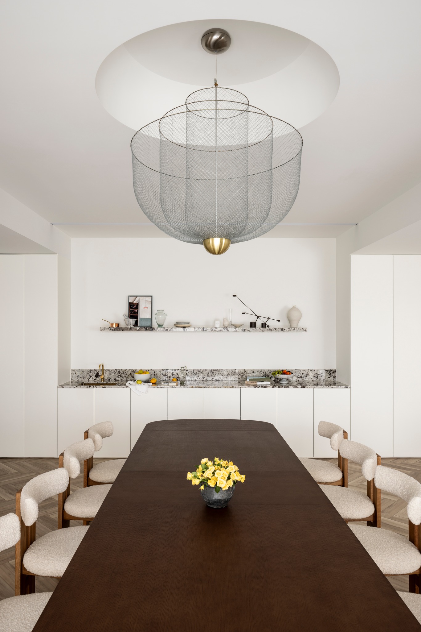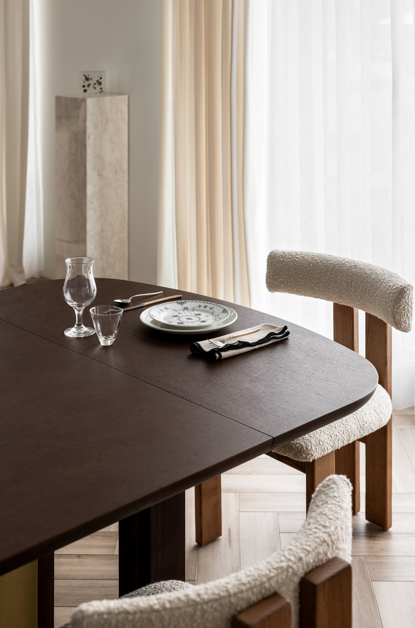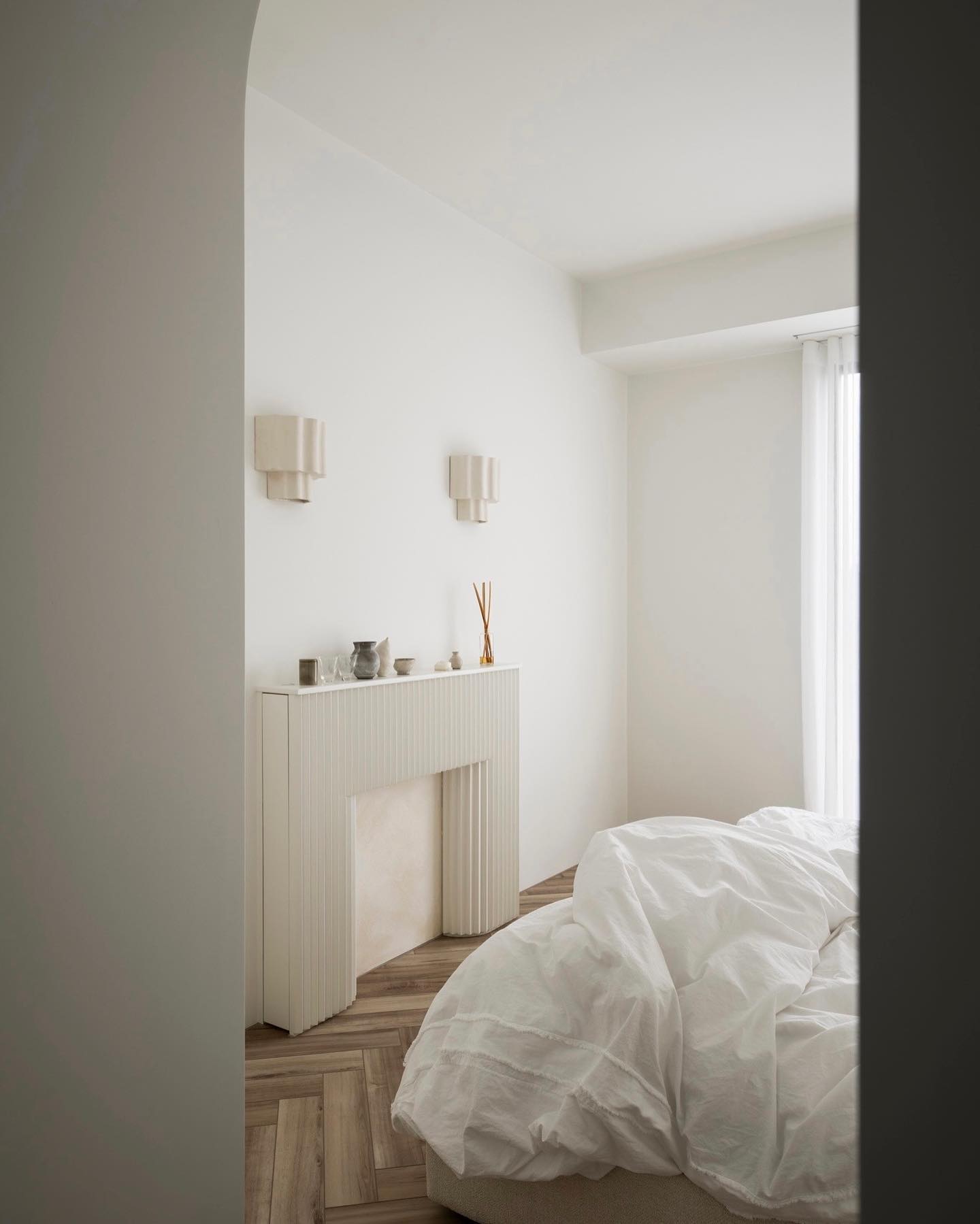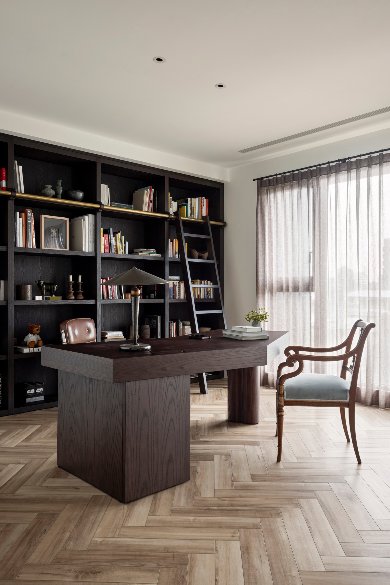 本期案例为新房装修项目,屋主是一名医生,喜爱偏法式风格,但又希望空间不拘泥于单一风格,能够在单一的本质中,享受带出多元的面貌。构建一个浪漫家园。 屋主诉求: 屋主对于房屋的规划,既要满足家居整体氛围优雅浪漫,其次又要兼具实用性需求。在与屋主深入沟通后了解到屋主喜欢法式的浪漫与温柔,原木的温润与自然,风格多变。希望在工作之余能有一个喜欢的氛围以供休憩。我们选择以混搭作为全屋设计方向,通过深浅进退的线条、充满个性的家具拣选,古典元素与现代美学之间的冲击与对比,构造满足屋主诉求的多元风格。满足风格的基础上保证储物空间。 我们以法式、原木、轻奢相搭配,根据业主的兴趣爱好和生活习惯,将空间的墙体进行拆改,通铺原木地板为业主打造出一个开放兼质感的气质之家。让屋主在忙碌一天回到家之后,可以卸下全身心的疲惫,从而与这个家融为一体,安稳宁静的世外桃源,则是心灵的栖息地。 户型图 1.客餐一体打造互联共通格局组合公区功能,封闭式厨房+吧台外置满足不同使用需求,补充厨房操作空间进一步完善洄游动线促进空间的连贯性。 2.独立书房增加电视,区别与传统书房的学习办公功能,更具休闲性。 3.大量设置通顶定制储物柜扩大家中储物功能。 4.阳台纳入客厅做整体规划,拓宽公共活动区设计面积,加之阳台的宽幅落地窗引入的大量光线,客厅更显通透宽敞; 玄关 玄关弧形门洞设计连接公区打破直线条硬朗感,增加视觉纵深丰富空间层次。柔美的拱型门洞搭配原木人字形地板,温润与柔美体现淋漓尽致。壁灯点缀点亮归家仪式感。墙面弧形镂空洞别出心裁,成为半密闭的过道空间的绝妙联动端口,突破秩序营造美感,在简单之上将空间拉回另一个时空。 #玄关#拱形门洞#地板#壁灯 客厅 客厅以白色为基调透露出松弛优雅的氛围,原木地板带来温润质感,大胆运用线条元素为客厅注入轻法式浪漫感,米色布艺沙发柔软舒适满足多人落座,以舒适的坐感诠释着对生活品质的追求,米色地毯置于原木地板之上,减少生活噪音提升舒适脚感,浅色系搭配使得整体空间在视觉上更加柔和纯粹。 #客厅#沙发#地毯#地板 一道弧形拱门引入客厅,为空间注入弧形柔美。大尺度客厅保证了视野的开阔,巨大落地窗进一步打开客厅通透的阀门,搭配纱帘调节光感。原木轻奢单人椅正对沙发,选用轻巧灵动的藤编工艺茶几,点缀朴素敦实的空间语境,高度的颜色对比制造空间焦点,让人忍不住将视线定格于此,中古风美感尽显。不同物质在空间内穿插,每一处都是居者的生活写照,空间线条不拖泥带水共同构筑出明亮有序的舒适空间。 #客厅#落地窗#单人椅#弧形#边几 去电视设计于客厅添置壁炉,墙面硬朗的石膏线搭配壁炉体现工艺与艺术比例美学的雅致。壁炉上方台面加宽做收纳、展示,不同材质与线条为空间加上法式滤镜,古典气息与现代感的环境巧妙结合,使得整个空间散发法式风格独有的慵懒氛围。 #客厅#壁炉 餐厅 基于大平层次设计,客餐一体布局摒弃传统固化风格,糅合了法式、复古、时尚元素,用现代简约的设计手法呈现法式的优雅,实木餐桌、艺术吊灯、大理石、羊羔毛等不同质感重合交叠,空间在和谐统一的基础,上更具视觉层次感,自然细腻的肌理让用餐场域显得娴静而优雅。 #餐厅#客餐一体#吊灯#餐桌 深色原木餐桌承载起一家人的温馨时刻,长形餐桌可容纳多人用餐既不显得拥挤也不至于太过疏远,无论中餐、西餐完全适配。米色餐椅在具备舒适坐垫的同时也有着坚实的支撑力。原木的经久耐用会与时光一起历久弥新。法式吊灯既能作为空间中的艺术装置又为用餐提供良好照明。 #餐厅#餐桌#餐椅#吊灯 纯白的餐边柜搭配水墨大理石台面,消弭空间单调,提升整个空间的品质感和奢华感,满足收纳的同时集展示于一体。搭配水槽设计,拥有简单备餐功能,便于餐前餐后清洁。上方做大理石置物架,增加空间层次感。 #餐厅#餐边柜#大理石#置物架 大平层设计使得公区功能连贯,视野开阔。客餐一体布局搭配吧台,满足屋主多样化需求。背景墙定制整面收纳柜,柜面极简设计去掉多余的装饰利用石膏线勾勒出满目的法式风情,让这个区域散发出优雅精致的设计,左侧将重点落于收纳设置柜体以收纳厨房用具。 #餐厅#吧台#收纳柜#客餐一体 厨房 厨房惟妙惟肖的展现了法式、原木的治愈,纯白+奶油色橱柜吊柜描摹质感。原木台面耐用易清洁。中部釉砖打破单调的同时增加空间质感。一字型布局的厨房动线充分考虑到空间狭小的问题,将厨房空间最大发挥。 #厨房#橱柜#吊柜#台面 书房 书房设计别具一格,原木为主基调,典雅古朴气质贯穿于此。整体空间简单而不失质感,增加电视设计,寓静于动,让书房不仅是简单的书房,让线条与纹理进行理性而有序的视觉交叠,于新中式中流露出写意之美,古朴而简雅。打造沉浸式阅读空间,兼具功能性、颜值、收纳,大落地窗也让整个书房更贴合自然,采光通透。 #书房#电视#落地窗 沿墙定制整面的通顶书墙,深色原木再加上满墙书香气的加持,有一种别样的高阶美,扶梯设计方便上下拿取书籍,书柜注重实用性和美观性的结合,拥有丰富的储物空间,开放格设计满足储存和展示的各种需求。书柜前设置--张宽大的胡桃木大书桌,满足办公、会客、学习,皮质座椅兼具舒适的同时增加轻奢质感。 