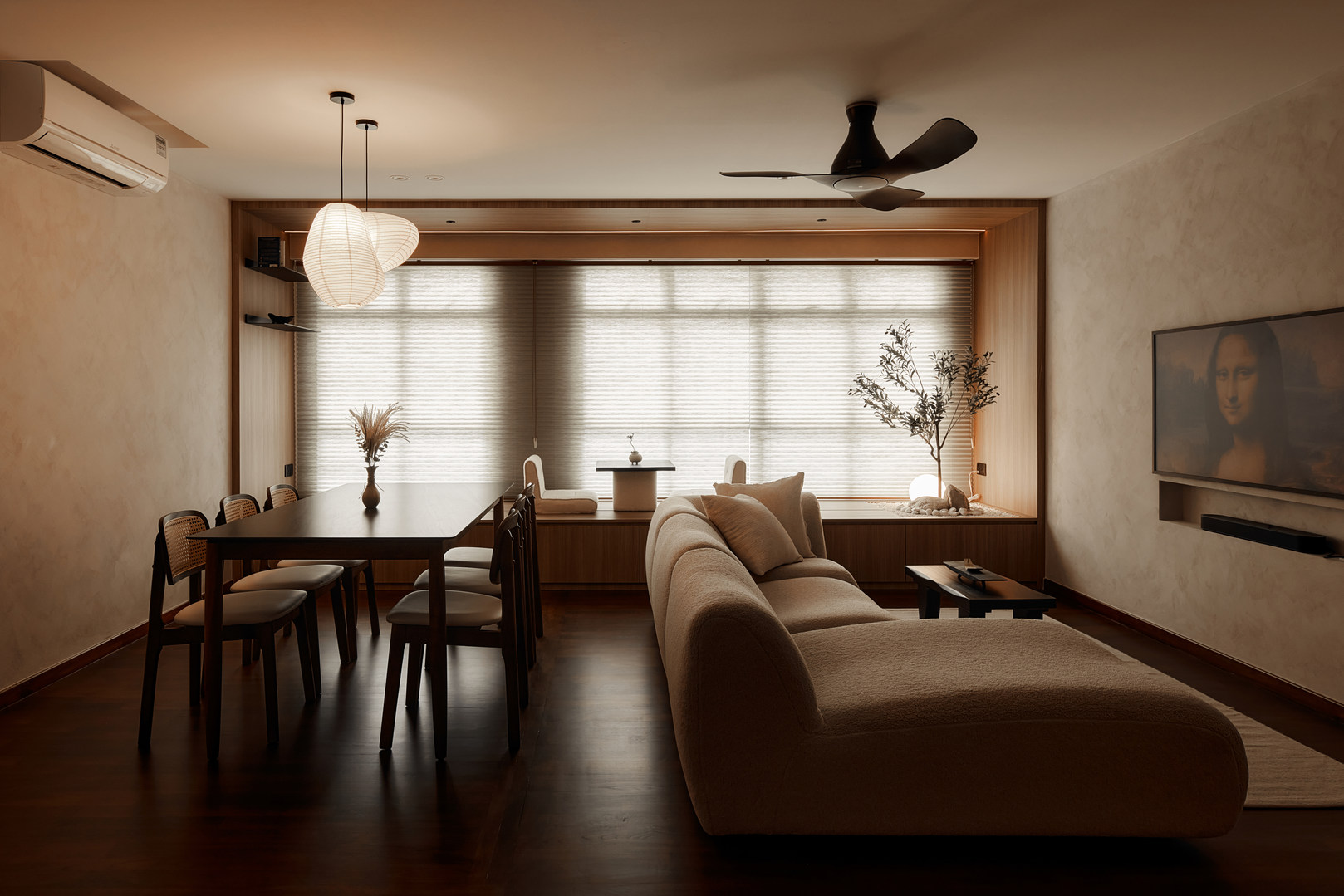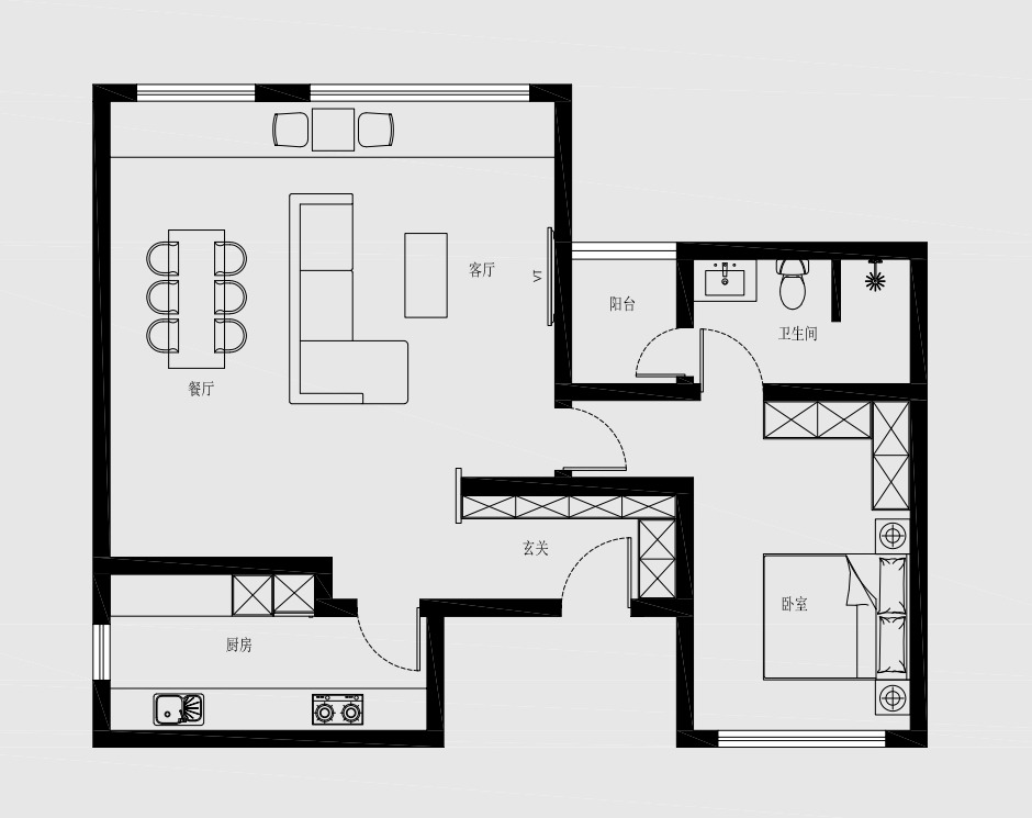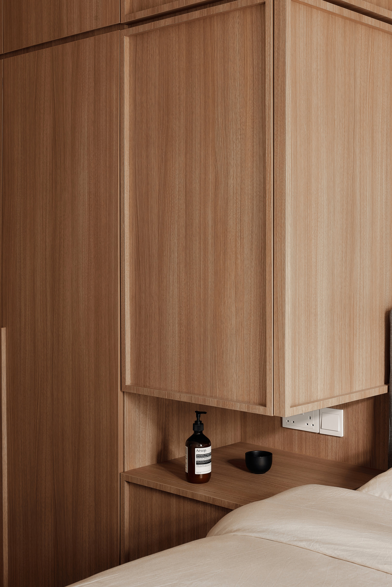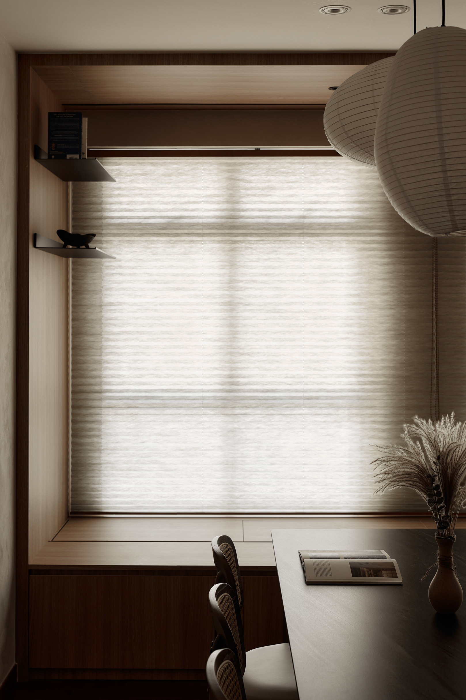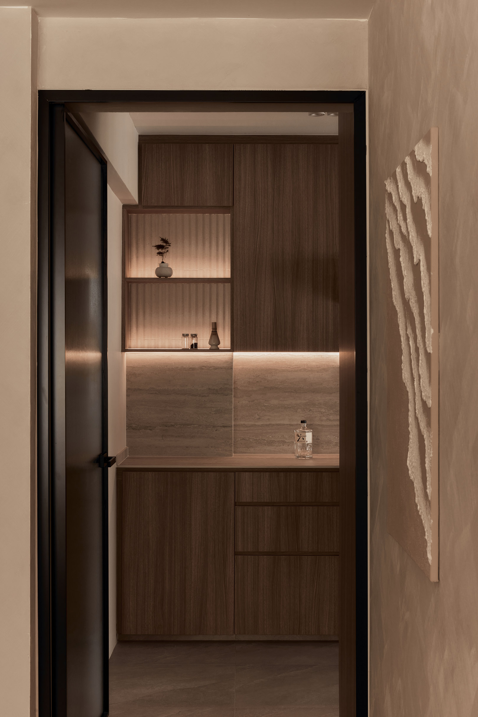 与浮躁的外界相比,现代原木散发的则是一种不骄矜的生活态度,简洁有力的线条与细腻的触感装饰温暖的烟火气息。屋主从洽谈之初就表明,他们喜欢简单、有温度,也有互动感的现代原木风格。对于这个独居之家而言,家的含义不仅仅是物质层面的栖息之地,更承载了空间中发生的各种生活形式和生活场景,本案没有采用浓烈的深色调或夸张的浮雕和图案去阐述法式风格,反而用了一种让人舒服的浅色调,添加了现代原木的元素,利用轴对称式的布局,凸出了空间的舒适自由,非常自然的体现现代原木的宁静与典雅。 我们致力于展现慵懒且富有深度的情感空间,首先在色彩上,以原木+白为主,其他辅色则根据屋主喜好和风格接洽程度挑选,其次将静动区进行划分,通过通透的空间实现松弛自由格调,建立趣味洄游动线,亦考虑房屋自身美学价值组合打造醇厚的经典空间。融入设计理念,将公区采用开放式设计,空间以现代原木展开 户型图 1.原始精装房结构没有做大量修改,而是通过软装来调控空间氛围,使得居住环境更加舒适整洁 2.设计师从独居的日常生活出发,打造出了更适合居住的现代风,在生活当中也能保持满满的格调。 3.客餐一体的布局使得整个会客区域处于同一空间,提高空间利用率的同时提升房屋整体感,优化生活动线。 4.封闭式厨房完美隔绝油烟带来通透居于餐厅后方生活动线最优,一字型设计便于操作使用率高 5.原客厅与阳台之间打通无界,结合原阳台空间打造一字型地台,打造茶室及学习区,完善空间功能; 6。入户正对面处,结合承重柱围绕打造体块,兼顾收纳功能与遮挡效果,入户视野更为私密 客厅 全屋通铺原木地板,整体以原木+白搭配大面积留白与光影交叠利用吊顶赋予空间整体感,搭配吊灯提前规划好筒灯位置相互配合,一字型大横厅布局扬长避短减少空间阻碍形成家的核心区域。墙面以艺术涂料为主丰富的肌理感避免视觉上的单调乏味给空间带来动态美丰富层次。 #客厅#地板#墙面#吊灯#筒灯 布艺沙发居中放置是舒适感的重要来源,同色系抱枕带来慵懒与闲适黑色原木茶几低矮造型不压层高将视角重心下移。室内绿植点缀既不过分柔软也不过分硬挺在柔软与坚硬中寻找一个平衡感给予居者身体最直观的感受。 #客厅#沙发#抱枕#茶几#绿植 客厅的采光朝向没有太大的优势为了保证扣紧的通透性将阳台纳入客厅扩大空间的使用面积。结合原阳台空间打造一字型地台,规划出茶室及学习区,完善空间功能。地台铺设原木地板墙面采用木饰面包裹既干净又舒适。上方安装筒灯丰盈光源模式。 #客厅#阳台#地台#地板#木饰面#筒灯 这是一个兼顾功能与美观的空间,小巧的沙发围绕茶几展开营造出温暖舒适的氛围感,白色百叶帘既能让阳光充足的洒入室内又能在需要的情况下保证整屋的私密性。墙面设置置物架补充收纳空间,绿植倚窗而生形成温馨艺术的空间感。 #客厅#沙发#茶几#百叶帘#绿植 餐厅 客餐一体的布局使得整个会客区域处于同一空间,提高空间利用率的同时提升房屋整体感,优化生活动线。客餐厅之间选择原木地板通铺而过无界限划分强调空间整体感,保证整体视野通透开阔的同时也让各个功能区互联贯通。 #餐厅#客餐一体#地板#插花 长形餐桌轻松容纳多人用餐原木材质经久耐用配套餐椅靠背处采用藤编设计,于契合坐下后的腰背尺寸定制柔软坐垫将质感于舒适相结合。顶部白色灯笼吊灯让空间更有格调点亮温馨用餐时刻 #餐厅#餐桌#餐椅#吊灯 厨房 封闭式厨房利用黑框玻璃门让空间视感更为通透开阔的同时有效隔绝油烟,厨房做双一字型结构兼顾收纳与美观,地面铺设地砖更符合厨房使用调性干净易清洁。在经典橱柜+地柜的基础上融入开放格设计满足不同收纳需求让日常使用更加便利,内部嵌入灯带更添层次感。 #厨房#地柜#吊柜#开放格#灯带 定制橱柜与灶台整体选择统一材质,浅木色搭配自然木头纹理气质温润和缓。于橱柜嵌入冰箱等大型厨电规整空间让收纳更有序。双灶台设计容纳多人同时备餐,无火灶台也更符合现代家居需求。墙面定制置物架收纳餐厨用品,操作动线清晰流畅。 #厨房#橱柜#操作动线 卧室 空间布局重整之后整体的动静划分更为明确,以玄关为界向北为公共生活区后方则为居者的卧室区域。主卧通铺原木地板减少生活噪音的同时冬暖夏凉,墙面安装壁灯配合筒灯、吊灯多种灯光模式供居者选择。 #主卧#地板#吊灯#壁灯#筒灯 主卧整体风格温柔又有质感给人满满的治愈感,带来舒适完美的放松空间高度统一的色调和谐融洽。主卧套房模式加入独立卫生间更方便居者日常使用完善生活动线,安装挂壁式空调减少不必要的空间占用让休憩空间更具舒适。 #主卧#卧室#卫生间#无主灯#原木风 双人床居于卧室中央,干净简单的床品却蕴含着舒适于方式为居者构筑沉浸式睡眠体验,床头柜于衣柜一体式设计新颖实用,加入筒灯完善细节。极简的造型让衣柜隐形如墙体,通顶设计最大程度提升储物空间,无把手设计自带轻盈视感减缓视觉上的压抑感。 #主卧#卧室#床头柜#衣柜 卫生间 卫生间多采用玻璃设计让卫生间与主卧之间隔而不断,视觉上更显通透轻盈。通铺大理石纹地砖呈现出清透简单的质感,悬浮式洗手台减少卫生死角方便日常清洁,大理石材质与整体空间更为适配,墙面设置置物架收纳洗漱用品。 #卫生