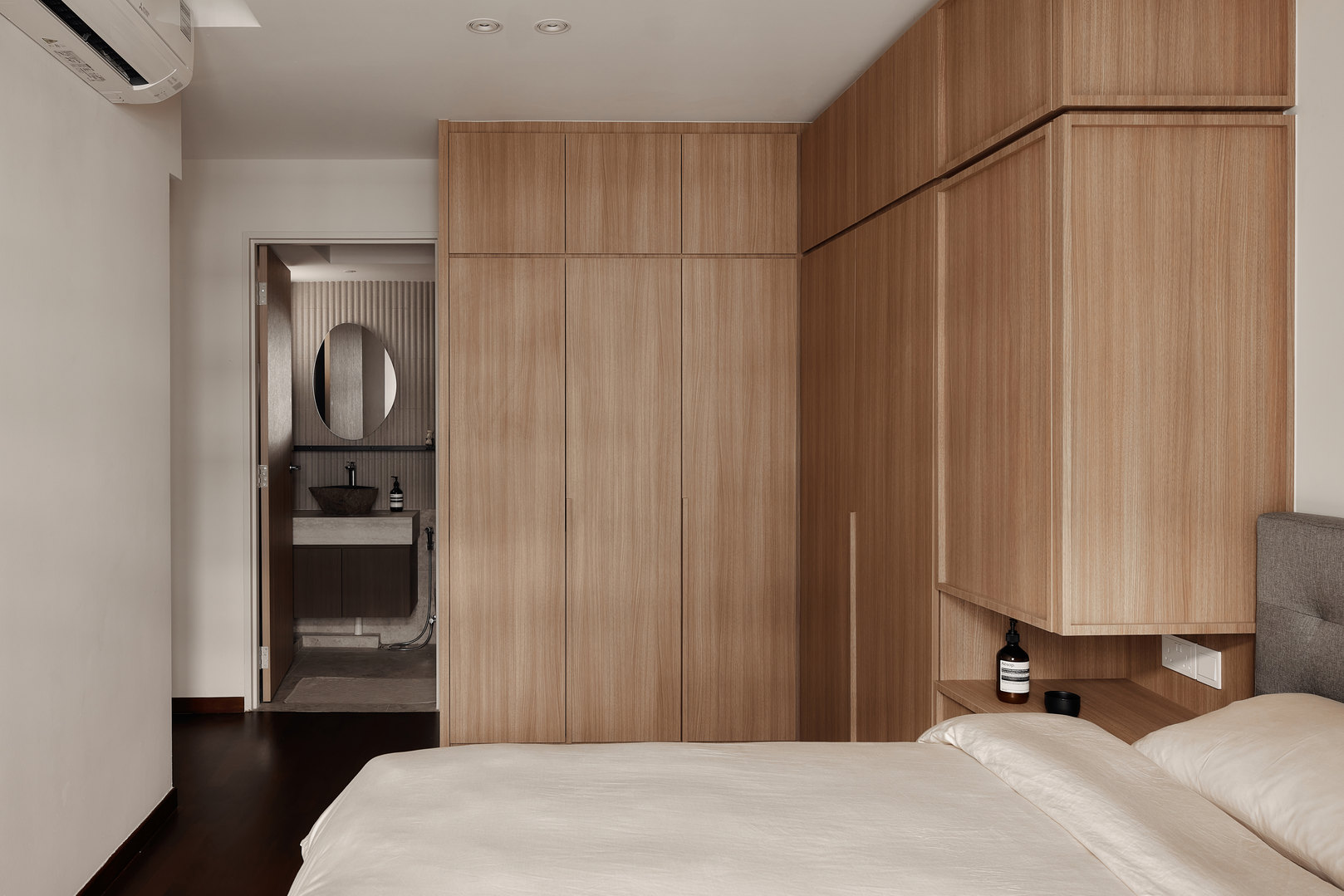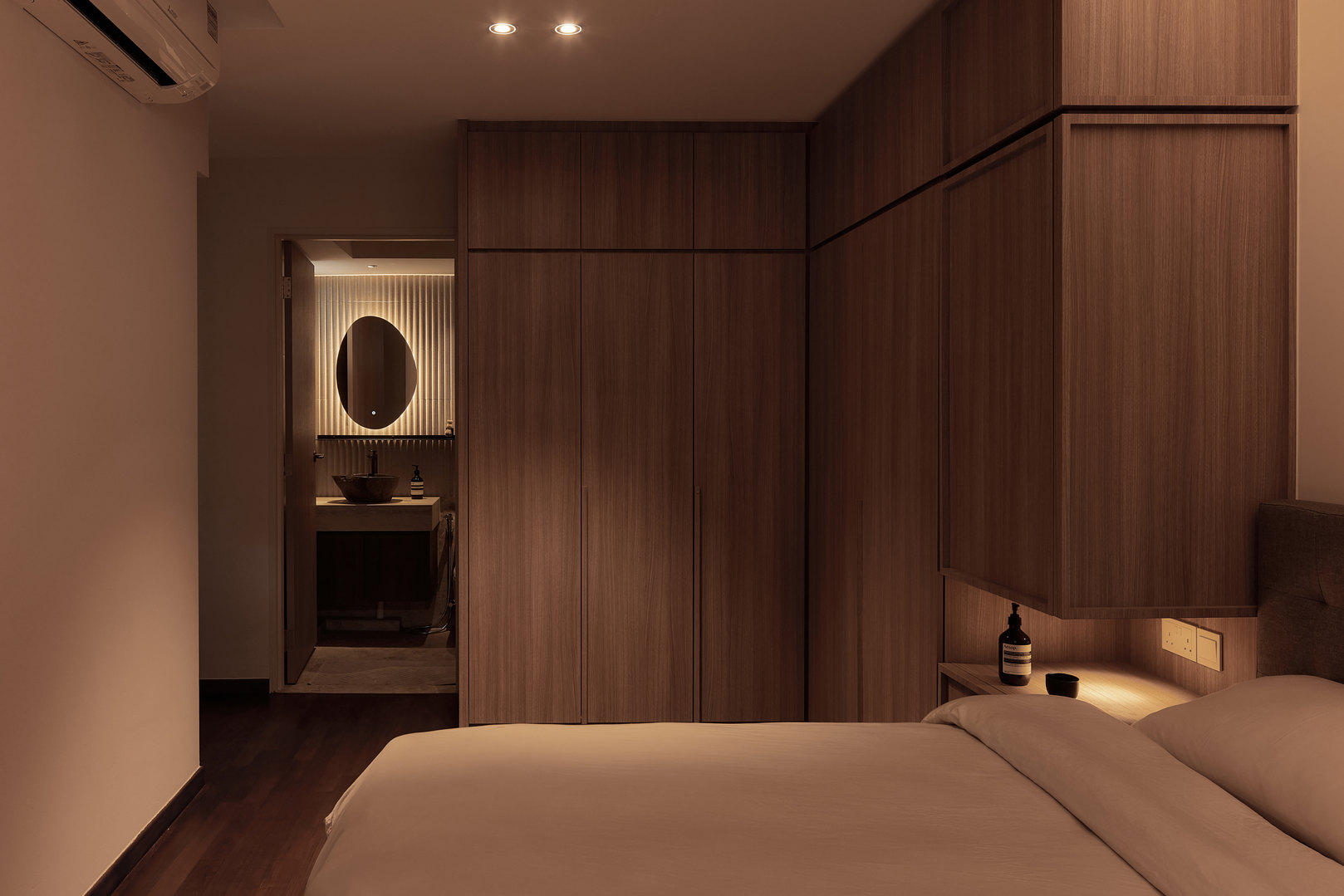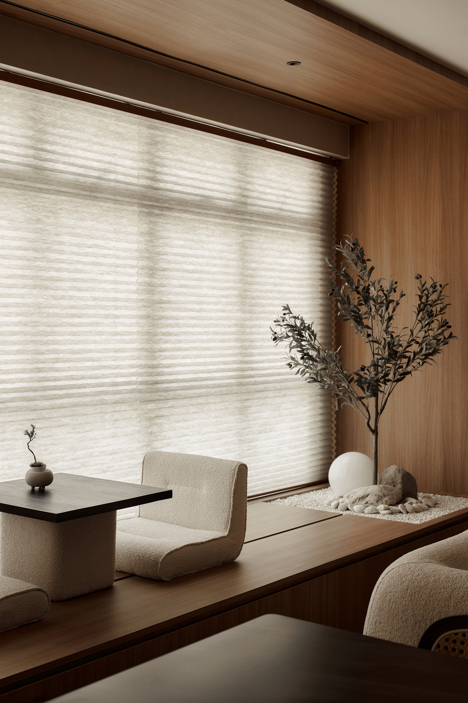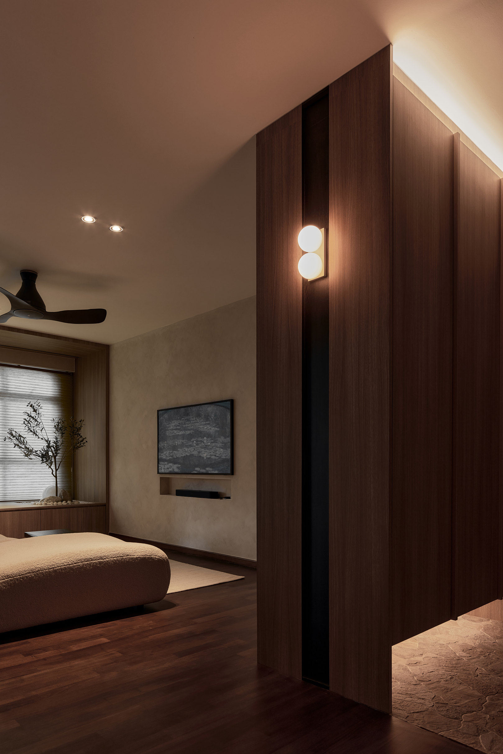 与浮躁的外界相比,现代原木散发的则是一种不骄矜的生活态度,简洁有力的线条与细腻的触感装饰温暖的烟火气息。屋主从洽谈之初就表明,他们喜欢简单、有温度,也有互动感的现代原木风格。对于这个独居之家而言,家的含义不仅仅是物质层面的栖息之地,更承载了空间中发生的各种生活形式和生活场景,本案没有采用浓烈的深色调或夸张的浮雕和图案去阐述法式风格,反而用了一种让人舒服的浅色调,添加了现代原木的元素,利用轴对称式的布局,凸出了空间的舒适自由,非常自然的体现现代原木的宁静与典雅。 我们致力于展现慵懒且富有深度的情感空间,首先在色彩上,以原木+白为主,其他辅色则根据屋主喜好和风格接洽程度挑选,其次将静动区进行划分,通过通透的空间实现松弛自由格调,建立趣味洄游动线,亦考虑房屋自身美学价值组合打造醇厚的经典空间。融入设计理念,将公区采用开放式设计,空间以现代原木展开 户型图 1.原始精装房结构没有做大量修改,而是通过软装来调控空间氛围,使得居住环境更加舒适整洁 2.设计师从独居的日常生活出发,打造出了更适合居住的现代风,在生活当中也能保持满满的格调。 3.客餐一体的布局使得整个会客区域处于同一空间,提高空间利用率的同时提升房屋整体感,优化生活动线。 4.封闭式厨房完美隔绝油烟带来通透居于餐厅后方生活动线最优,一字型设计便于操作使用率高 5.原客厅与阳台之间打通无界,结合原阳台空间打造一字型地台,打造茶室及学习区,完善空间功能; 6。入户正对面处,结合承重柱围绕打造体块,兼顾收纳功能与遮挡效果,入户视野更为私密 客厅 全屋通铺原木地板,整体以原木+白搭配大面积留白与光影交叠利用吊顶赋予空间整体感,搭配吊灯提前规划好筒灯位置相互配合,一字型大横厅布局扬长避短减少空间阻碍形成家的核心区域。墙面以艺术涂料为主丰富的肌理感避免视觉上的单调乏味给空间带来动态美丰富层次。 #客厅#地板#墙面#吊灯#筒灯 布艺沙发居中放置是舒适感的重要来源,同色系抱枕带来慵懒与闲适黑色原木茶几低矮造型不压层高将视角重心下移。室内绿植点缀既不过分柔软也不过分硬挺在柔软与坚硬中寻找一个平衡感给予居者身体最直观的感受。 #客厅#沙发#抱枕#茶几#绿植 客厅的采光朝向没有太大的优势为了保证扣紧的通透性将阳台纳入客厅扩大空间的使用面积。结合原阳台空间打造一字型地台,规划出茶室及学习区,完善空间功能。地台铺设原木地板墙面采用木饰面包裹既干净又舒适。上方安装筒灯丰盈光源模式。 #客厅#阳台#地台#地板#木饰面#筒灯 这是一个兼顾功能与美观的空间,小巧的沙发围绕茶几展开营造出温暖舒适的氛围感,白色百叶帘既能让阳光充足的洒入室内又能在需要的情况下保证整屋的私密性。墙面设置置物架补充收纳空间,绿植倚窗而生形成温馨艺术的空间感。 #客厅#沙发#茶几#百叶帘#绿植 餐厅 客餐一体的布局使得整个会客区域处于同一空间,提高空间利用率的同时提升房屋整体感,优化生活动线。客餐厅之间选择原木地板通铺而过无界限划分强调空间整体感,保证整体视野通透开阔的同时也让各个功能区互联贯通。 #餐厅#客餐一体#地板#插花 长形餐桌轻松容纳多人用餐原木材质经久耐用配套餐椅靠背处采用藤编设计,于契合坐下后的腰背尺寸定制柔软坐垫将质感于舒适相结合。顶部白色灯笼吊灯让空间更有格调点亮温馨用餐时刻 #餐厅#餐桌#餐椅#吊灯 厨房 封闭式厨房利用黑框玻璃门让空间视感更为通透开阔的同时有效隔绝油烟,厨房做双一字型结构兼顾收纳与美观,地面铺设地砖更符合厨房使用调性干净易清洁。在经典橱柜+地柜的基础上融入开放格设计满足不同收纳需求让日常使用更加便利,内部嵌入灯带更添层次感。 #厨房#地柜#吊柜#开放格#灯带 定制橱柜与灶台整体选择统一材质,浅木色搭配自然木头纹理气质温润和缓。于橱柜嵌入冰箱等大型厨电规整空间让收纳更有序。双灶台设计容纳多人同时备餐,无火灶台也更符合现代家居需求。墙面定制置物架收纳餐厨用品,操作动线清晰流畅。 #厨房#橱柜#操作动线 卧室 空间布局重整之后整体的动静划分更为明确,以玄关为界向北为公共生活区后方则为居者的卧室区域。主卧通铺原木地板减少生活噪音的同时冬暖夏凉,墙面安装壁灯配合筒灯、吊灯多种灯光模式供居者选择。 #主卧#地板#吊灯#壁灯#筒灯 主卧整体风格温柔又有质感给人满满的治愈感,带来舒适完美的放松空间高度统一的色调和谐融洽。主卧套房模式加入独立卫生间更方便居者日常使用完善生活动线,安装挂壁式空调减少不必要的空间占用让休憩空间更具舒适。 #主卧#卧室#卫生间#无主灯#原木风 双人床居于卧室中央,干净简单的床品却蕴含着舒适于方式为居者构筑沉浸式睡眠体验,床头柜于衣柜一体式设计新颖实用,加入筒灯完善细节。极简的造型让衣柜隐形如墙体,通顶设计最大程度提升储物空间,无把手设计自带轻盈视感减缓视觉上的压抑感。 #主卧#卧室#床头柜#衣柜 卫生间 卫生间多采用玻璃设计让卫生间与主卧之间隔而不断,视觉上更显通透轻盈。通铺大理石纹地砖呈现出清透简单的质感,悬浮式洗手台减少卫生死角方便日常清洁,大理石材质与整体空间更为适配,墙面设置置物架收纳洗漱用品。 #卫生