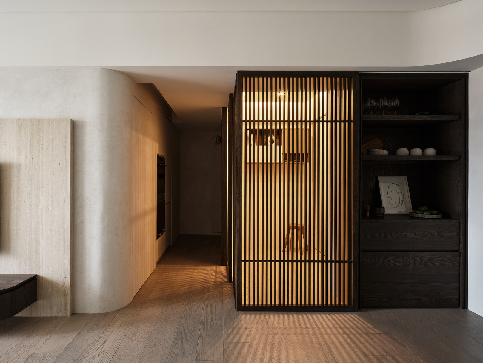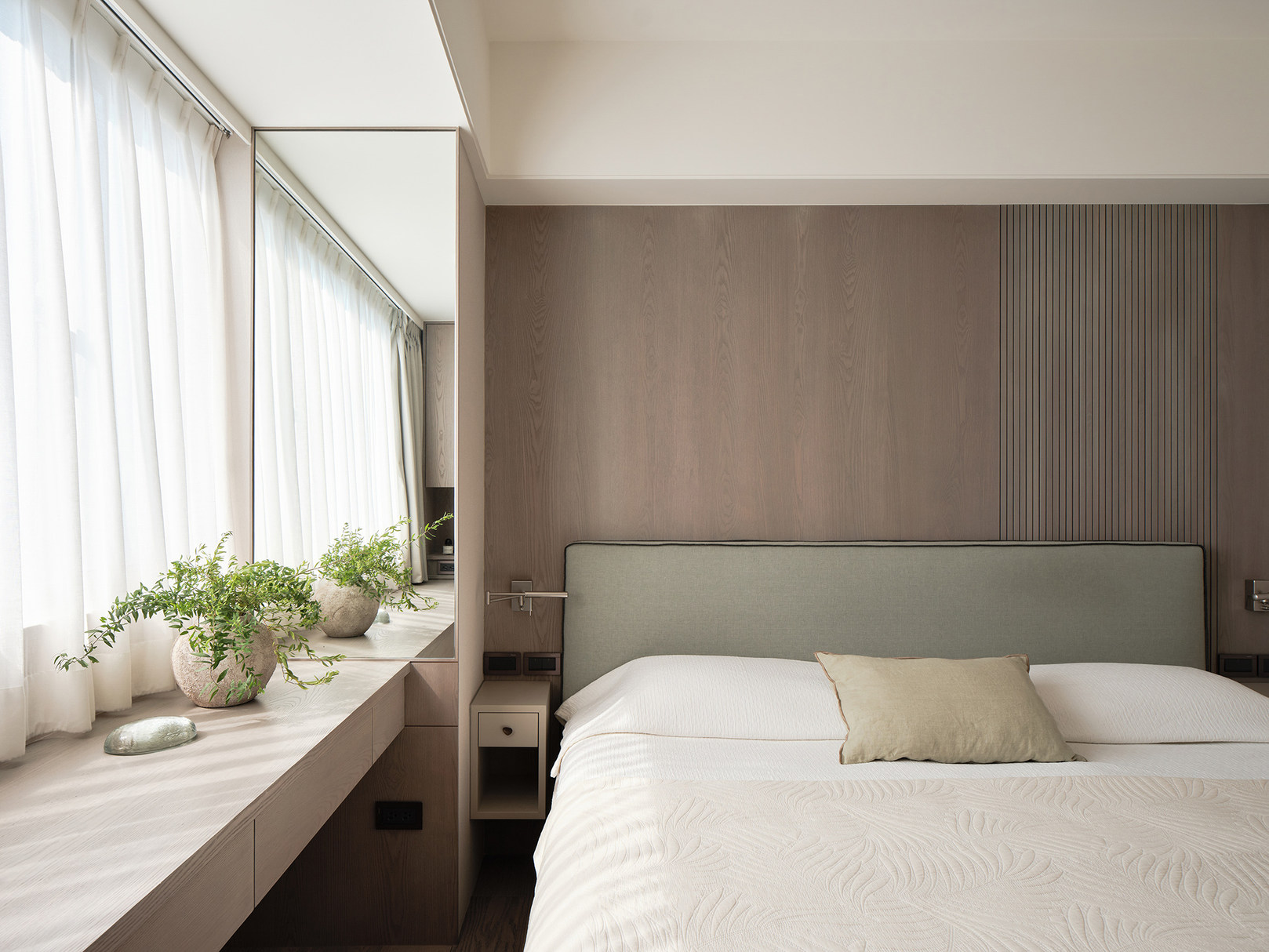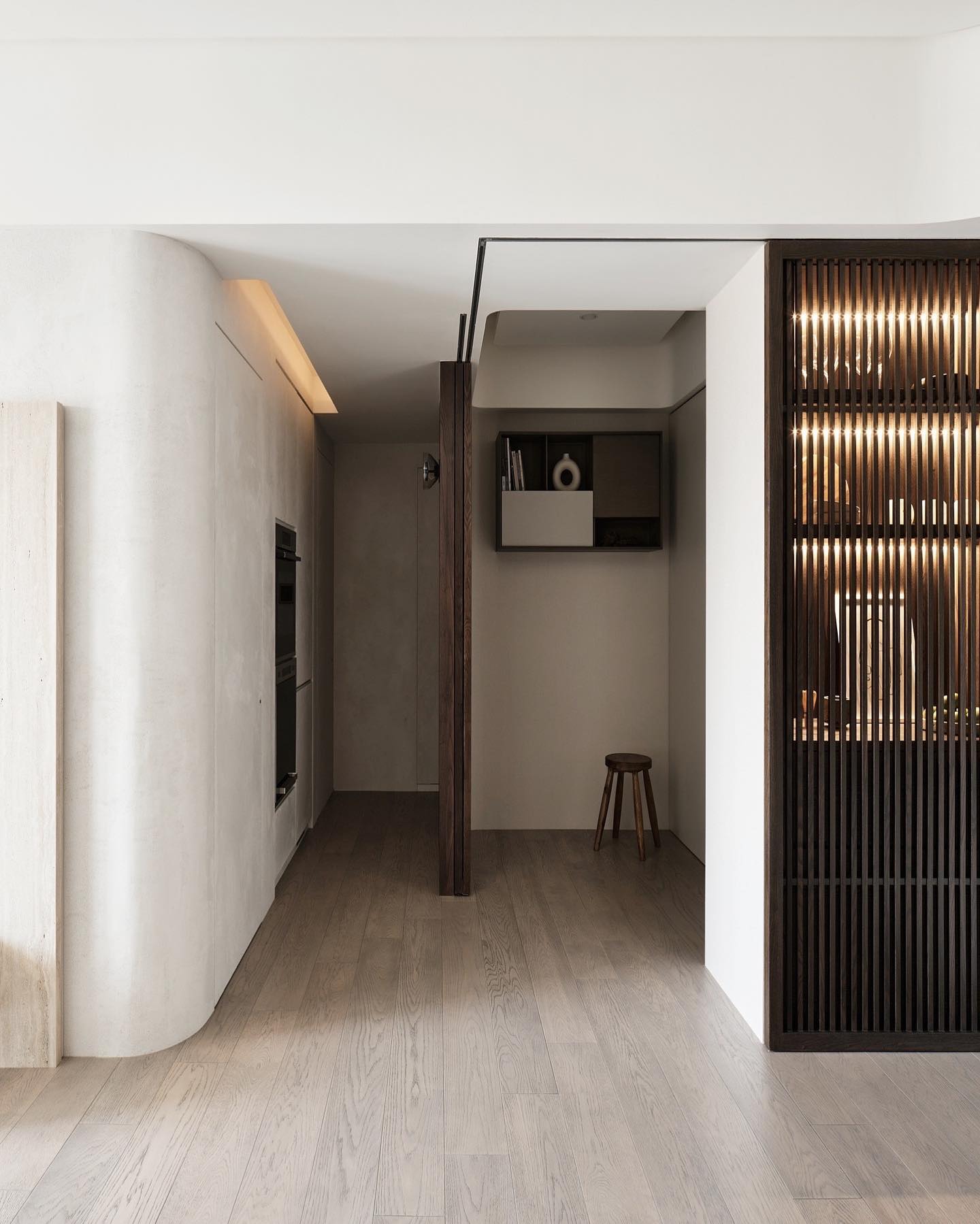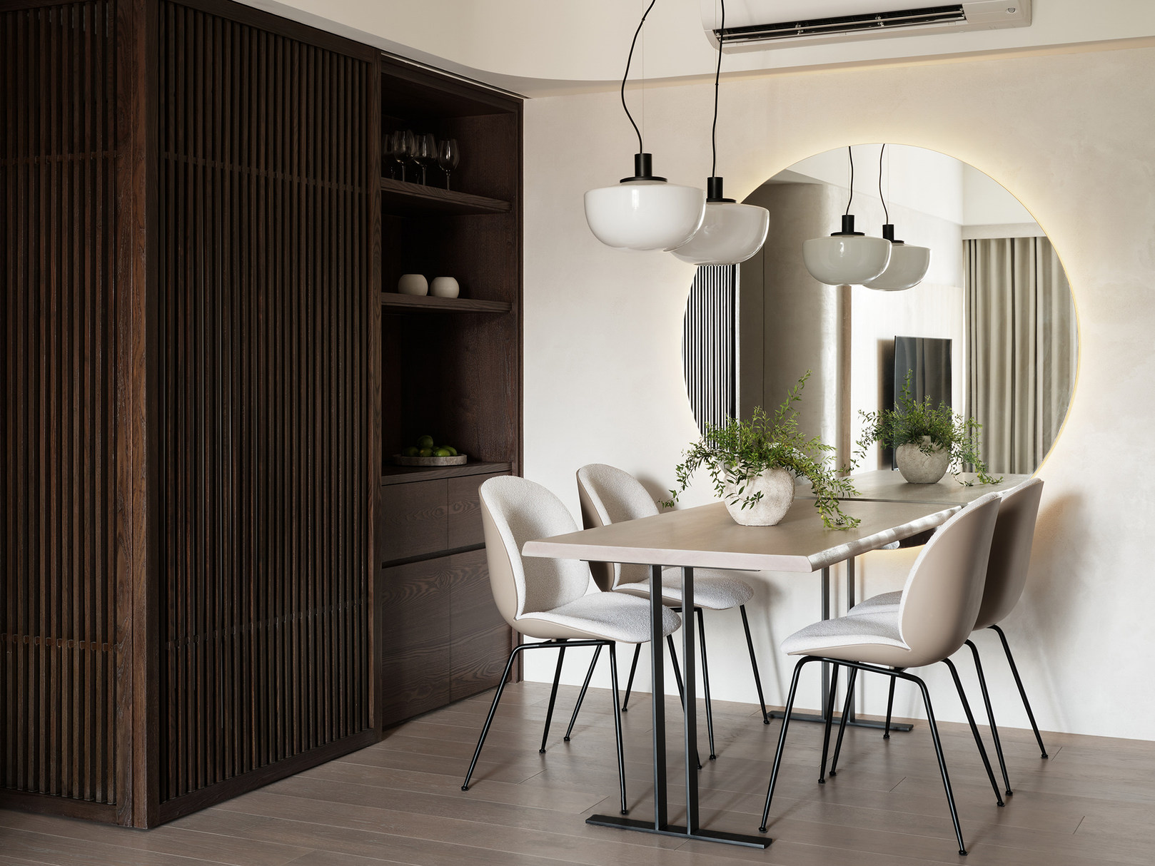 本次案例的屋主偏爱现代简约风,同时追求视觉上的质感,希望呈现一个简约不失高级感的效果。在与屋主的沟通过程中,发现屋主对于镜子的使用需求极高,在了解到其不排斥镜子作为装饰元素的情况下,我们选择在设计的过程中增添“镜”元素用以点缀,例如卧室的飘台以及餐厅的墙壁,通过镜面与自然采光的协调搭配,达成锦上添花的观感效果,时尚与清爽感兼具 户型图 ①传统两室两厅一厨一卫,南北朝向,采光条件好。 ②房型方正,动线流畅,分区有致 ③在厨房与餐厅之间的区域,通过滑轨与隔断的设计安装,打造出一个灵活转换封闭状态的储物间 玄关 客厅 顺着玄关往前走,便来到客厅的区域,是一个面积开阔的长方形空间。墙面选择纯色粉刷,加上中间区域无吊顶的设计,拉高纵向层高视野,使空间呈现清爽又开阔的美感。 #客厅#客厅设计#无主灯设计#地板 一张多人座的L型沙发靠墙放置,皮质面料搭配记忆棉软垫,尽显舒适。亚麻杏偏灰调的选色,沉稳低调有质感。再搭配地面上浅棕色系的波纹地毯,搭建视觉上的层次美。墙壁上悬挂一幅草木系绿植装饰画,增添鲜活力 #客厅#沙发#地毯#地板#装饰画 沙发对面则是电视墙的区域,在原有墙面基础上局部叠加了一块与墙面等比例缩小的长方形木纹板,增添墙面层次感。电视悬挂其上,下方设计了一个悬空式的电视柜,核桃木的纹路彰显高级质感,三个内嵌的抽屉提供物品收纳的空间 #客厅#电视背景墙#电视#电视柜#收纳 餐厅 餐厅位于玄关的右手边,靠着一侧的墙壁放置了一张长方形的餐桌,白色的大理石桌面光泽有质感,两侧各搭配了两个同色系靠背餐椅。墙壁上方设计悬挂上一个圆形的镜子,与客厅的视野相互通,增添不同功能区之间的互动性,整体视野呈现上也更加灵活 #餐厅#餐桌#餐椅#大理石#吊灯 顶上安置了两个悬挂式的吊灯,白色的亚克力灯罩充满现代时尚风味。吊顶内侧安置了一个空调,方便餐厅区域有效调温的需求 #餐厅#餐桌#吊灯#绿植 储物间 餐厅与厨房之间有一个长方形的开放式空间,我们通过设计可移动式隔断滑轨,使这块区域可以在封闭与开放的状态转换,做成一个灵活的储物间 #储物间#吊柜#地板 如图所示,呈现的是储物间将隔断滑轨进行连接后的封闭式状态。我们在隔断的选择上采用类似百叶窗的样式,使区域在封闭的同时保证视野上通透清晰,让空间不会过于密闭,影响采光。墙角处更设计了一个具有收纳储物功能的餐厨柜,很是实用 #储物间#餐厨柜 深棕色的花纹木板墙面上搭配了一盏充斥着金属元素的壁灯,在暖黄色灯光的照耀下增添房屋氛围感。 #墙壁设计#壁灯 厨房 厨房是一个长方形的空间,采光极佳。沿着两个相邻的墙面,呈现L型的橱柜设计。棕色系的木质面板选材呈现更有质感的视觉效果,油烟机、烤箱、洗碗机等家电镶嵌其中,保留干净清爽的视觉外观。洗手台选择内嵌式的台盆,方便排水与打理,避免水渍的积攒影响日常的清洁 #厨房 卧室 卧室的空间十分充裕,朝南的方向享有极佳的采光条件。一张加大版的双人床靠墙放置在中央,床头的皮垫设计为屋主提供舒适的休闲条件。在墙面粉刷上以纯白为主色,另外在局部墙面设计上选择原木条纹元素的混搭,使空间的装饰元素更加丰富多元 #卧室#床头背景墙#采光#窗帘 床的一侧搭配了象牙白木材质的床头柜,精巧玲珑有质感,上方还悬挂着一个可移动式的床头灯。靠着窗台的区域,设计了一个长方形的桌台,这张多功能桌台享有极好的采光,同时既可以放置绿植装饰空间,还能满足日常的办公、梳妆需求 #卧室#飘台设计#飘窗#床头柜#灯 卫生间 卫生间延续现代简约风格,整体色彩上偏浅色系居多。安装的镜柜提供收纳洗漱用品的空间,有助于保持台面的清爽整洁。洗手台选择独立式莲蓬型设计,搭配一个长形的水龙头,复古的款式更显经典。下方搭配一个深色系的木质橱柜,在简约的氛围中增添高级质感 #卫生间#镜柜#墙面#洗手台 |