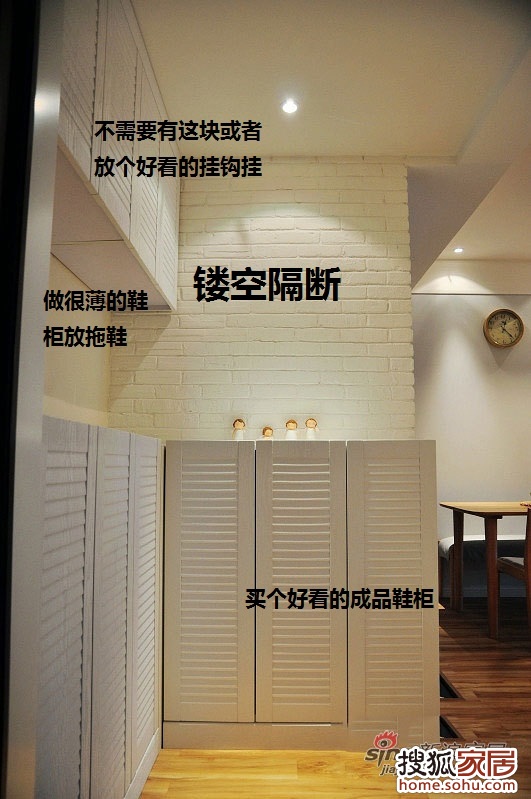 缺点:1、厨房和卫生间窗户对的是楼的排风通道,距离北面有一定距离,光线比较暗,尤其是厨房,窗户对着的是排烟道的对面墙,白天也需要开灯。2、整个房间的储物只能通过打柜子等实现,没有多余的空间储物。3、大门正对电梯,又正对客厅阳台,据说风水不好,私密性也不好。4、空调外机要全部放在阳台上,占据可怜的小小阳台空间,还减少通透性,也不美观。 想法:1、把进门的隔断打掉,设计一个可以透光的玄关,在储物和美观方面实现双得;正对门的镂空玄关下的鞋柜可以买一个造型漂亮的成品鞋柜,专门放外出穿的鞋,还有个设想就是连着玄关的造型旁边墙上做一个很薄的小鞋柜,专门放拖鞋,这样既可以增加放鞋的空间,也可以把内外穿的鞋分开。位置关系如下